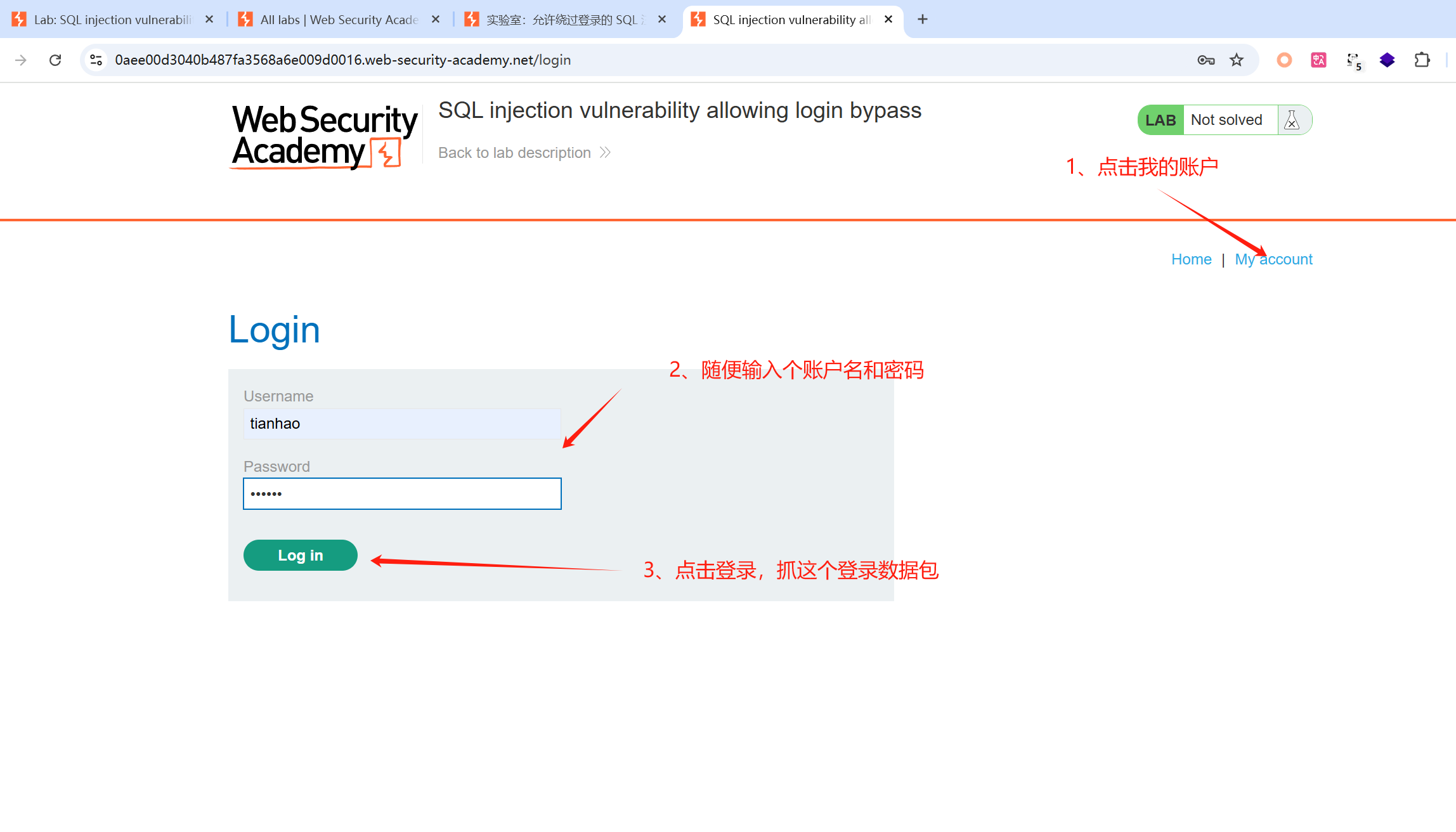 1、我们开启靶场后,直接点击我的账户页面,进行登录: