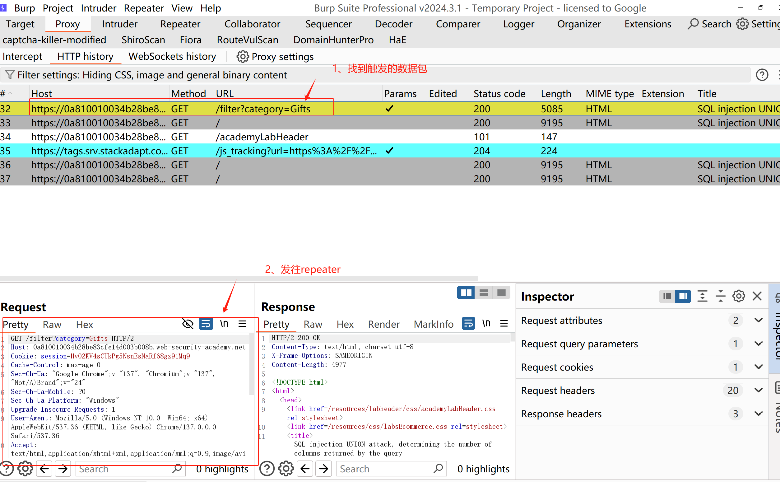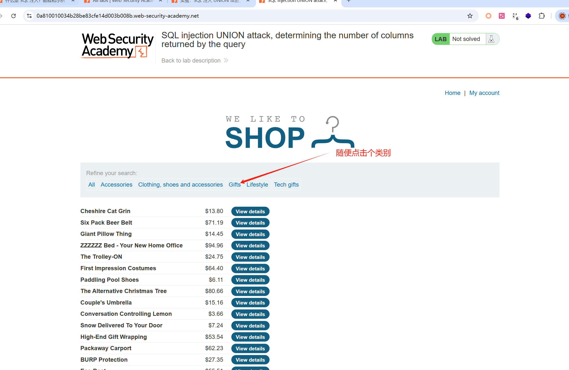 提示:1、在产品类别筛选器中包含一个 SQL 注入漏洞