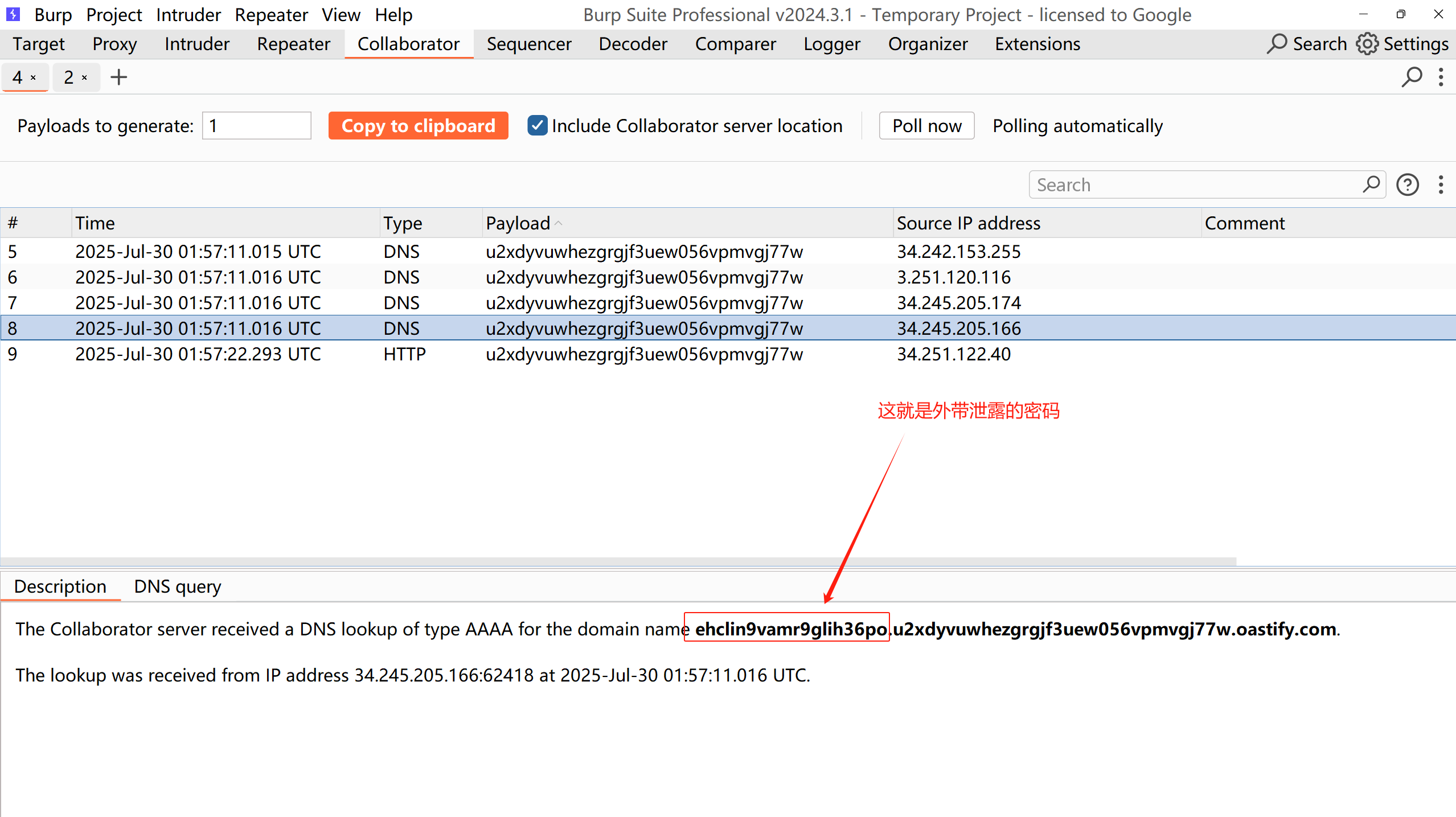 3、再去查看Burp的Collaborator界面看到有一次DNS或HTTP请求,证明外带成功,目标存在此类高危漏洞,而且暴露出了密码数据
