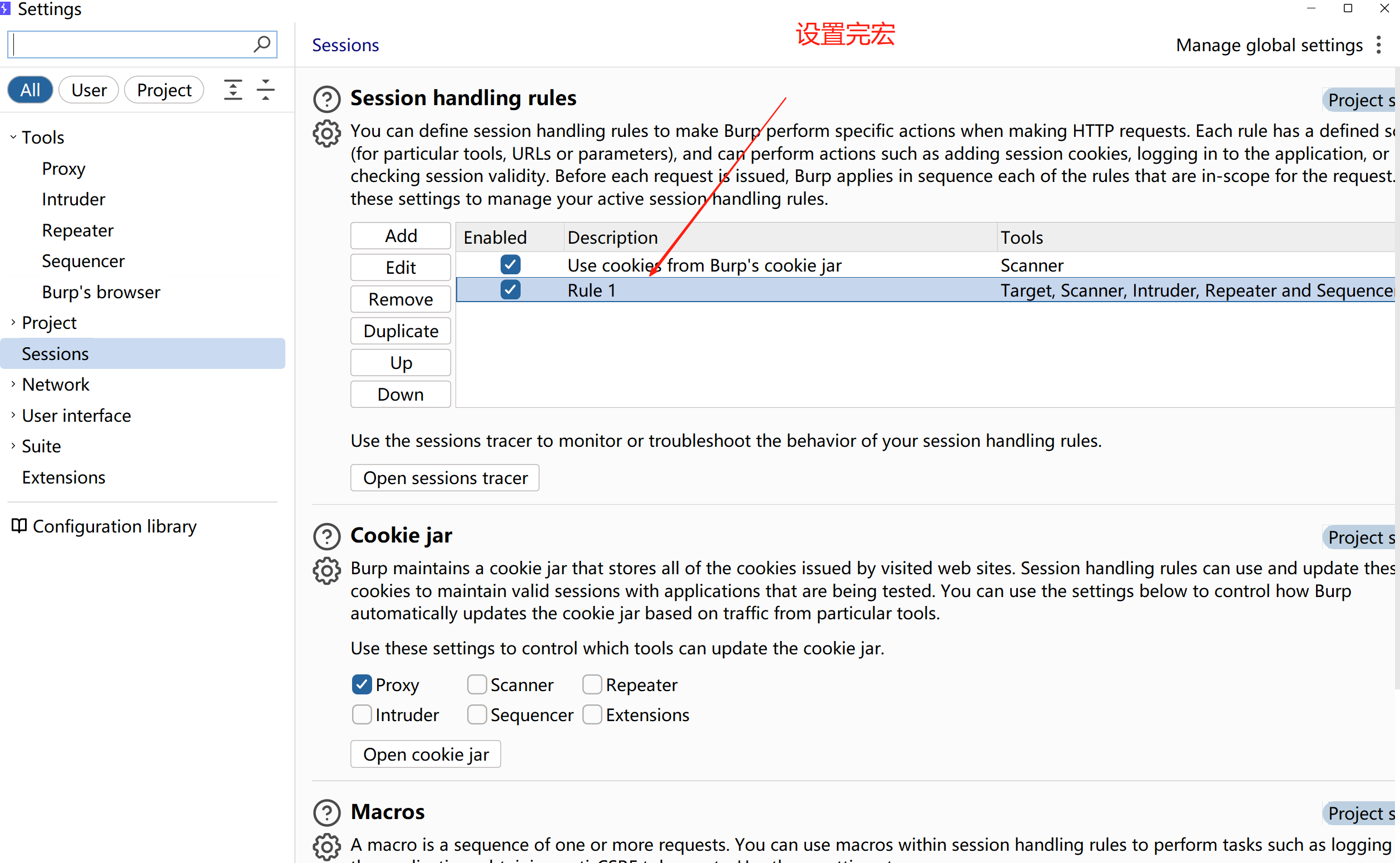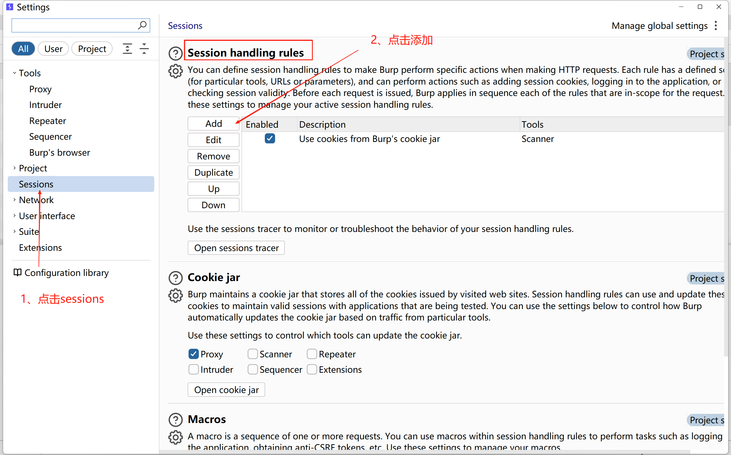 2、点击sessions,然后去Session handling rules下边,点击add
