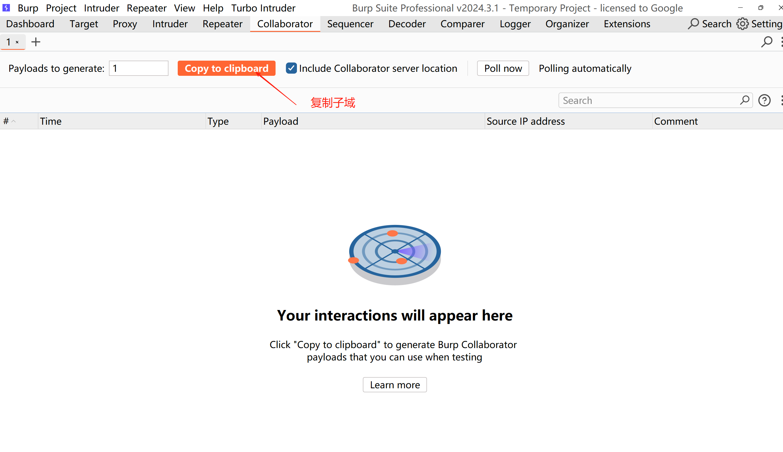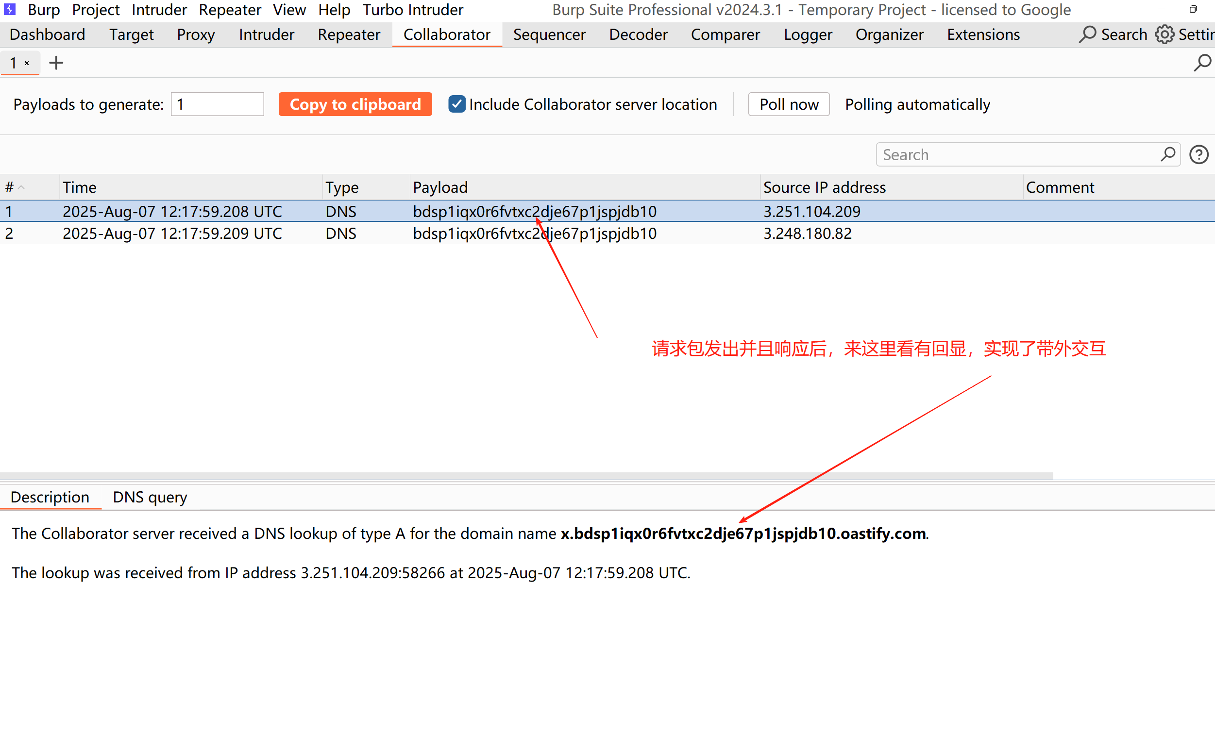 3、发送了数据包并且响应后,我们去burp看下有回显没,触发与外部域的带外交互