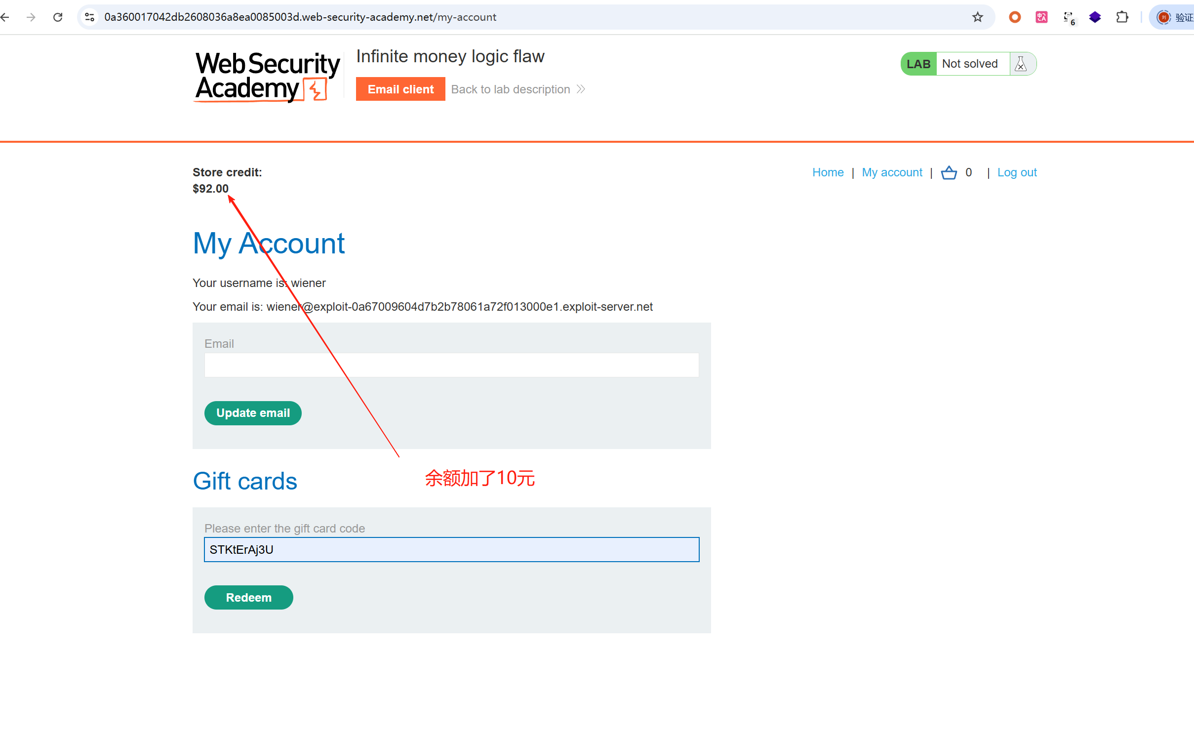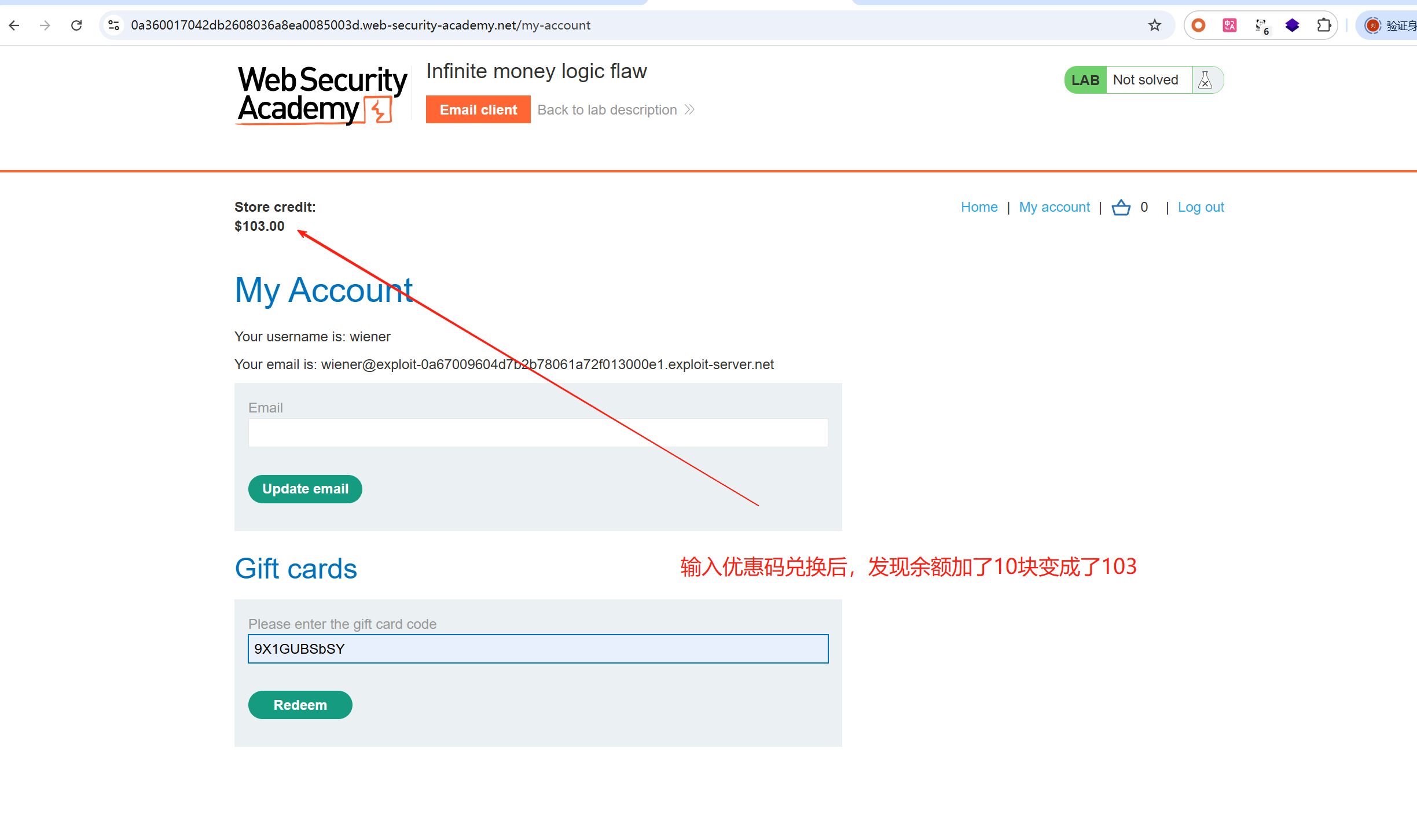输入优惠码兑换后,发现余额加了10块变成了103