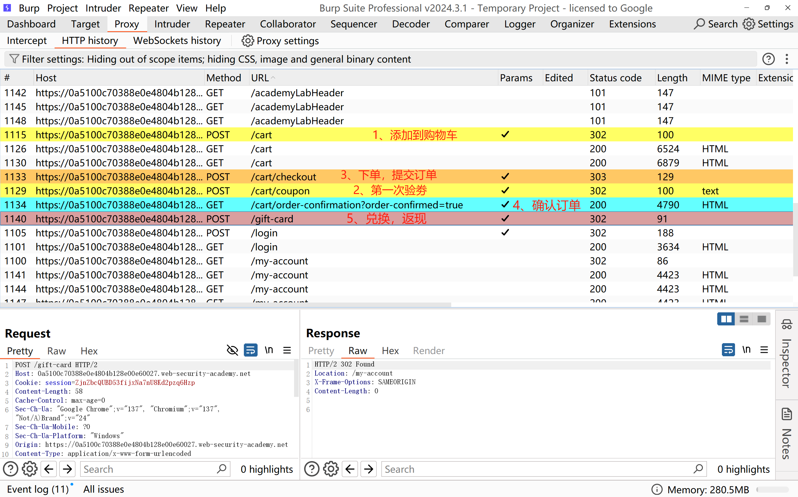 POST /cart加购物车——>POST /cart/coupon验劵——>POST /cart/checkout下单——>GET /cart/order-confirmation?order-confirmed=true 确认下单——>POST /gift-card 兑换返现