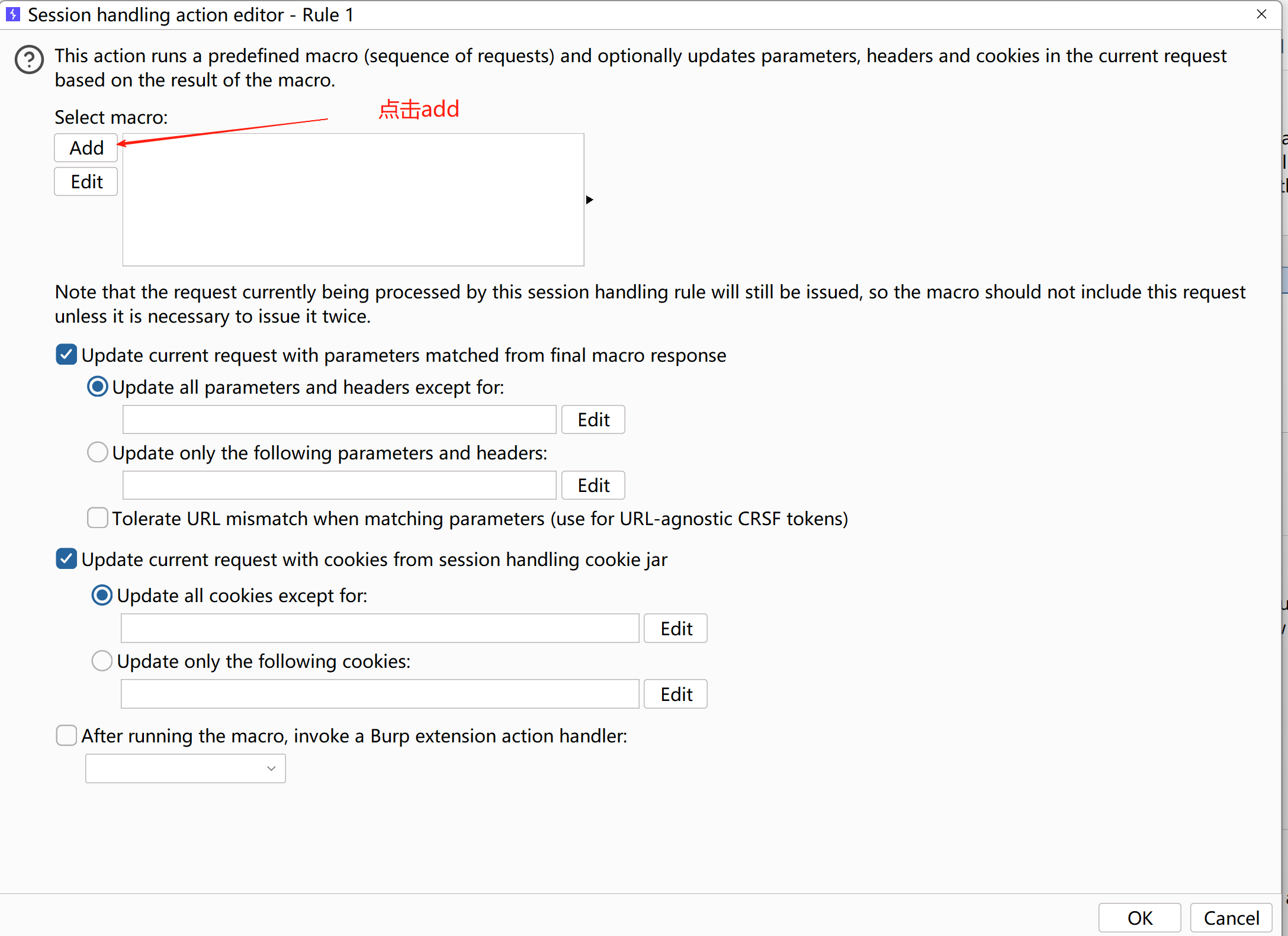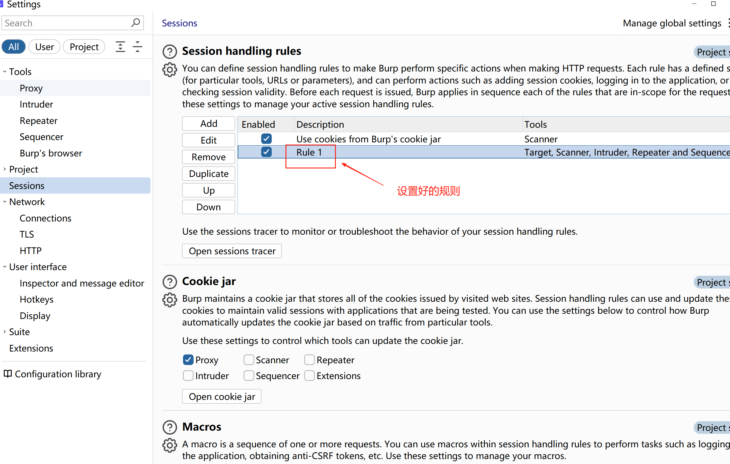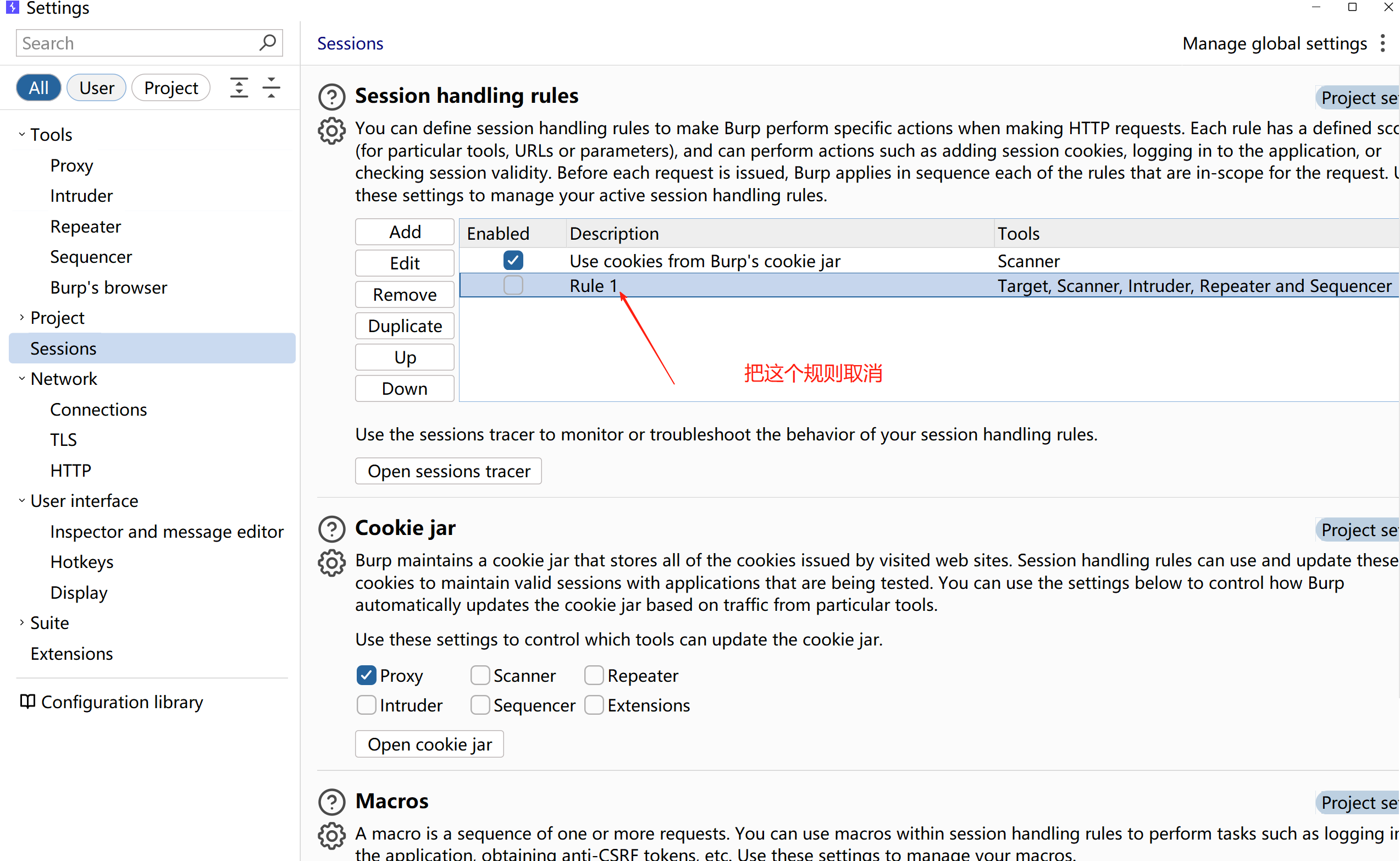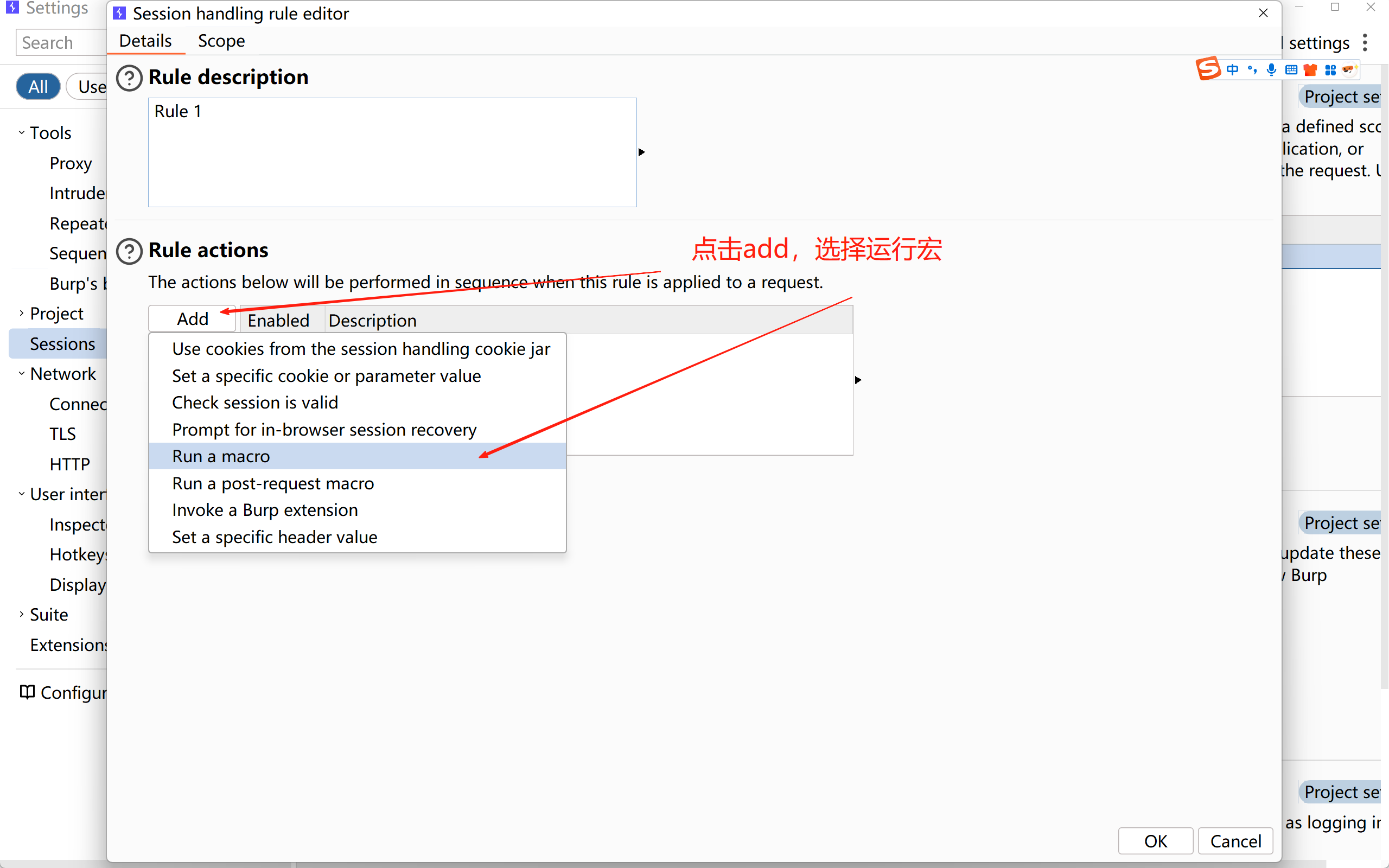 然后点击sessions,然后去Session handling rules下边,点击add
