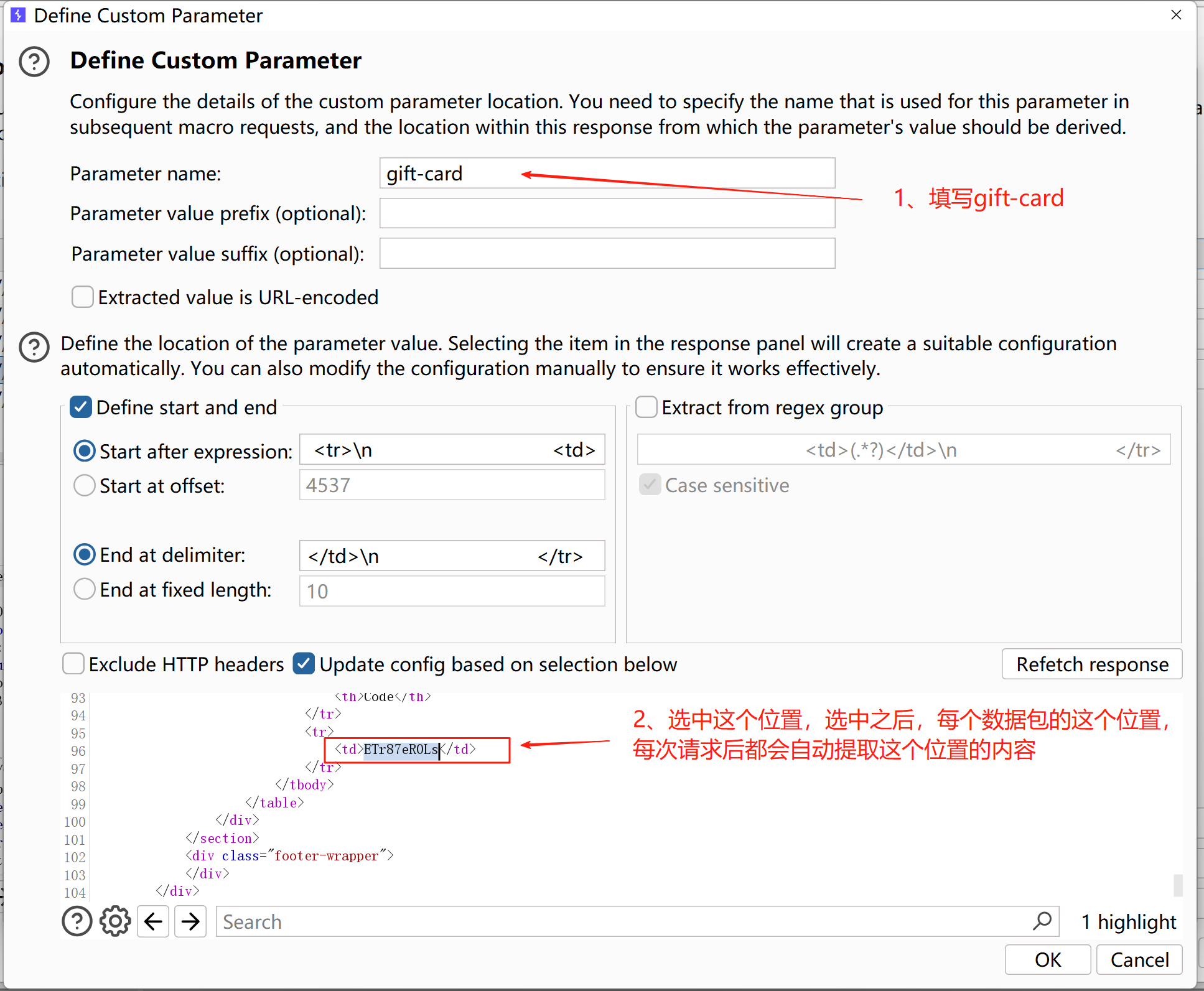 2、选中这个得到返现劵码的位置,选中之后,每个数据包的这个位置每次请求后都会自动提取这个位置的内容