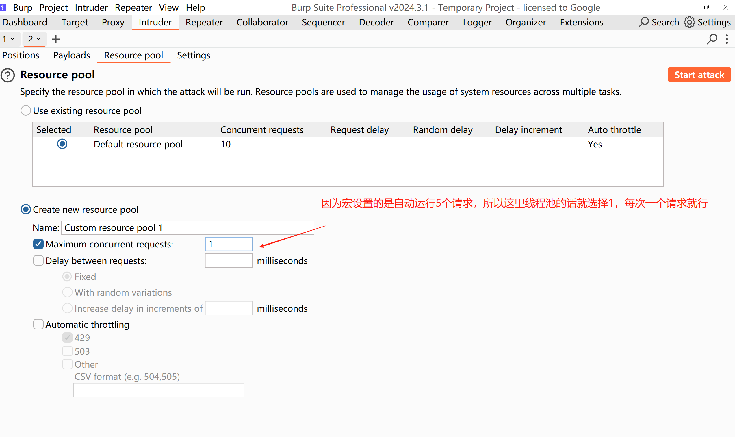 因为宏设置的是自动运行5个请求,所以这里线程池的话就选择1,每次一个请求就行