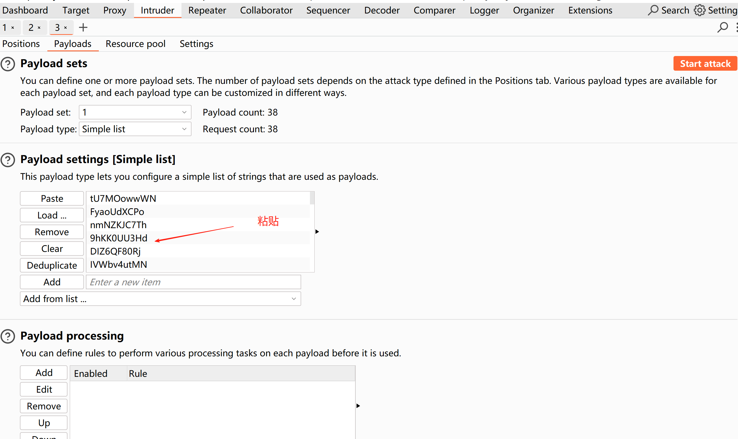 把刚刚得到的一堆劵码,复制到payloads设置