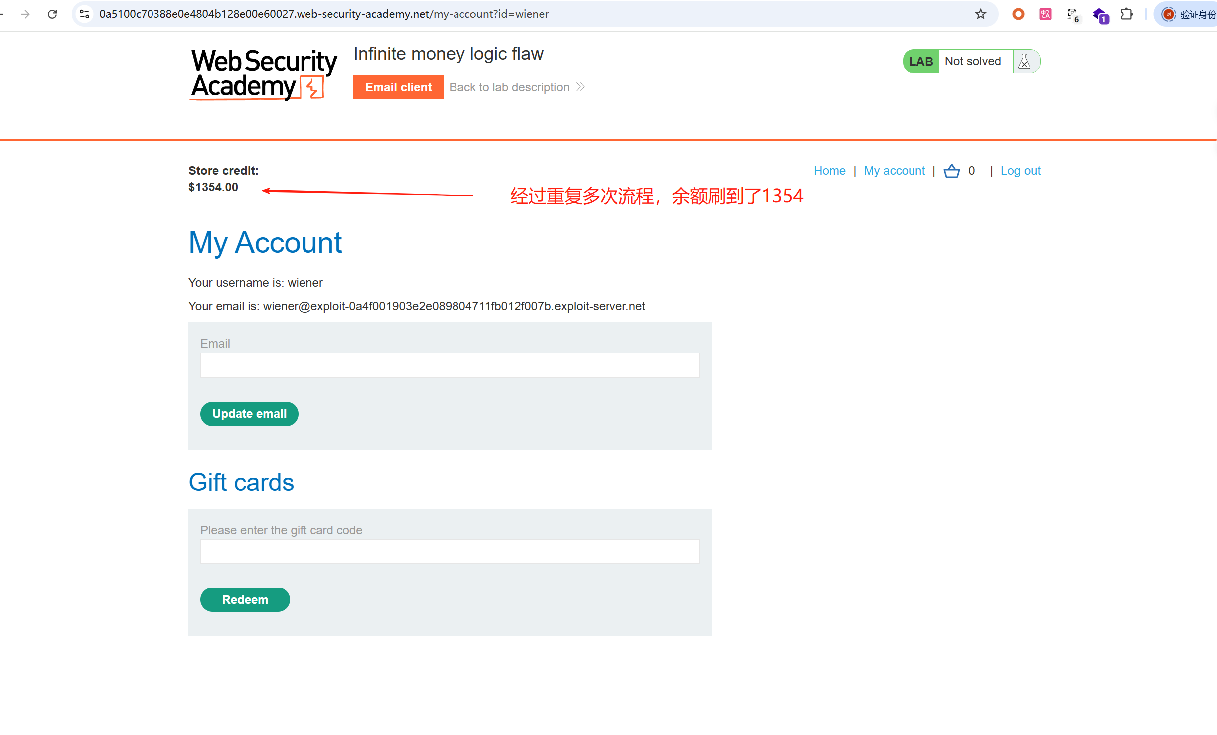 经过重复多次流程,余额刷到了1354