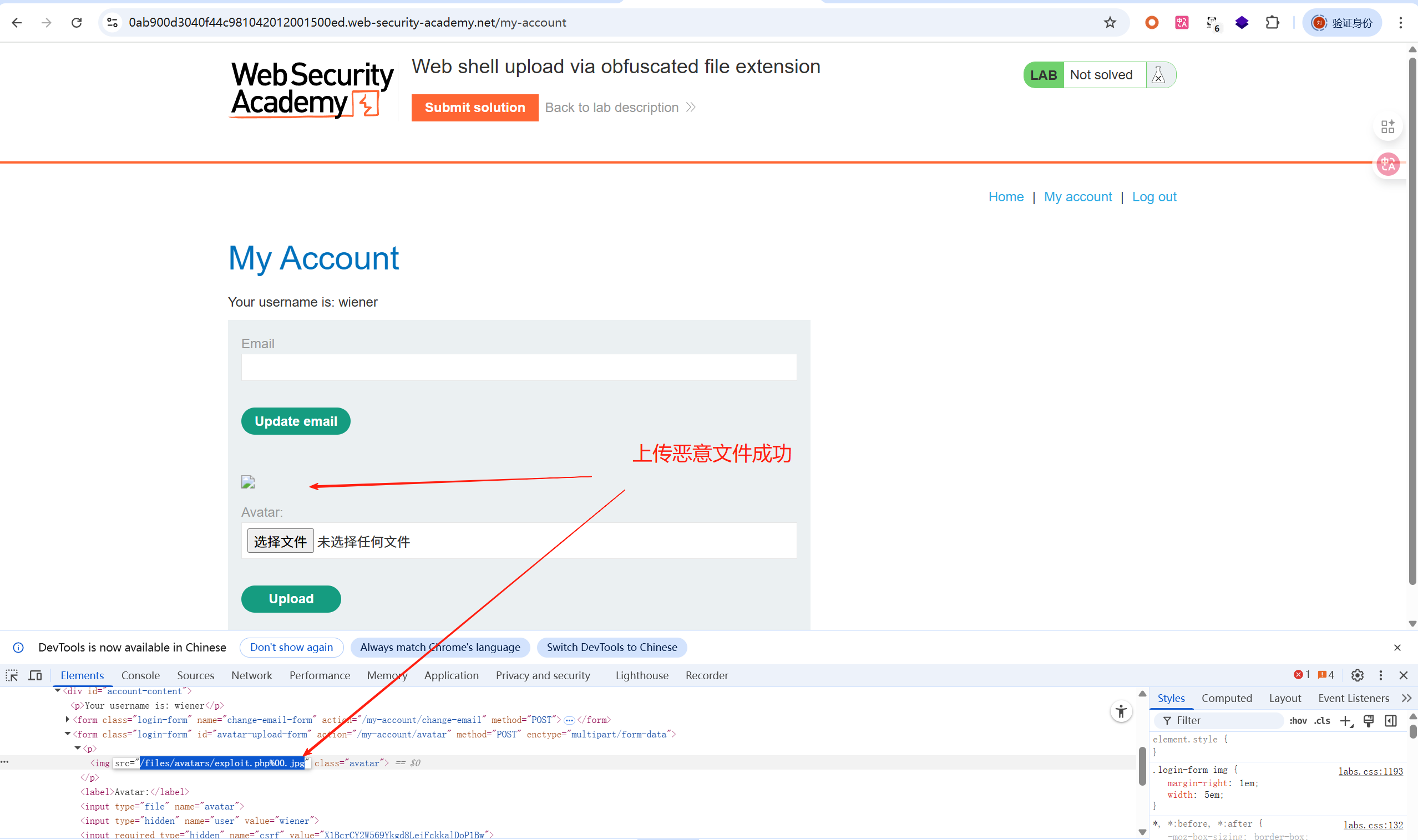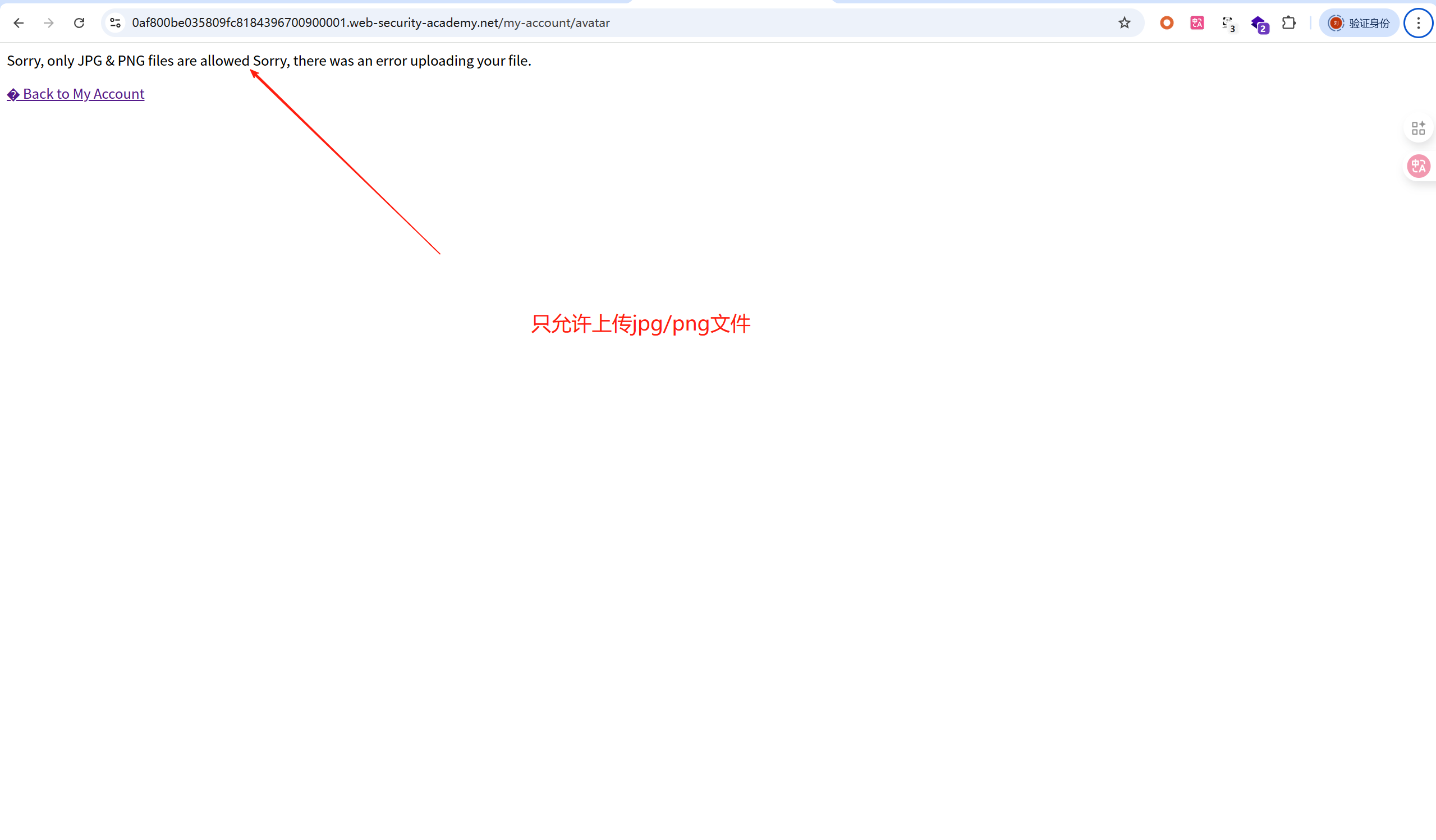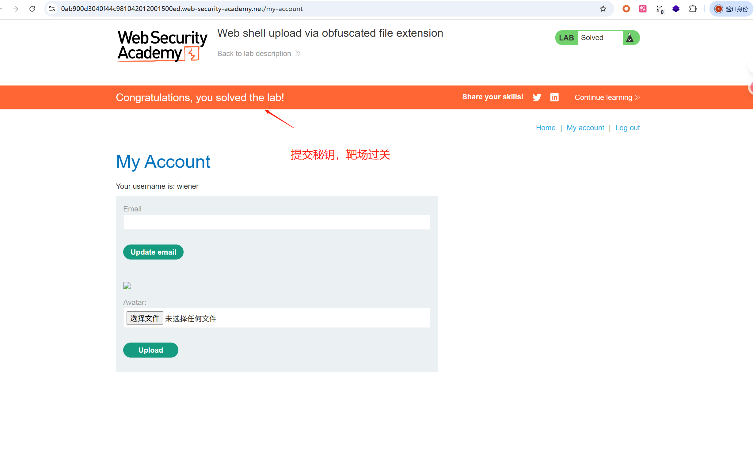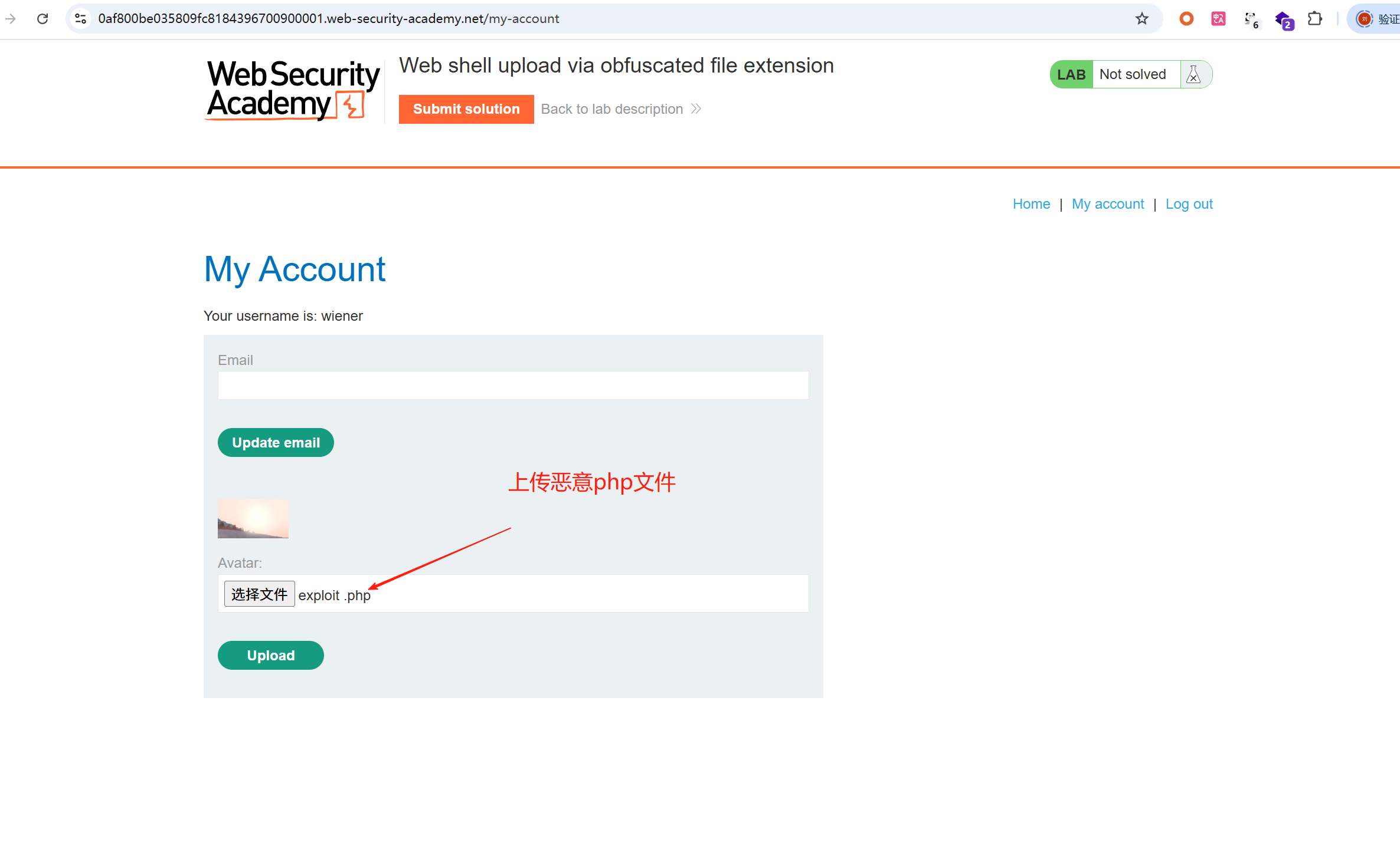 1、正常登录用户wiener:peter,上传正确格式的头像图片,上传成功,然后返回“我的账户”(具体操作见第四功)