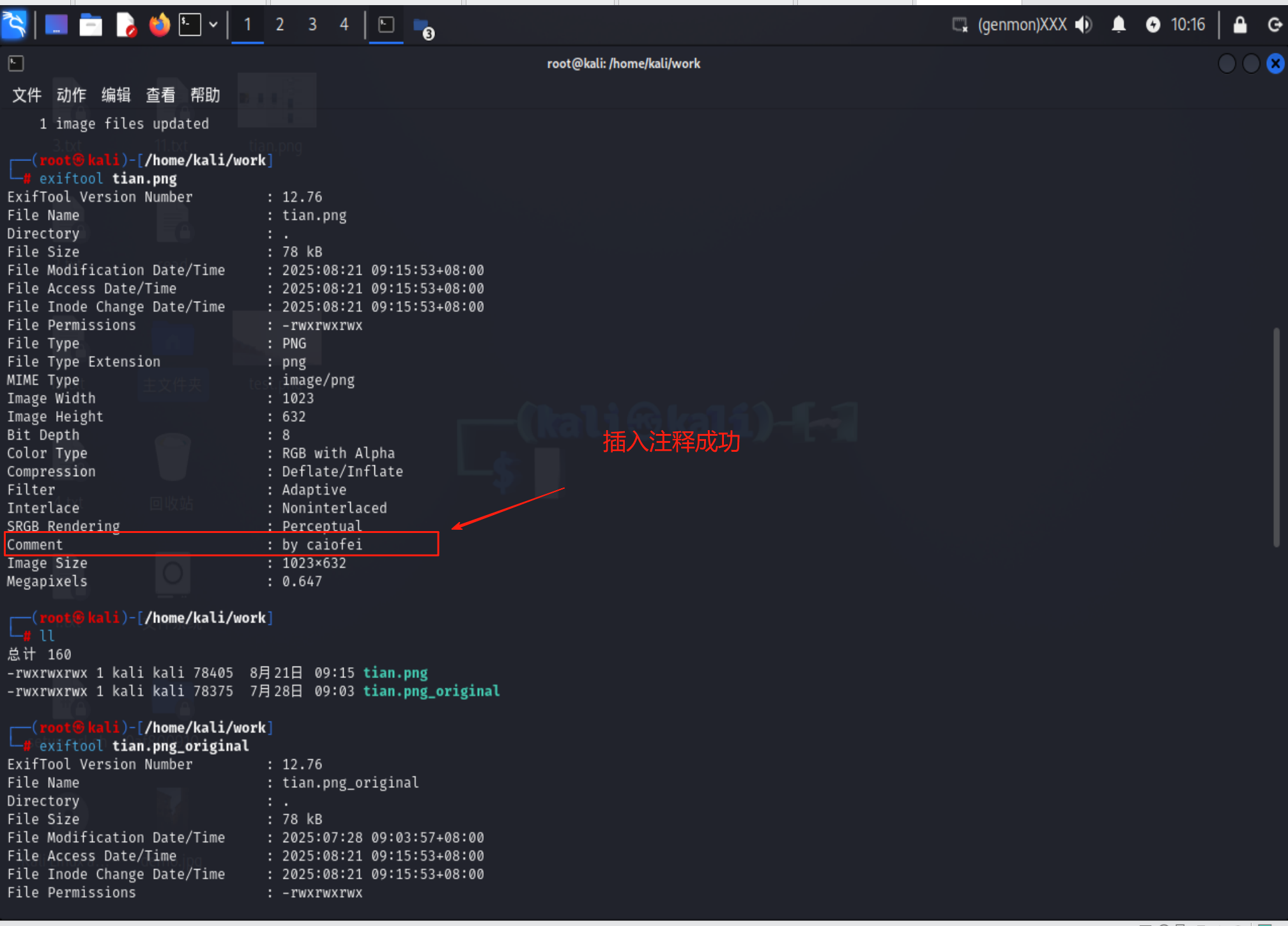 exiftool -Comment="by caiofei" tian.png