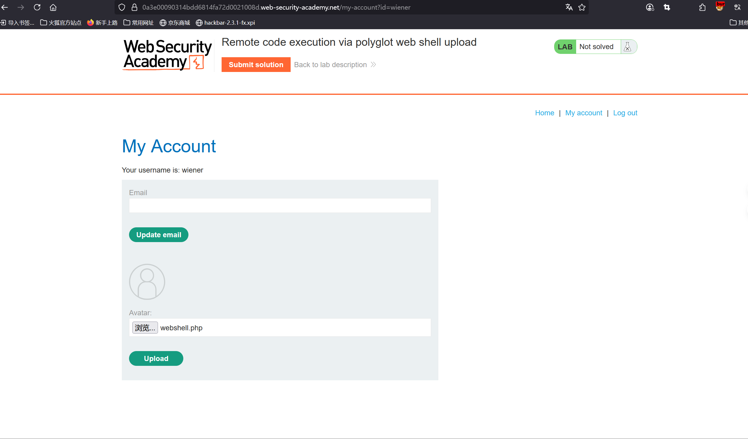 **3、上传一个基本的 PHP Web shell,然后使用它来窃取文件 /home/carlos/secret 的内容