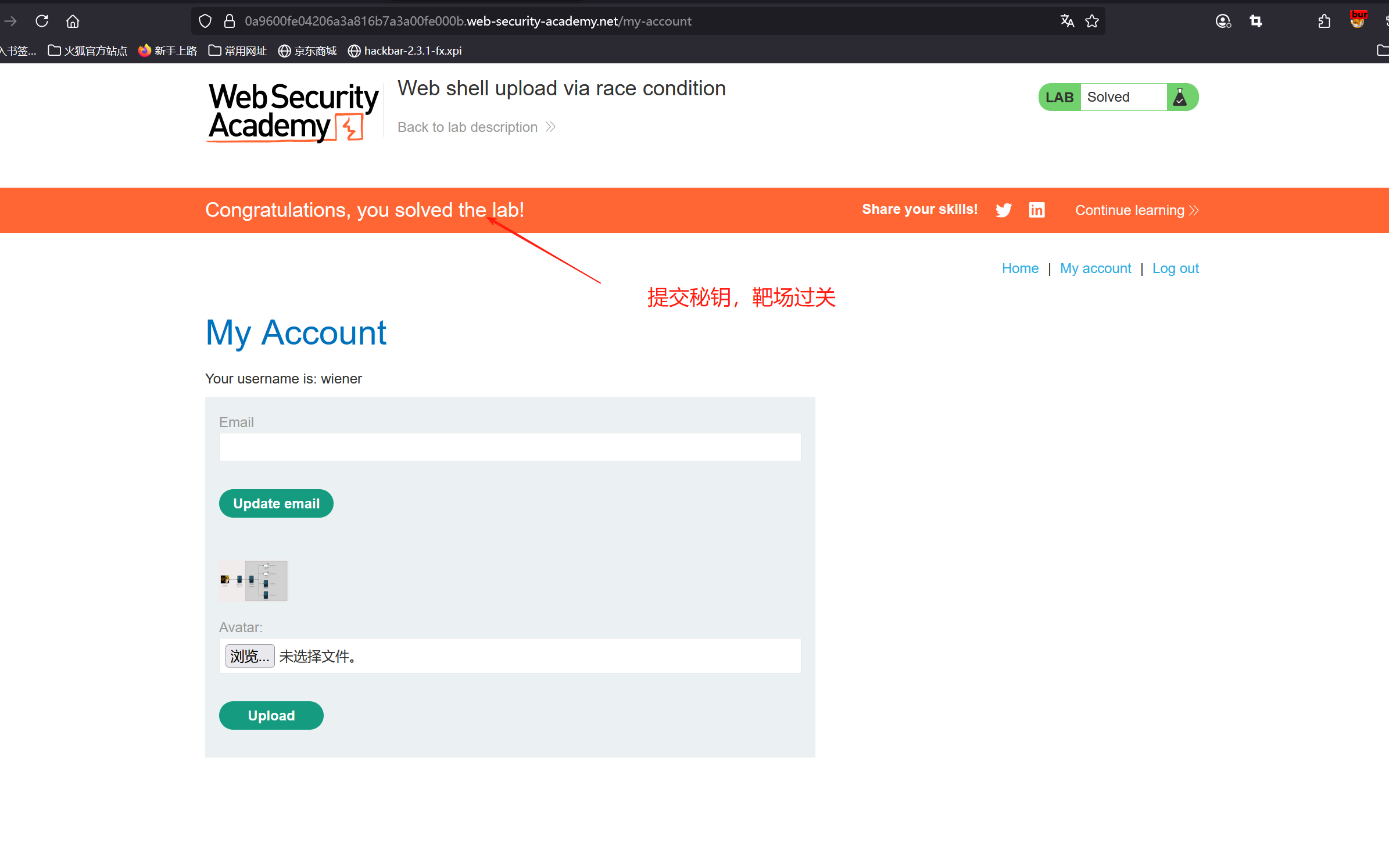 1、先正常登录账户,上传正确的头像图片,点击上传,跳转到上传成功页面,然后返回我的账户,这就是一个上传图片的流程(操作见第四关)