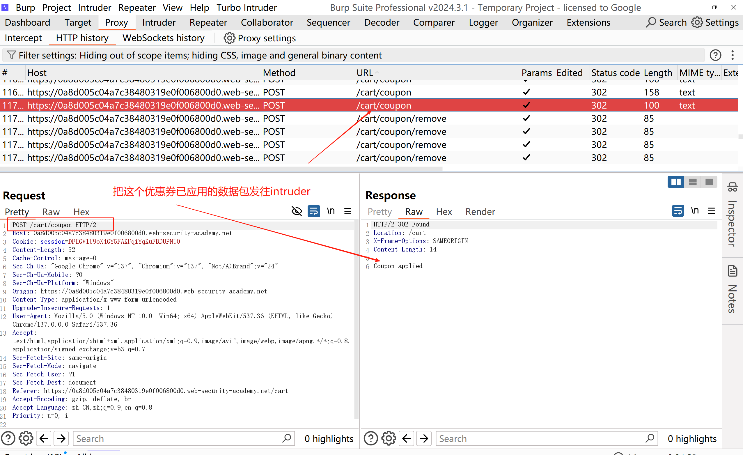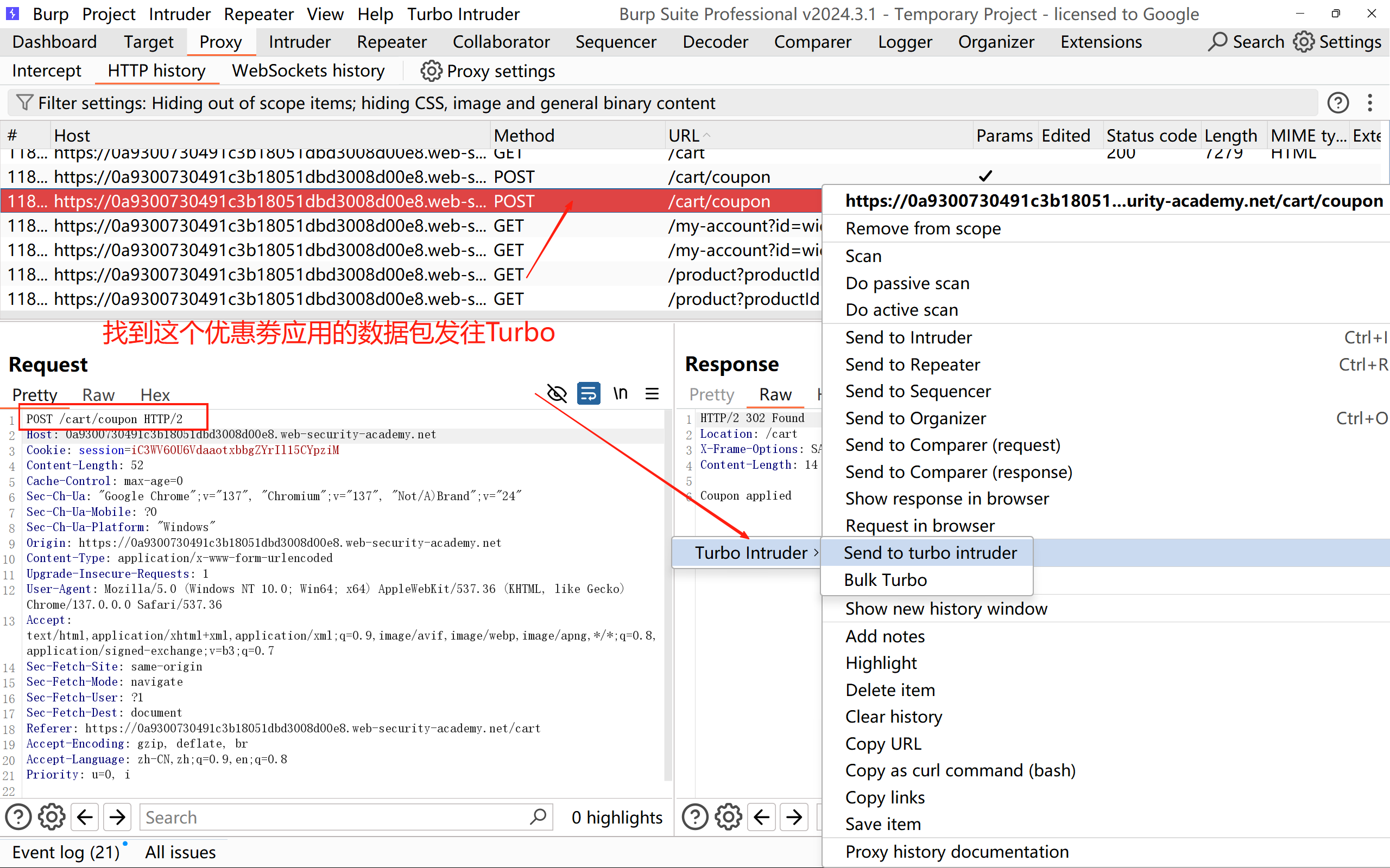 找到优惠劵已应用的数据包:POST /cart/coupon