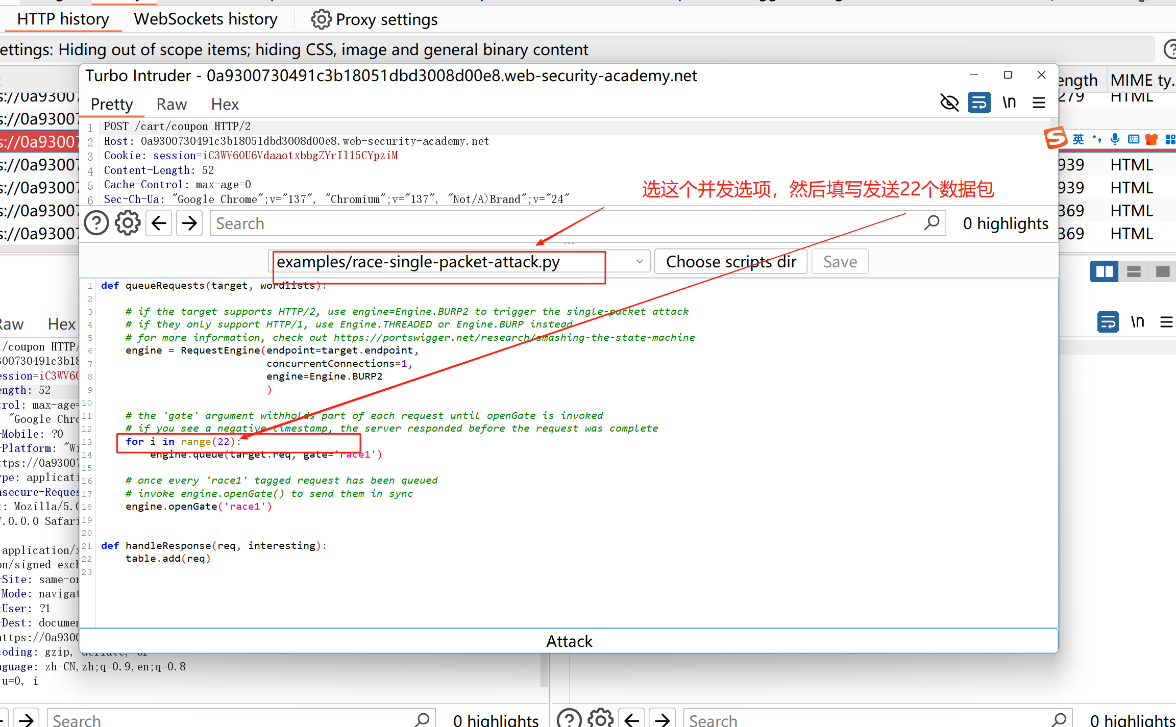 来到Turbo页面,选择“examples/race-single-packet-attack.py”并发选项,默认是发20个数据包,我这里改成22个,开始攻击