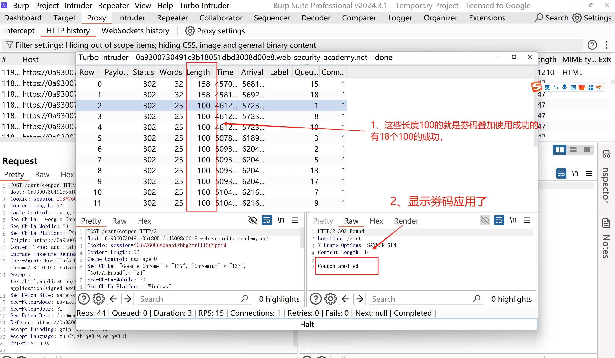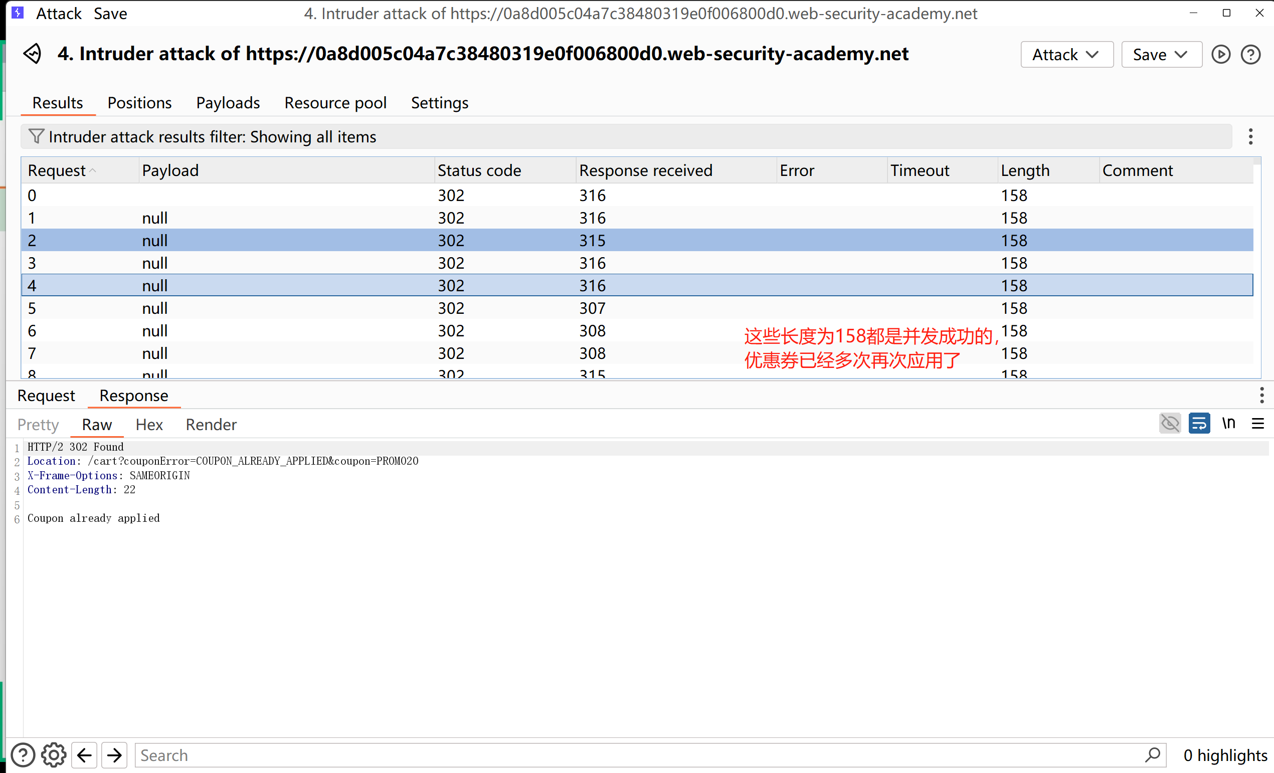 在这里这个intruder已经实现了这个并发发送请求的效果,我这里这些长度为158都是并发成功的优惠券已经多次再次应用了