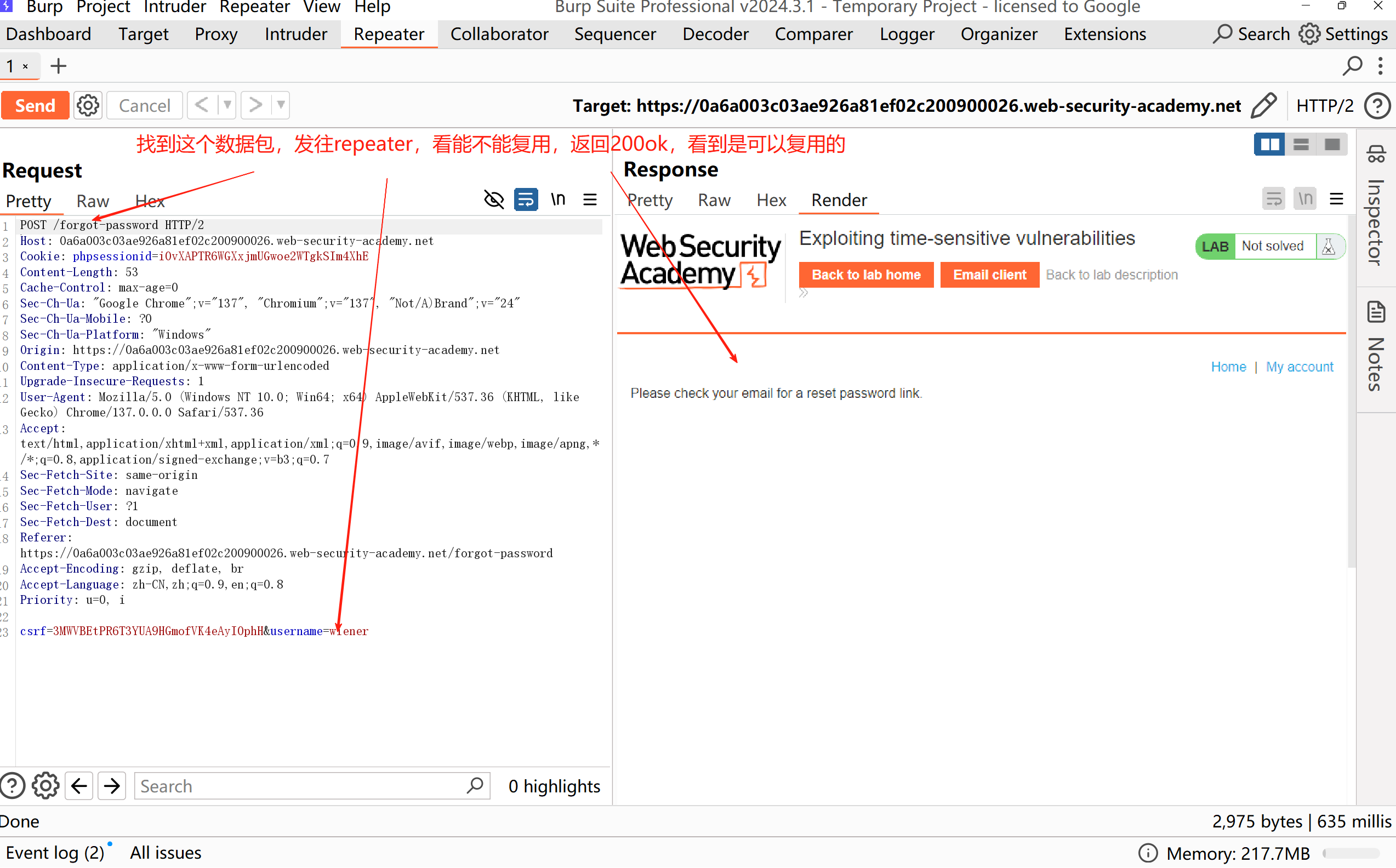 2、找到这个忘记密码的POST /forgot-password数据包,发往repeater,看能不能复用,返回200ok,看到是可以复用的