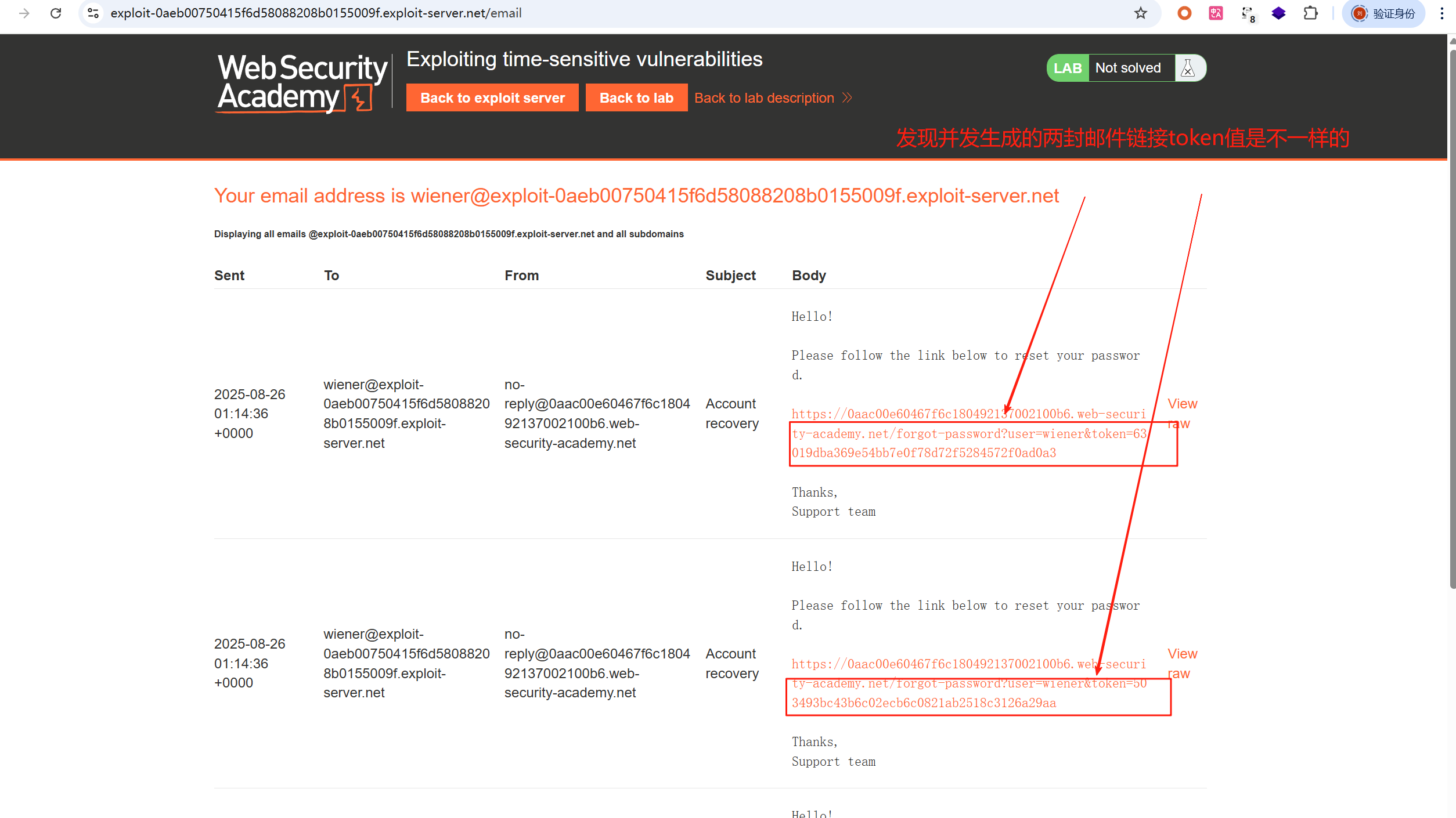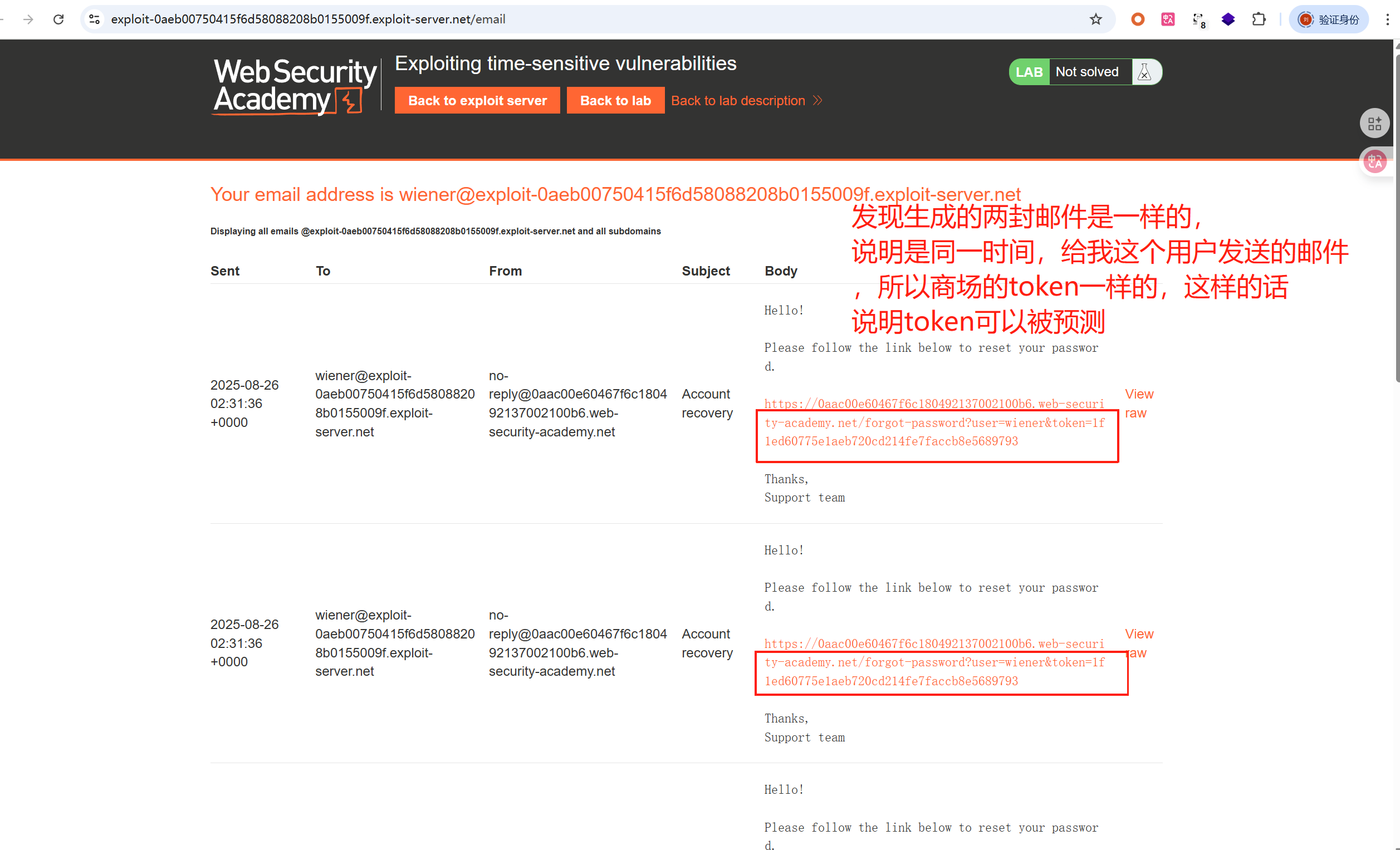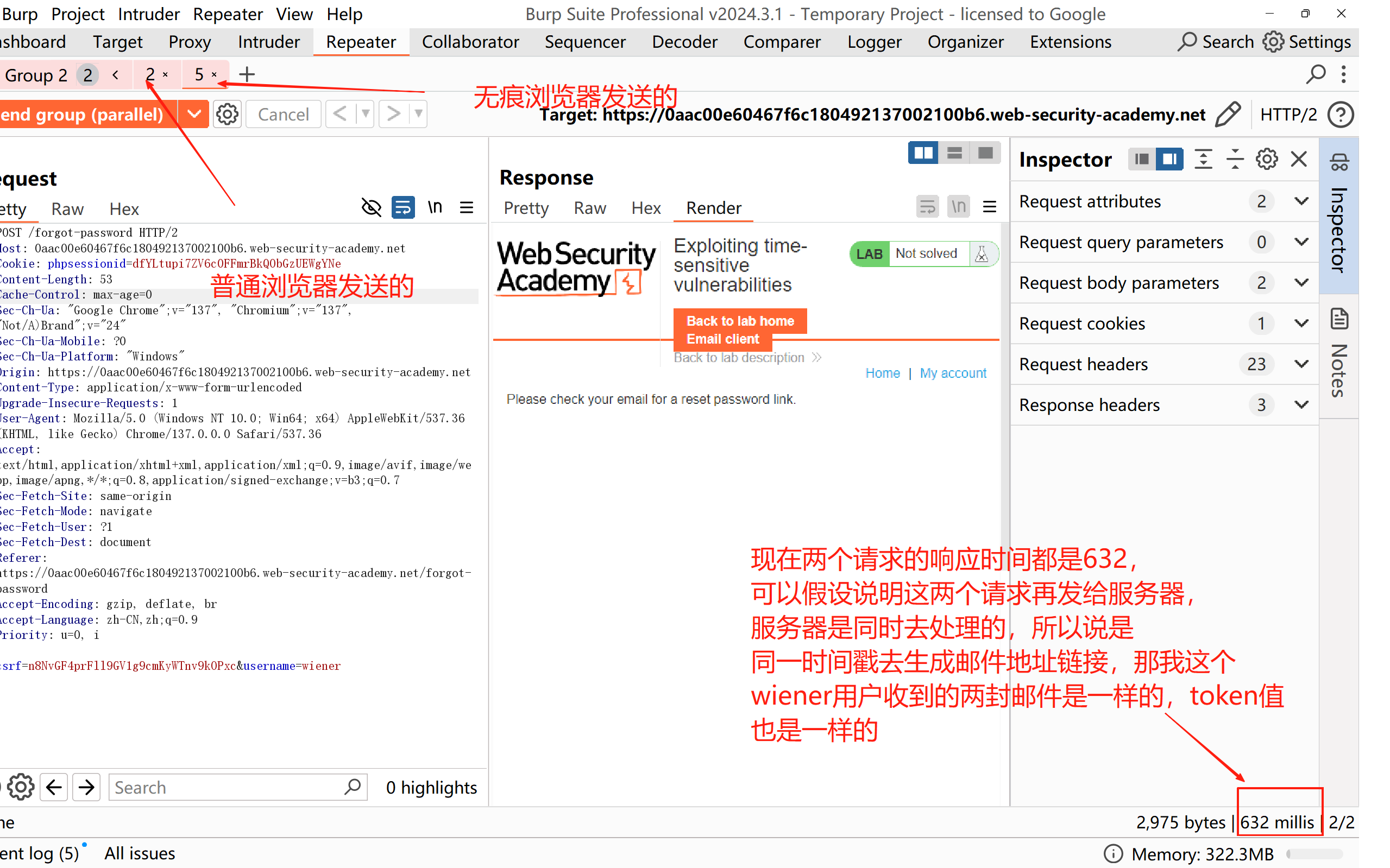 现在两个请求的响应时间都是632可以假设说明这两个请求再发给服务器服务器是同时去处理的,所以说是同一时间戳去生成邮件地址链接,那我这个wiener用户收到的两封邮件是一样的,token值也是一样的