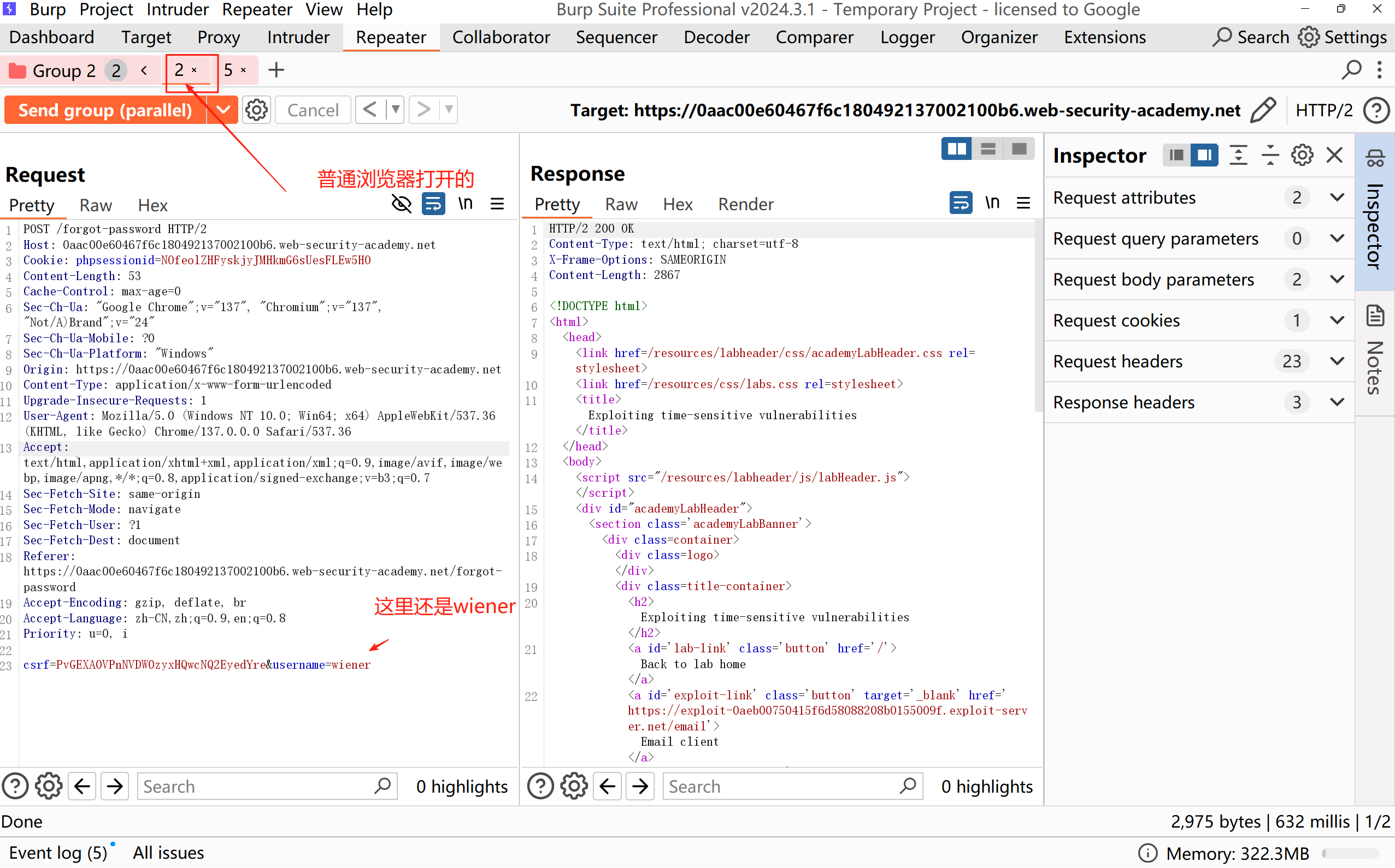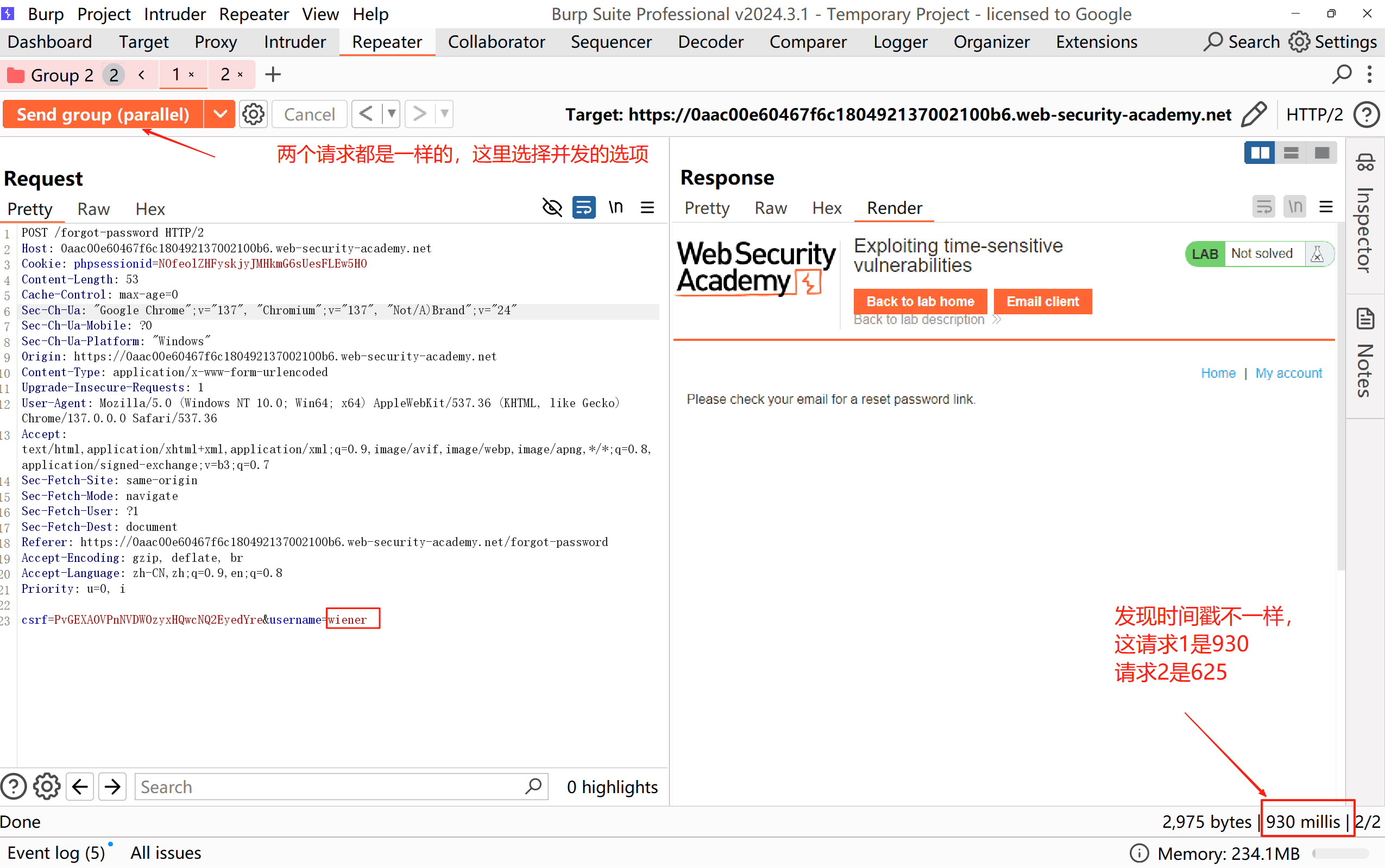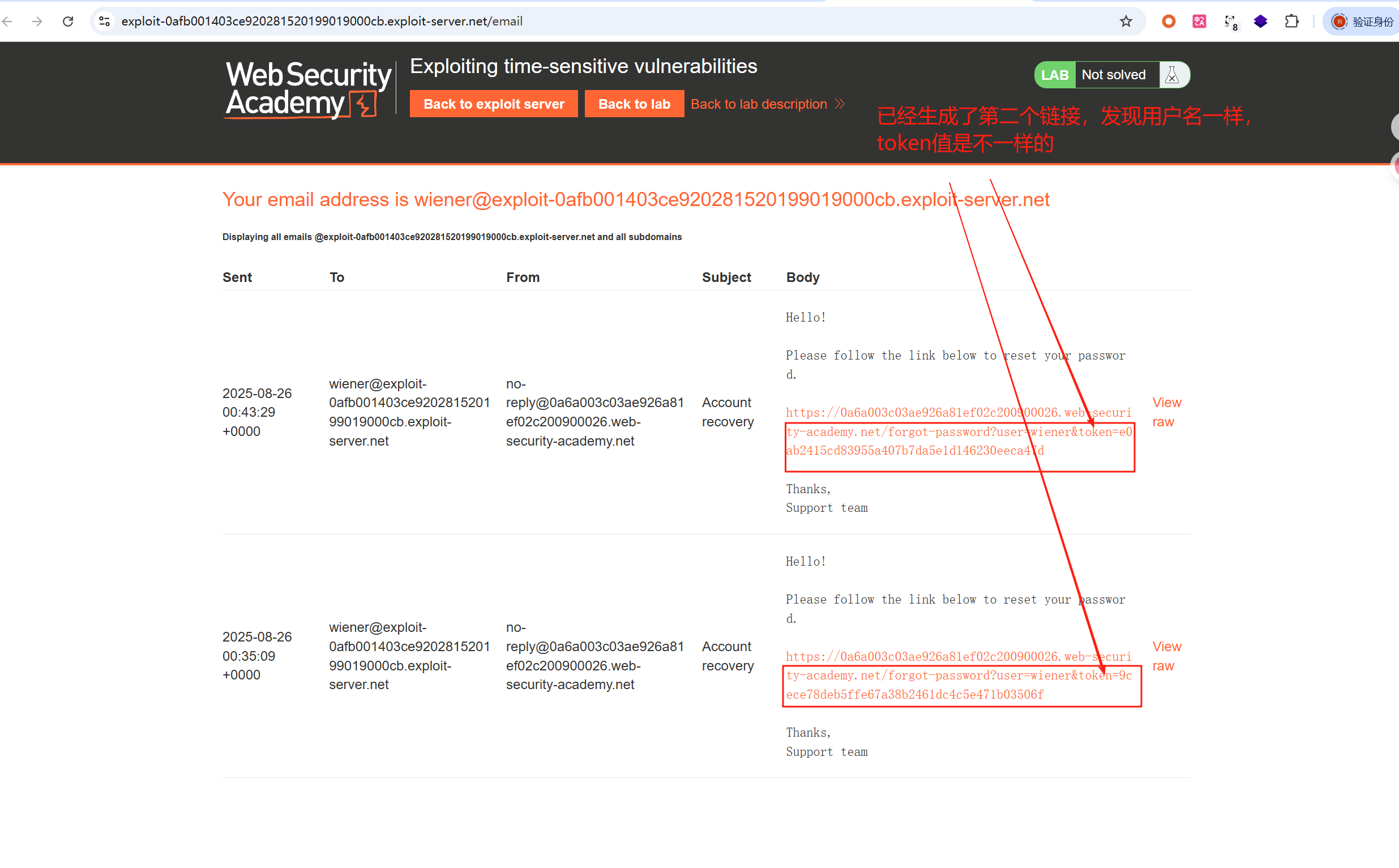 现在两个请求的响应时间都是632可以假设说明这两个请求再发给服务器服务器是同时去处理的,所以说是同一时间戳去生成邮件地址链接,那我这个wiener用户收到的两封邮件是一样的,token值也是一样的