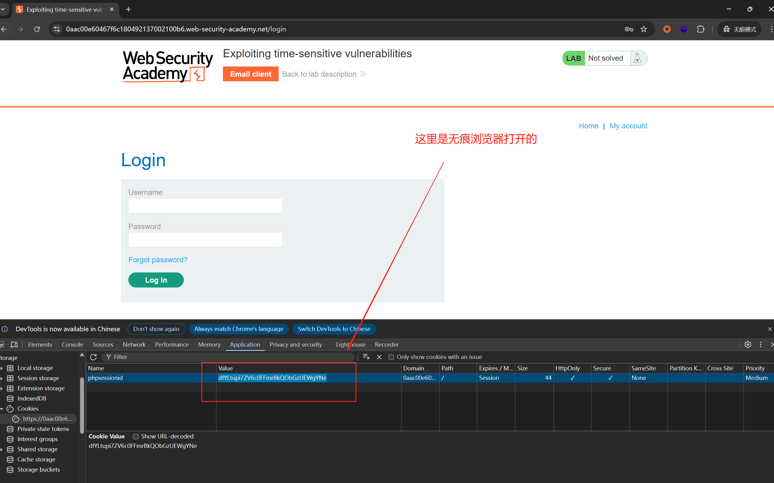 先新开一个无痕浏览器,然后打开靶场,现在就是一个不同的会话了和不是无痕浏览器打开的靶场是不一样的,发现cookie值也不一样