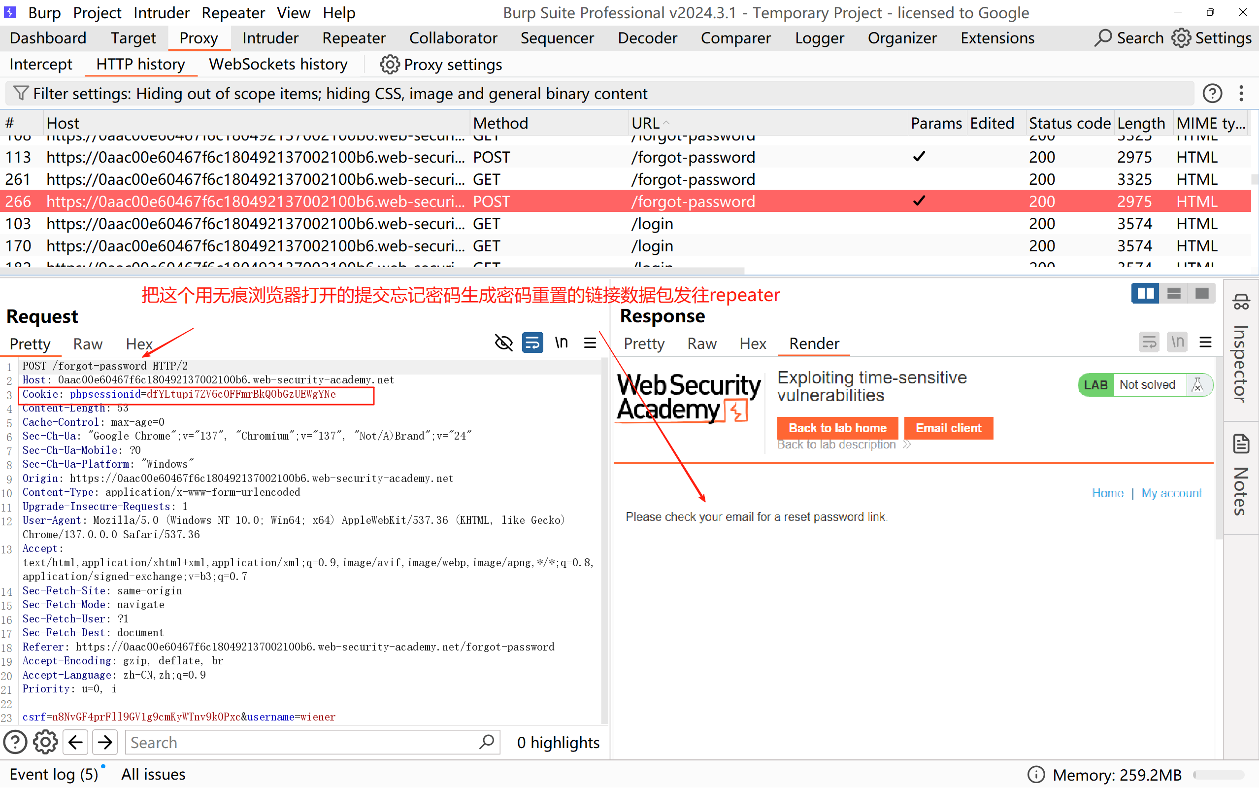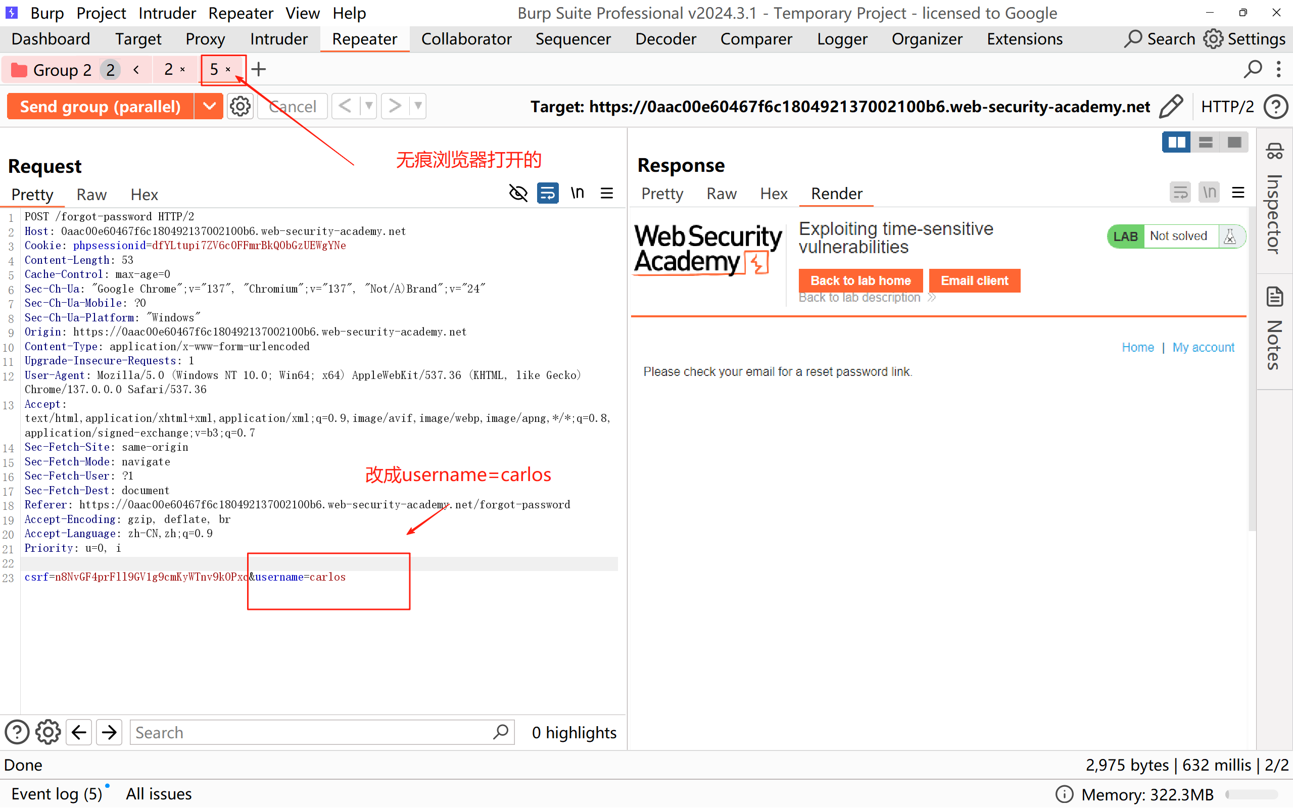 先把这个用无痕浏览器打开的提交忘记密码POST /forgot-password的数据包发往repeater