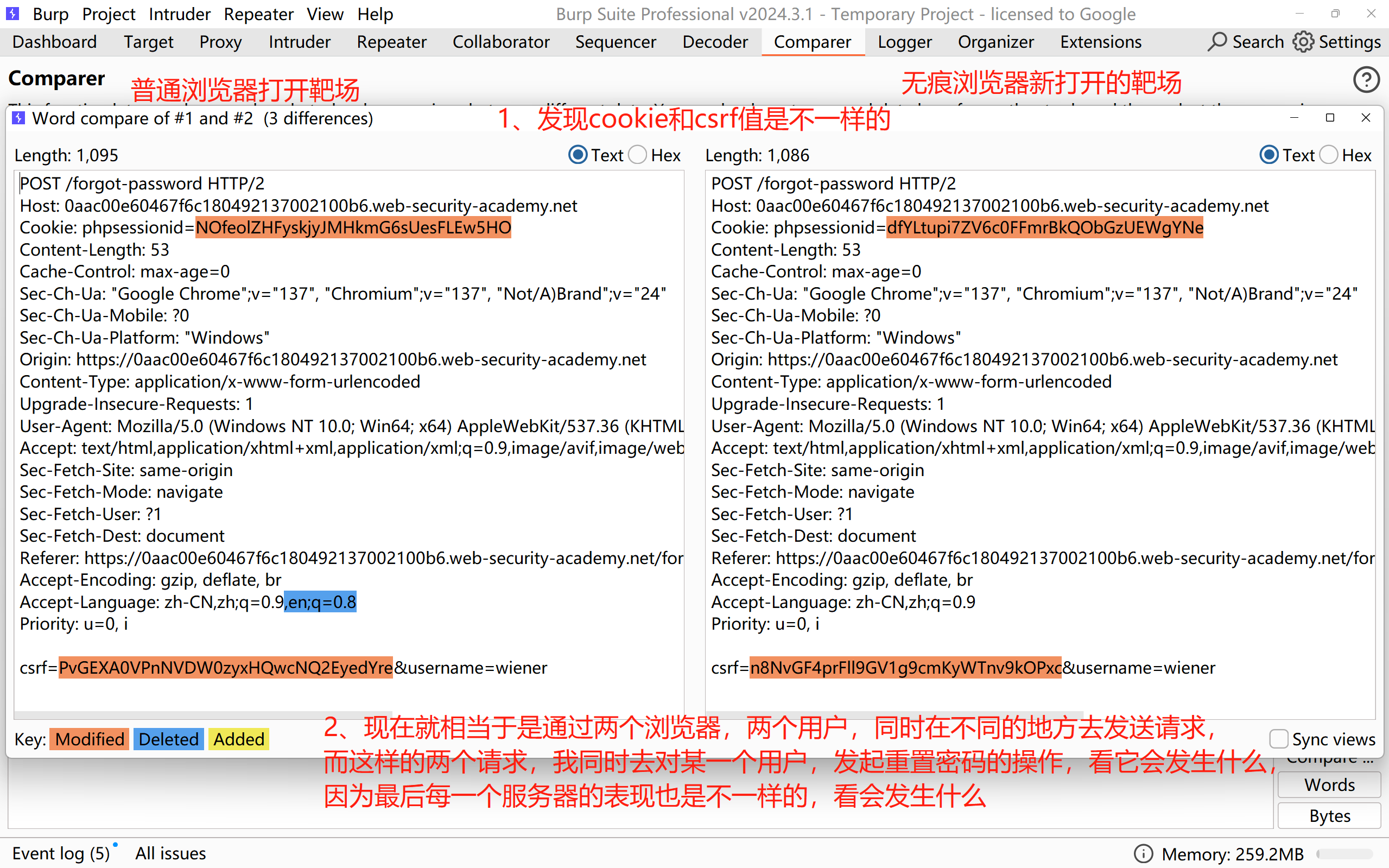 提示:1、靶场包含密码重置机制。尽管它不包含竞争条件,但您可以通过发送精心定时的请求来利用该机制损坏的密码学。
