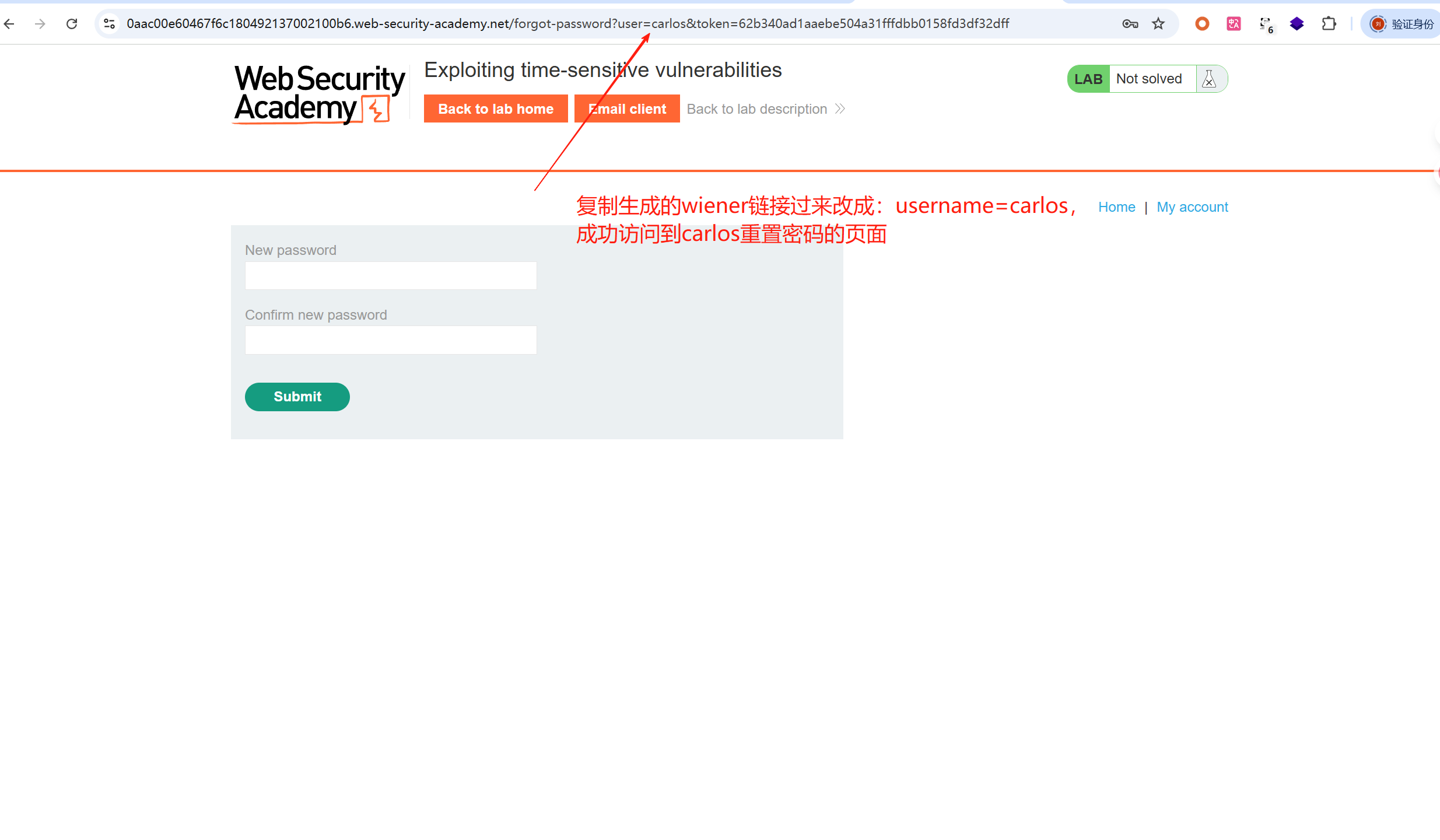 复制生成的wiener链接过来改成:username=carlos成功访问到carlos重置密码的页面