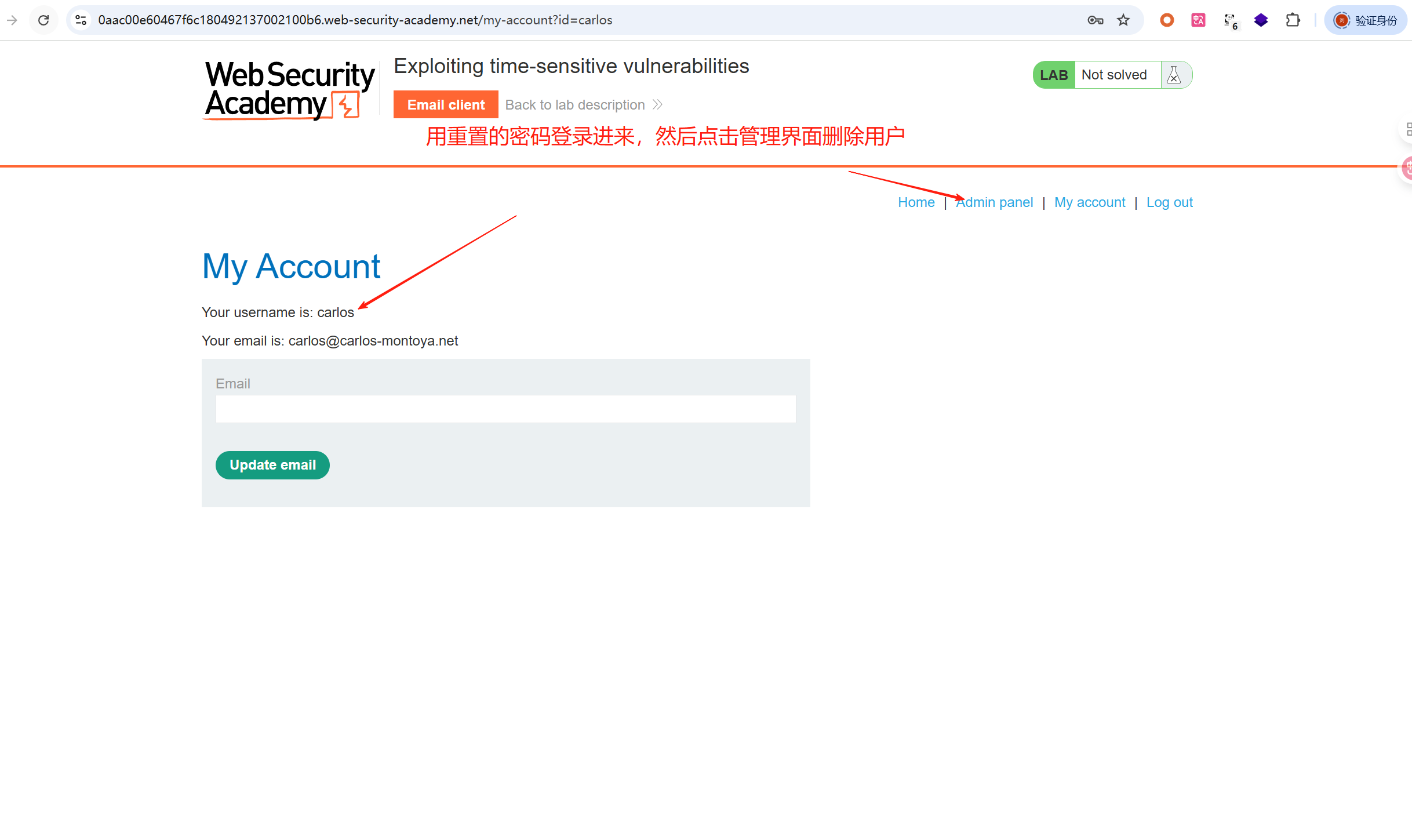 然后用carlos已经重置的密码登录进来,然后点击管理界面删除用户