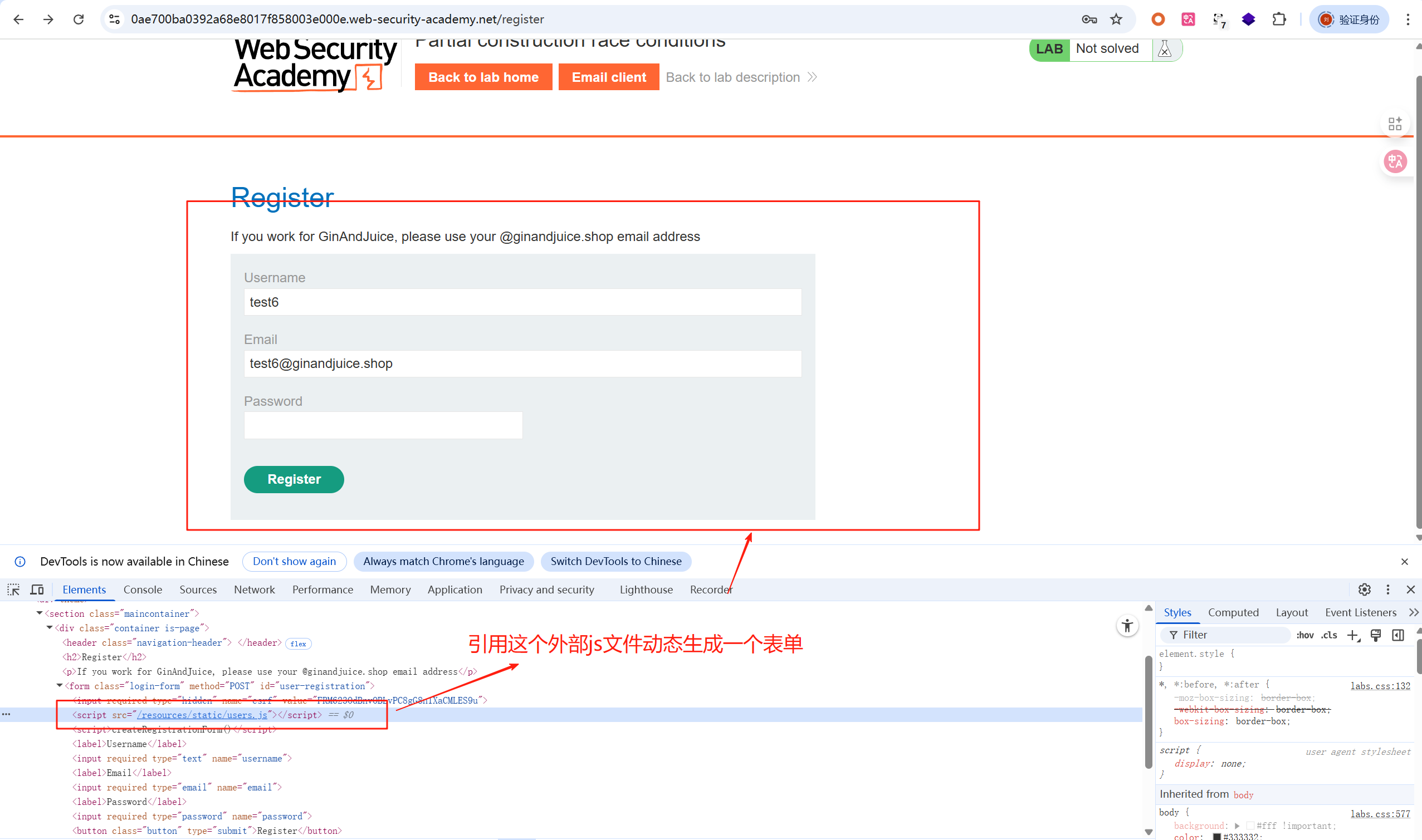提示:1、靶场包含用户注册机制。通过竞争条件,您可以绕过电子邮件验证,并使用您不拥有的任意电子邮件地址进行注册。