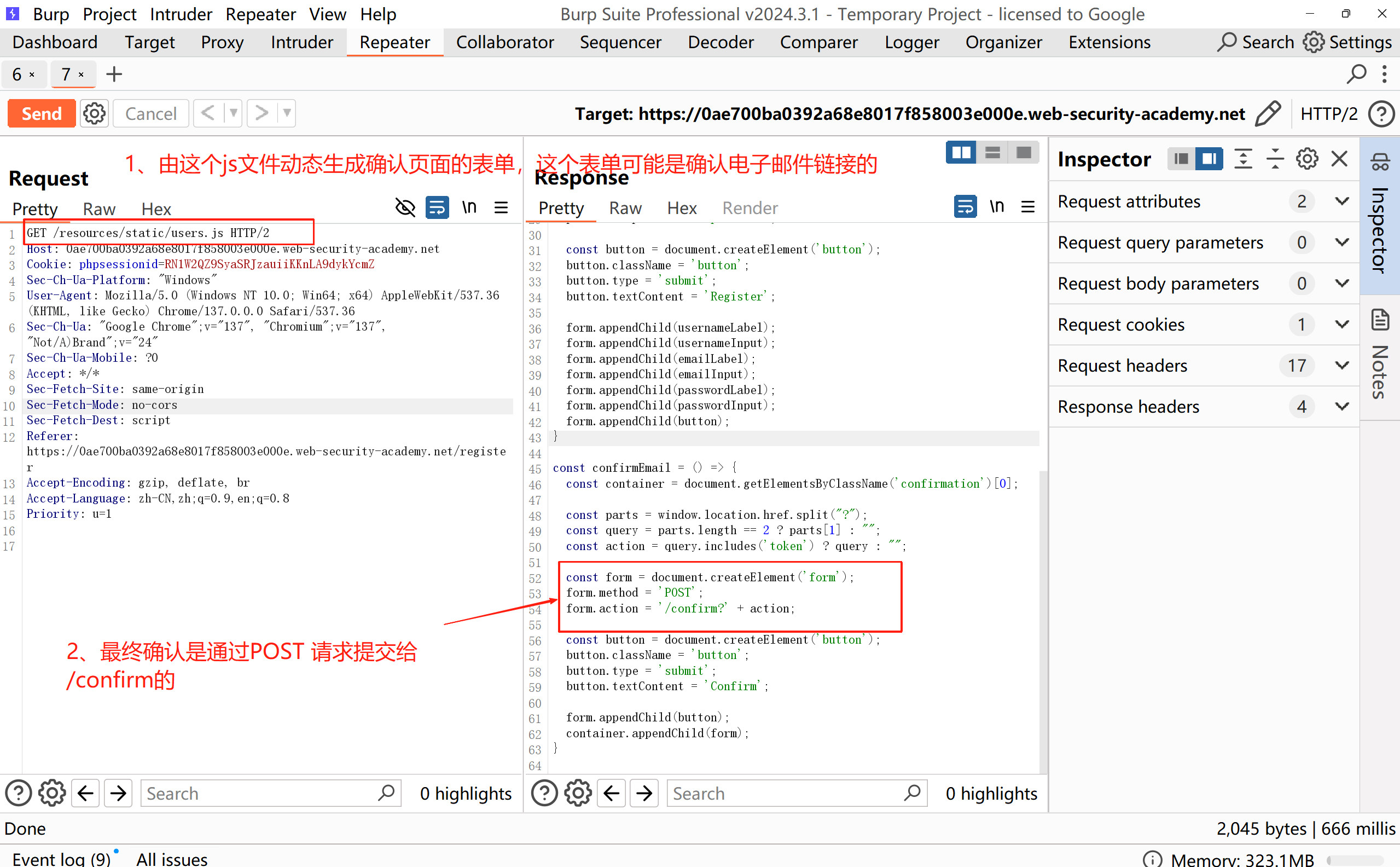 查看/resources/static/users.js请求的响应正文,最终确认是通过 POST 请求提交给 /confirm 的,并在查询字符串中提供了令牌。