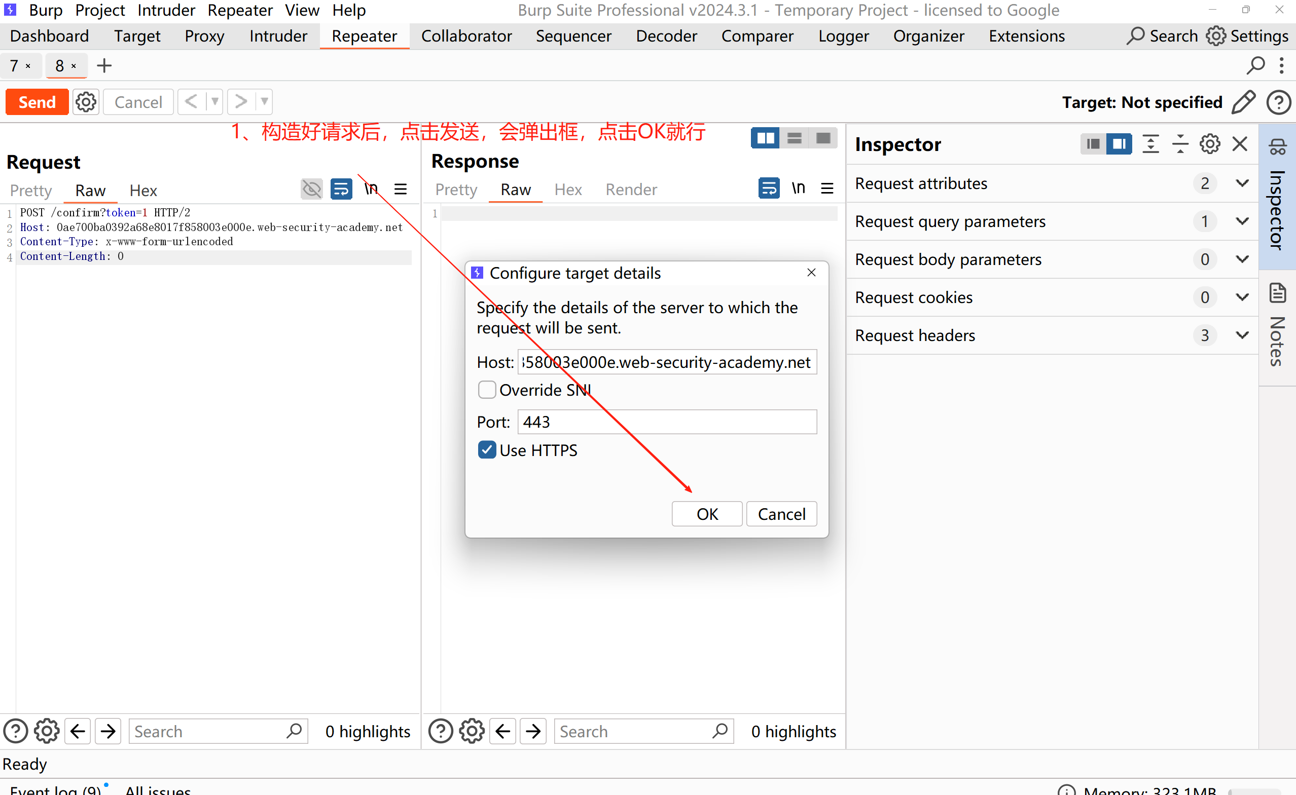 在 Burp Repeater 中,创建与浏览器单击确认链接时可能发送的内容等效的请求