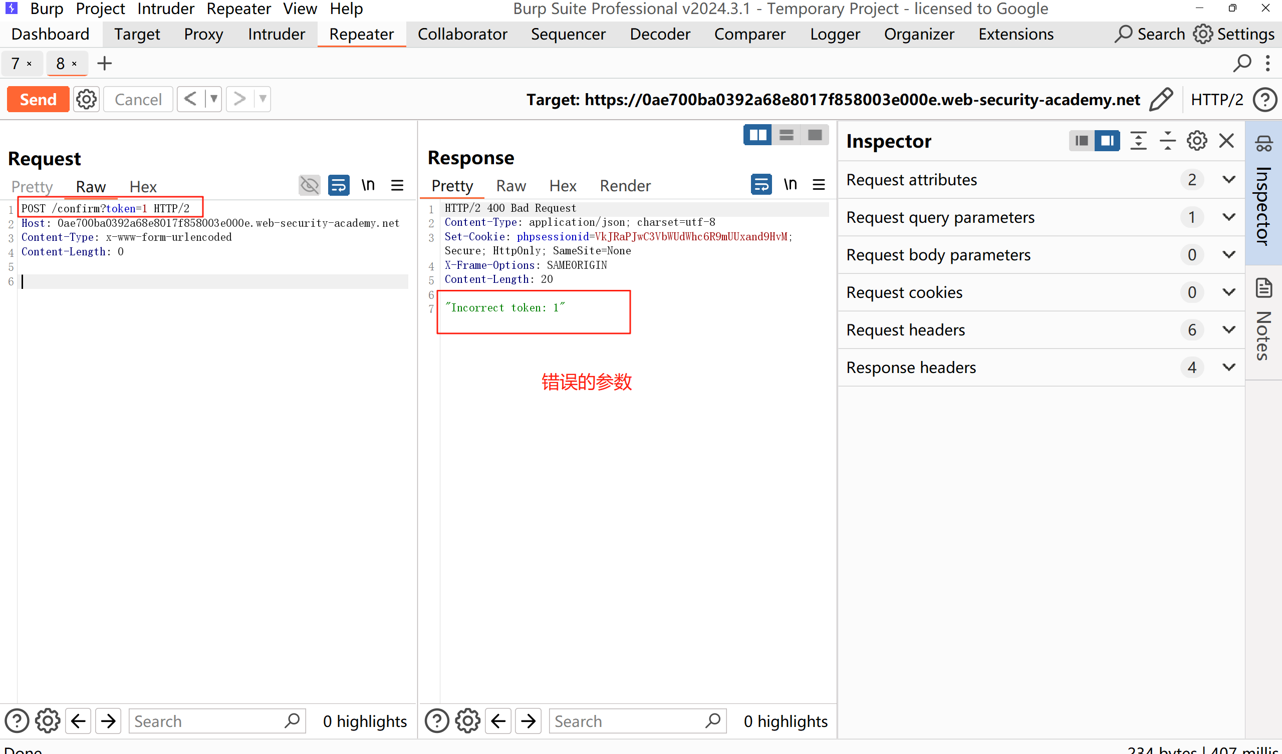 在单独的“重复器”选项卡中,使用任意令牌构造确认请求,就是上面使用过的确认的数据包: