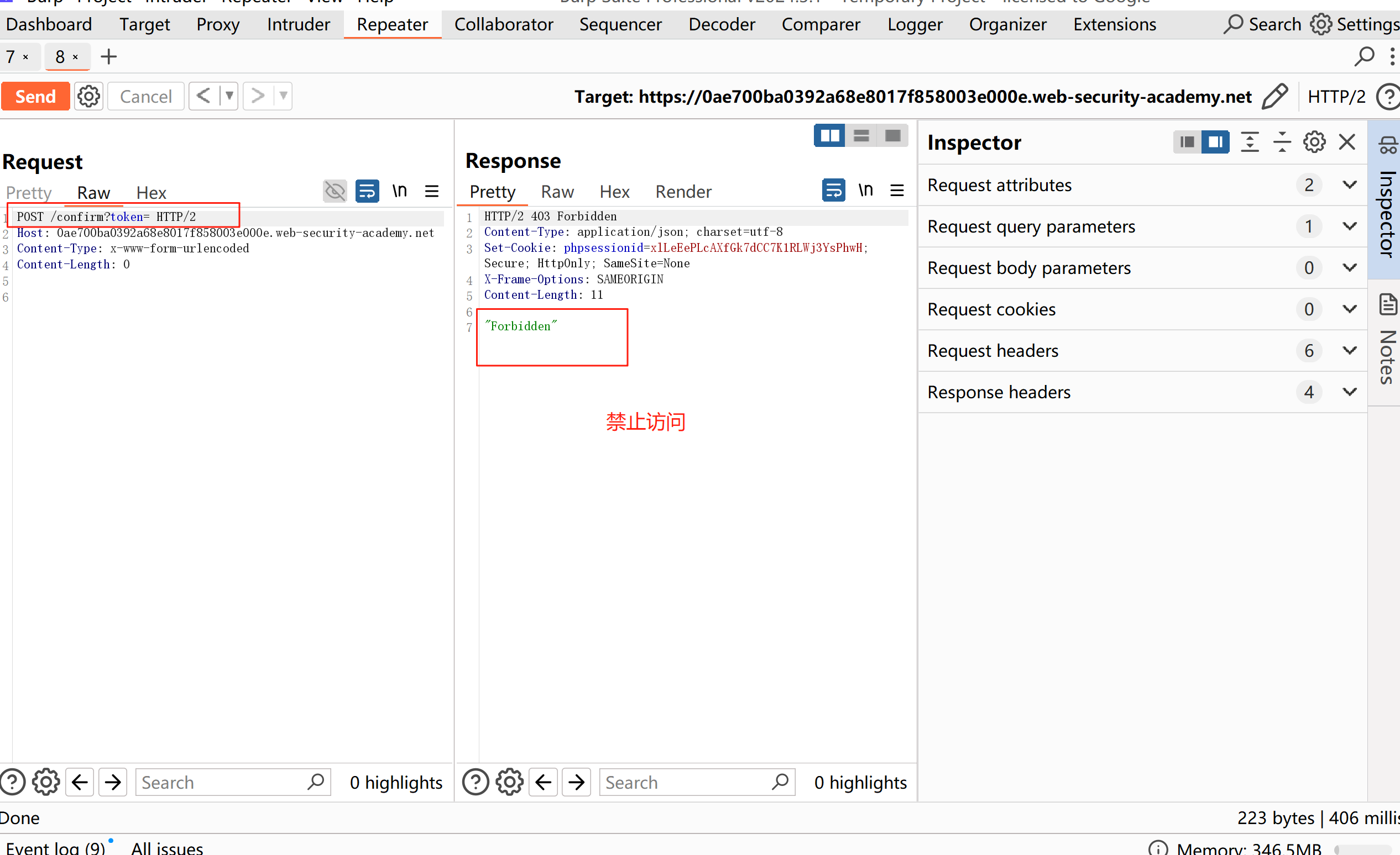 然后再做尝试提交空令牌参数token= ,请求响应返回"Forbidden"