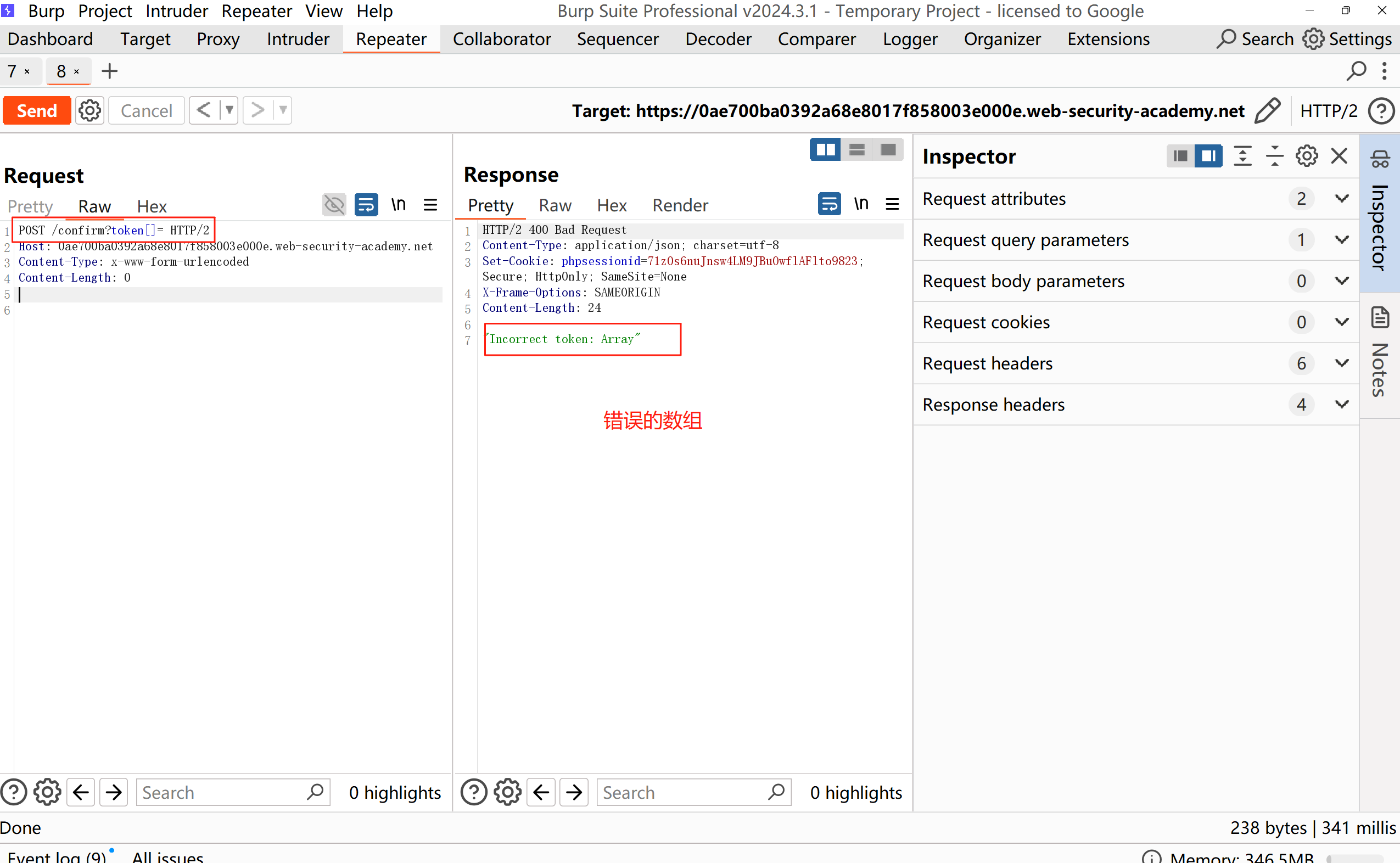 收到的不是 Forbidden 响应,而是"Incorrect token: Array"响应,这表明已成功传入一个空数组,该数组可能与未初始化的注册令牌匹配。