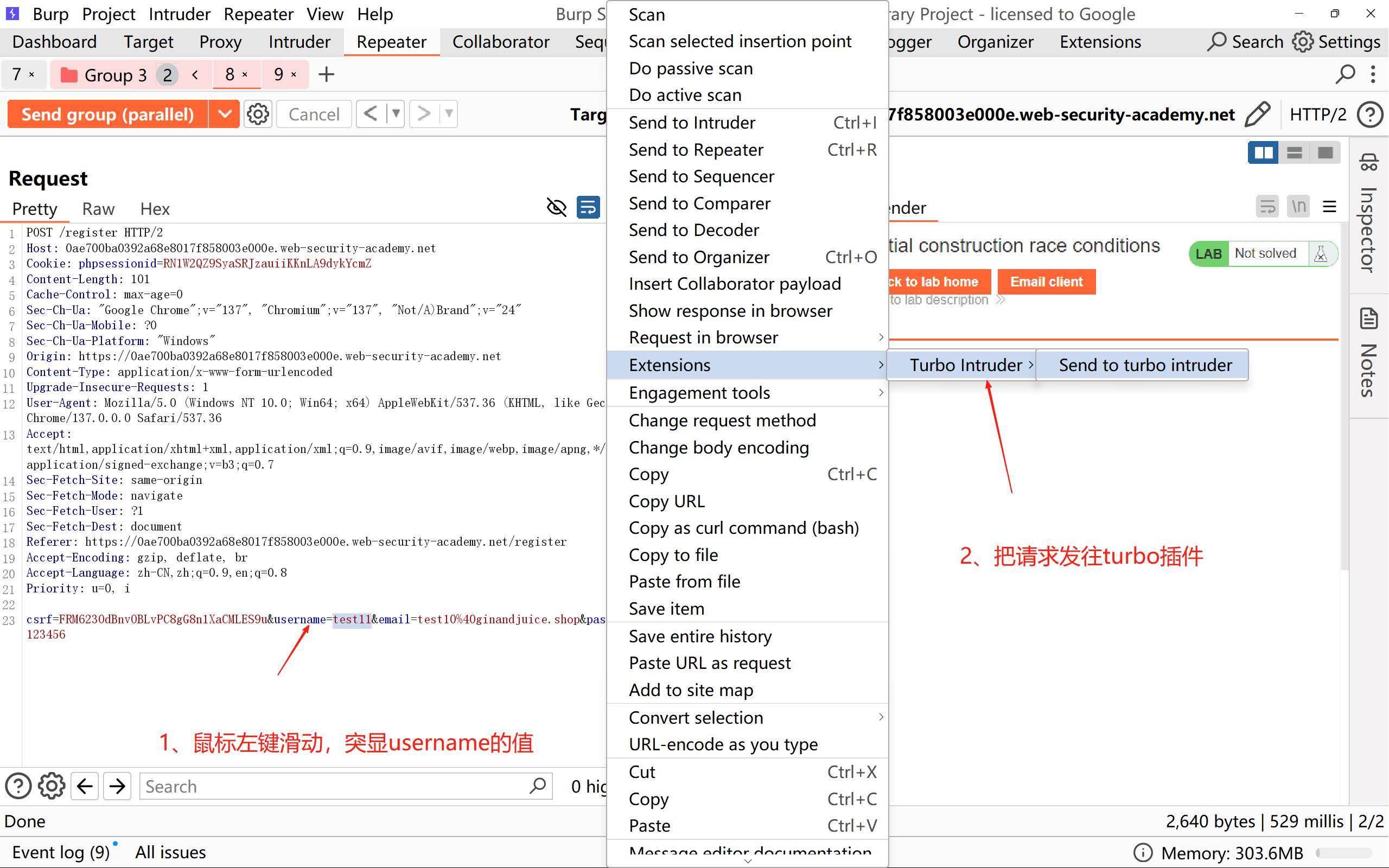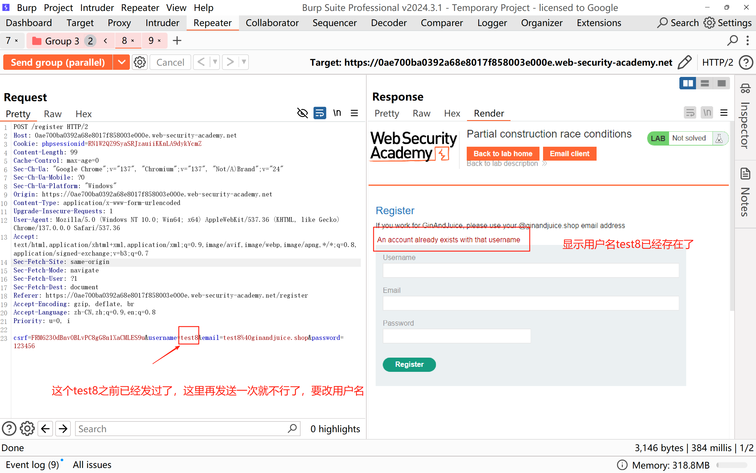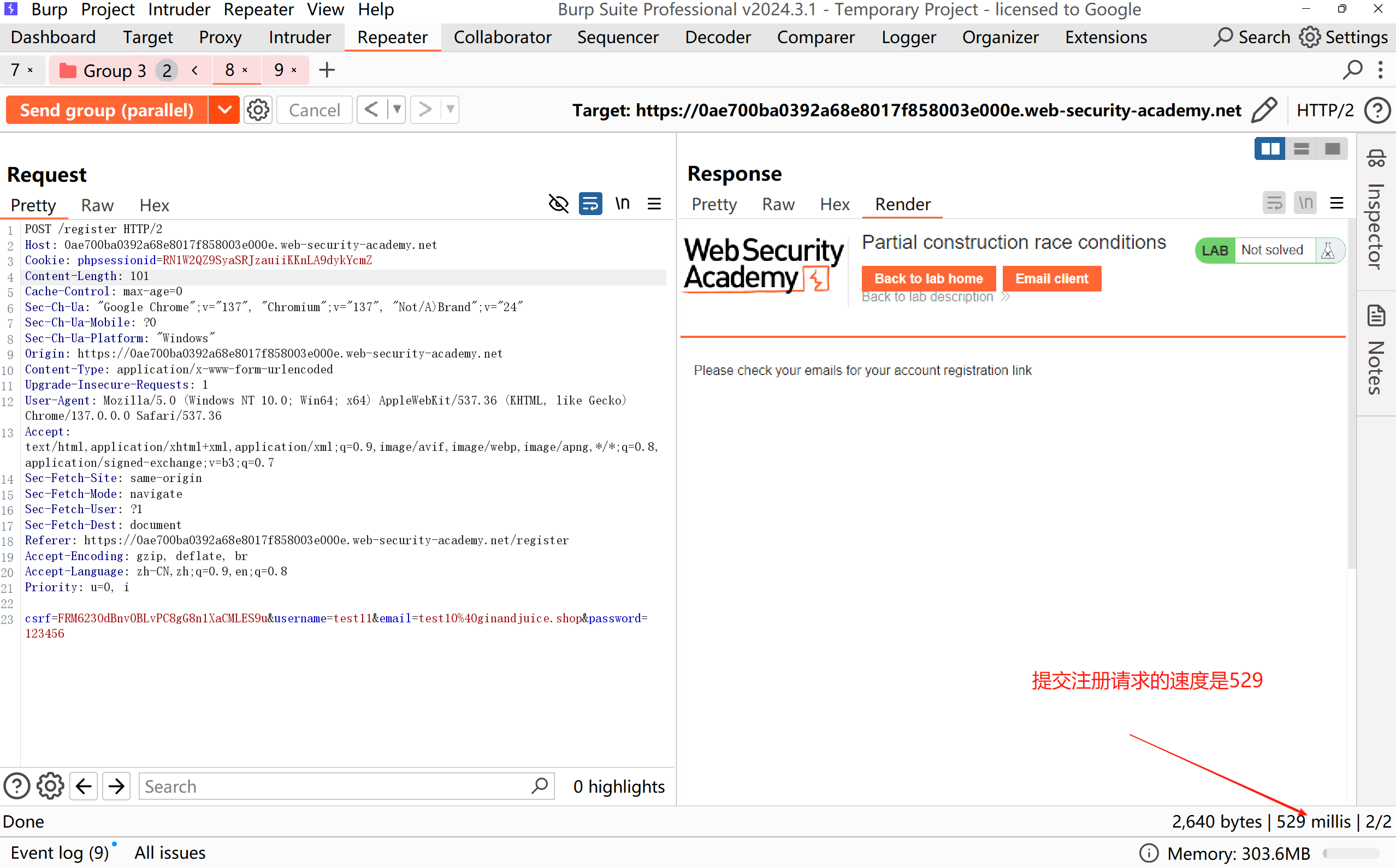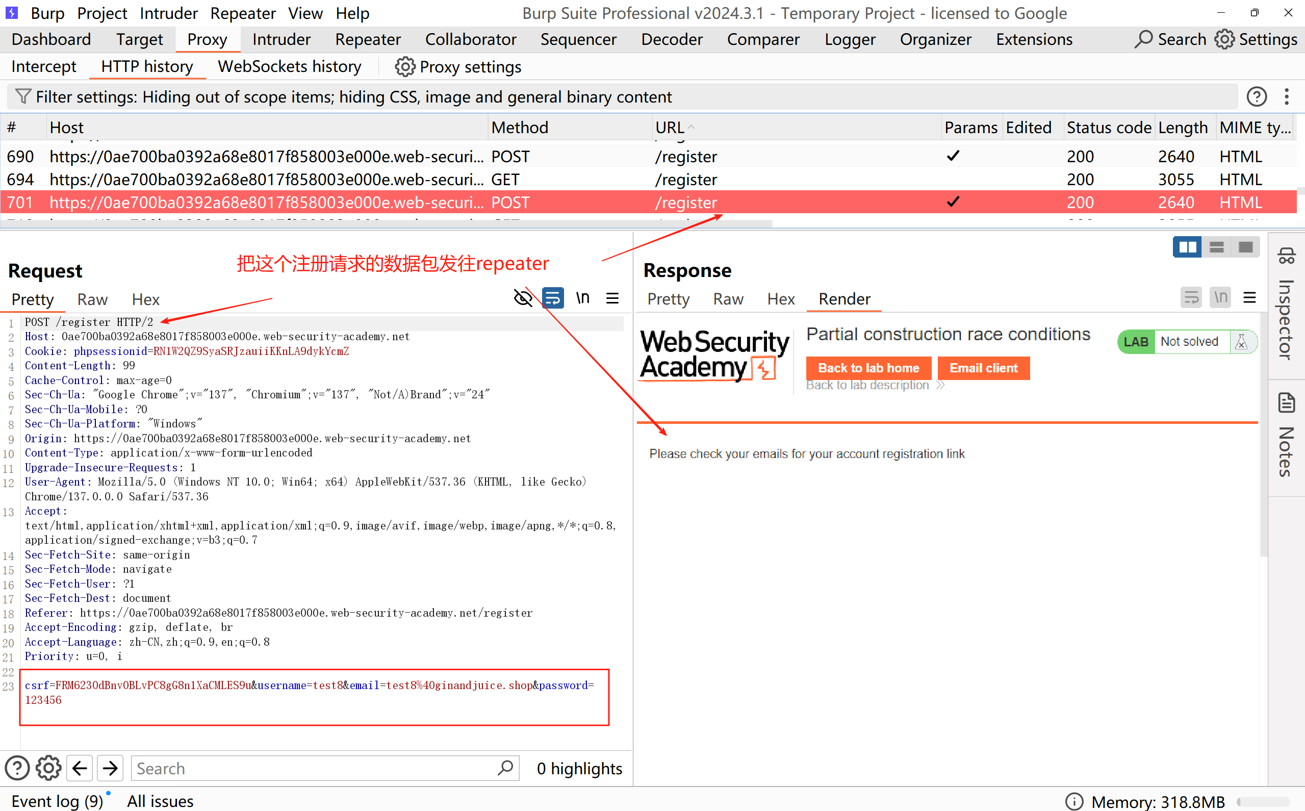 先将 POST /register 请求发送到 Burp Repeater