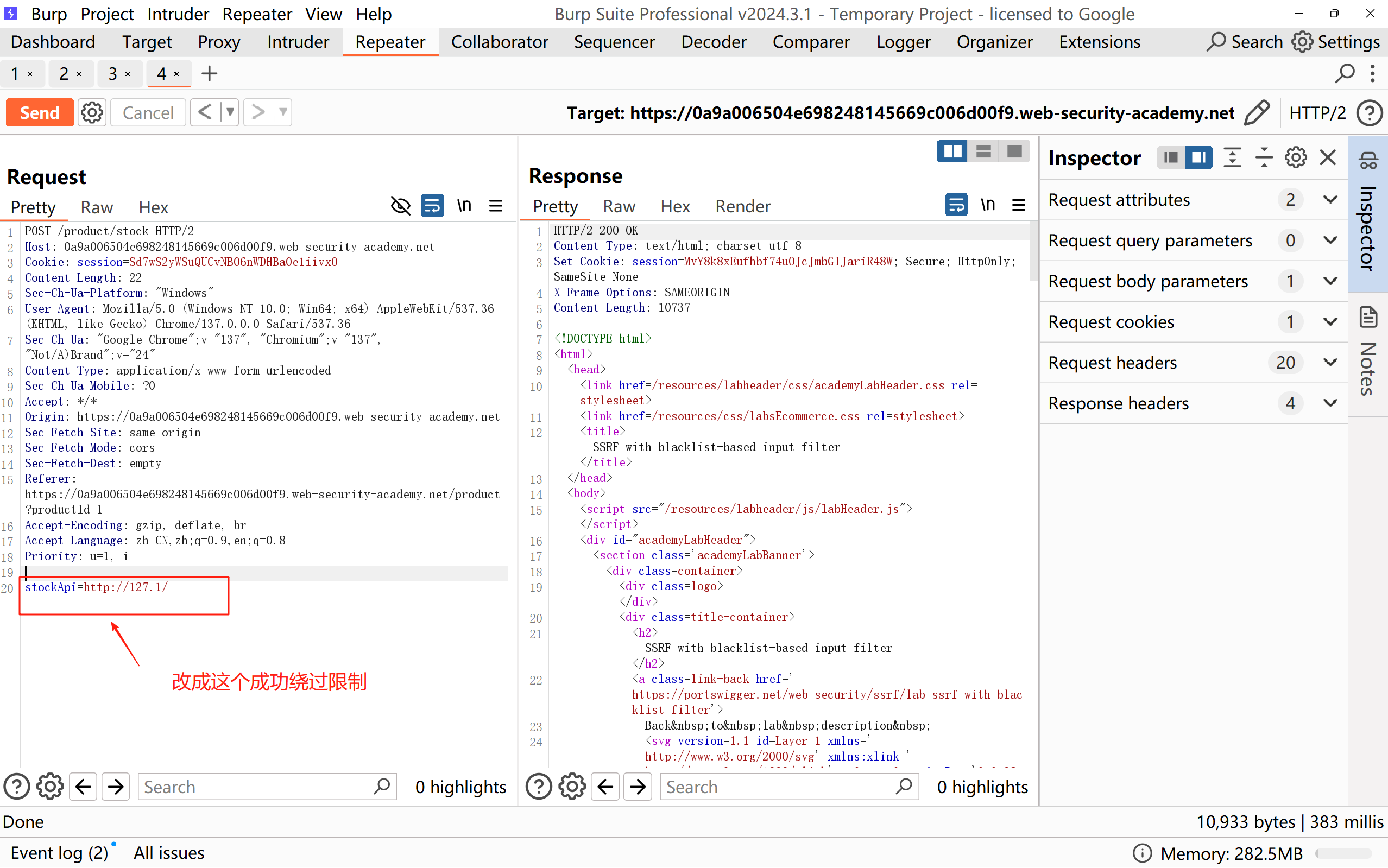 3、改成:stockApi=http://127.1/ 成功绕过常规黑名单过滤