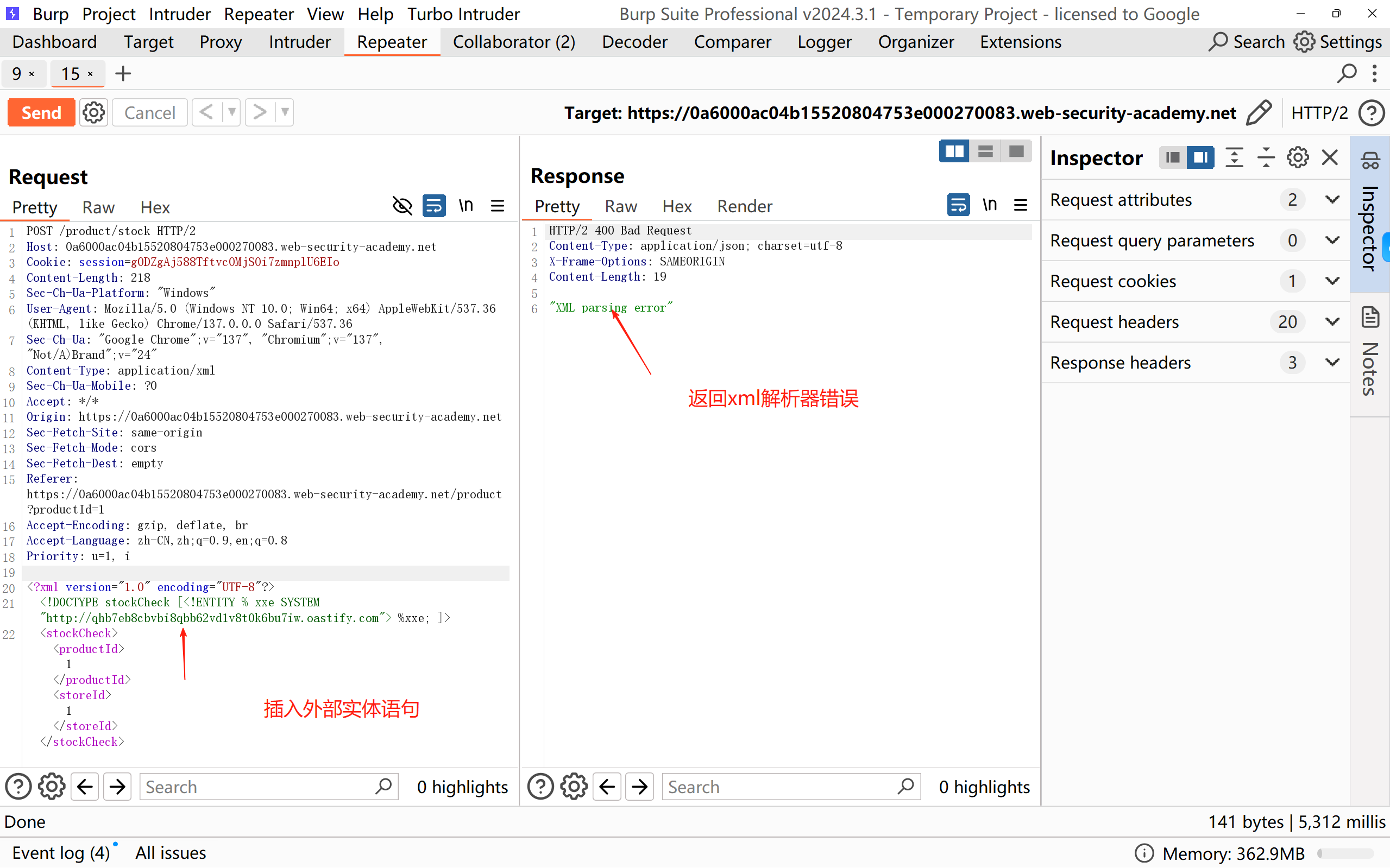 提示:1、靶场具有“检查库存”功能,可解析 XML 输入,但不显示任何意外值,并阻止包含常规外部实体的请求。