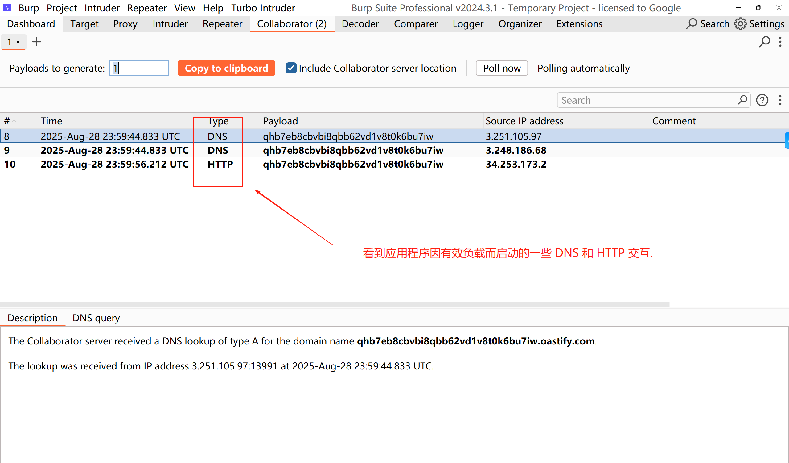 转到“协作者”选项卡,然后单击“Poll now”。如果您没有看到任何互动,请等待几秒钟,然后重试。您应该会看到应用程序因有效负载而启动的一些 DNS 和 HTTP 交互。